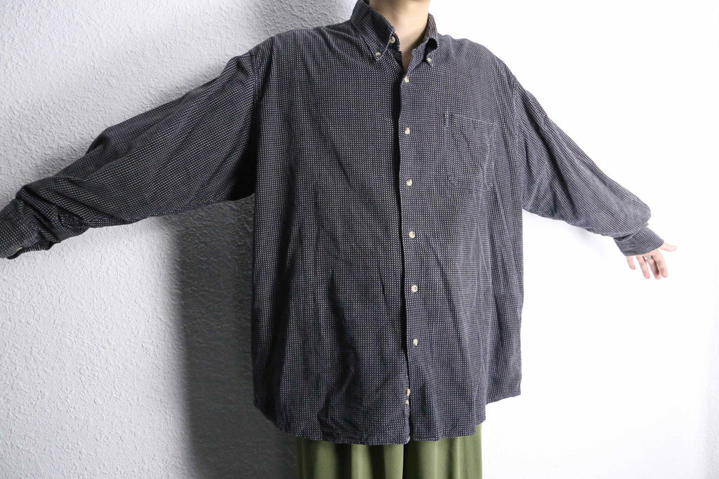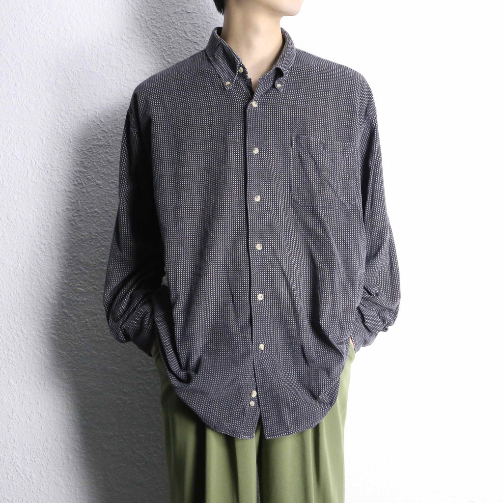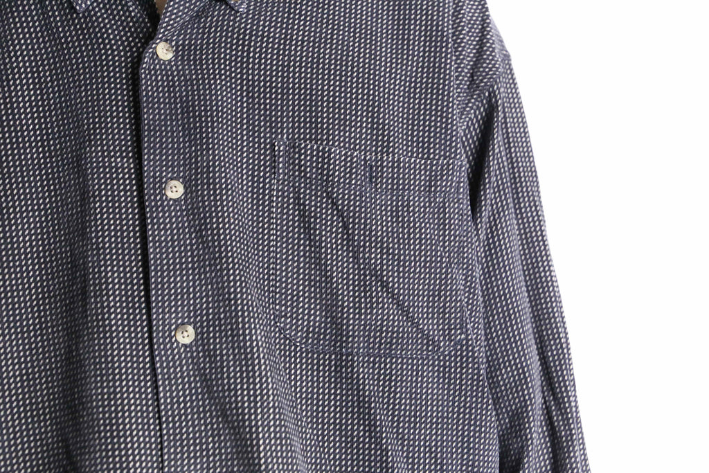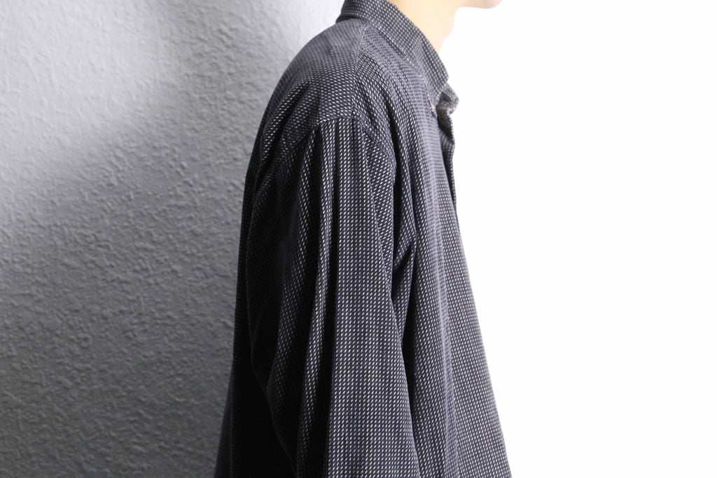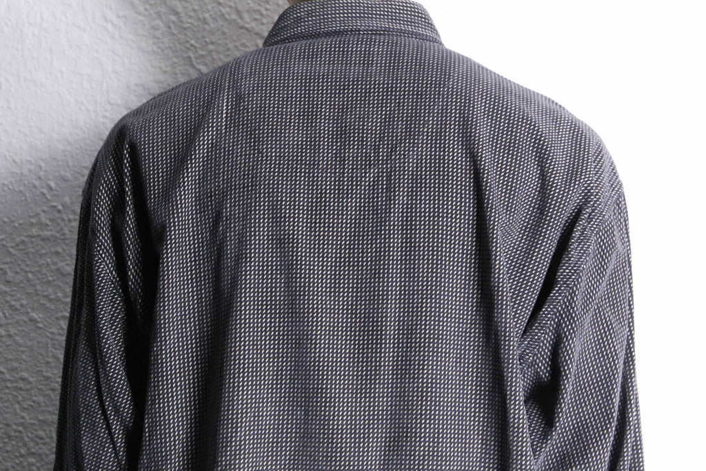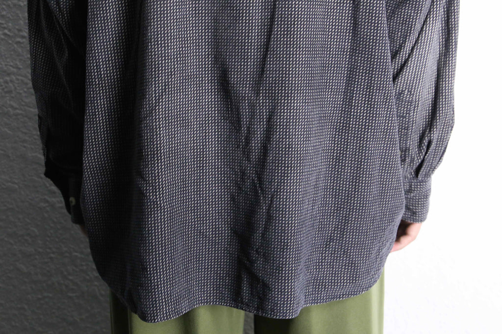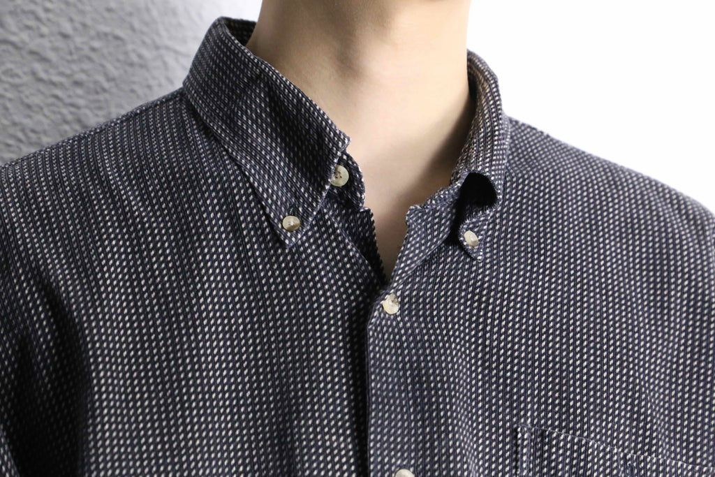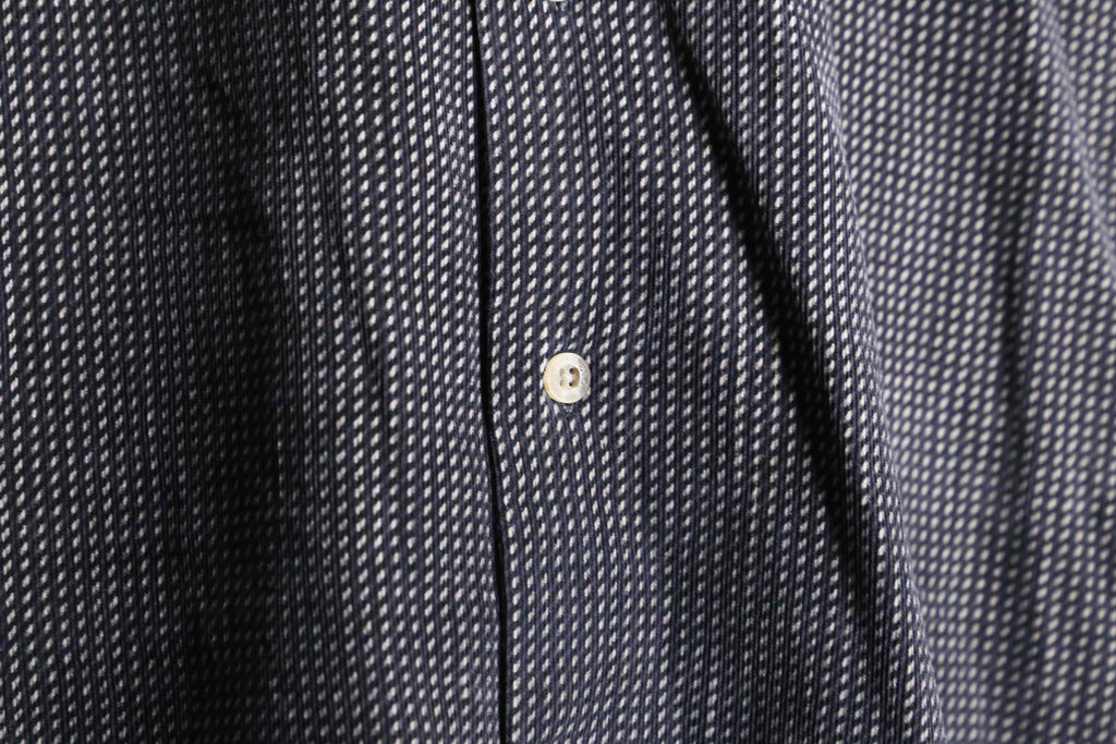 シャツという大きな括りの中でも、特に使い勝手の良いモノトーン配色。レジメンタルの様な総柄と細畝の効いたファブリックにより、意外なほど着やすさを感じられる1枚です。今っぽく太めのデニムと合わせても良し、当店らしいユーロスラックスと合わせて少し硬めに仕上げても良し。そんな汎用性の高さも魅力のひとつです。