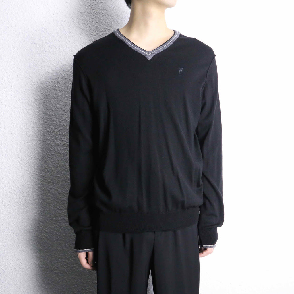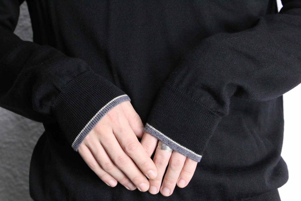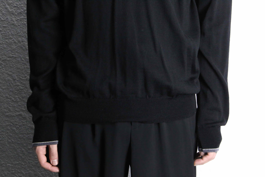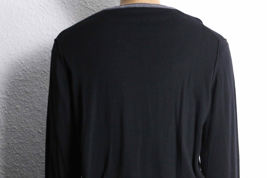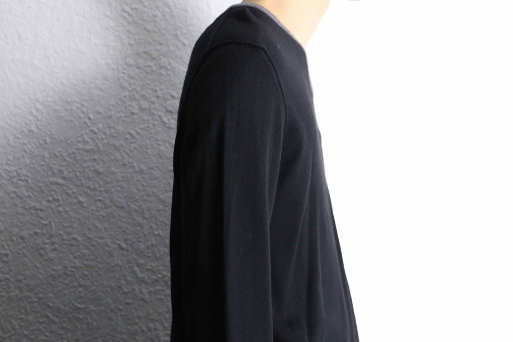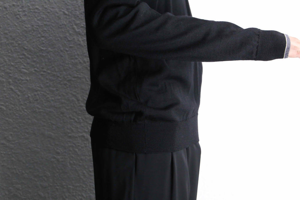 メインラインと比べ少しカジュアルにも振りやすい浅めVネック仕様のディテール。今時期であればレイヤード要員へと、春頃は1枚で着ても素敵です。