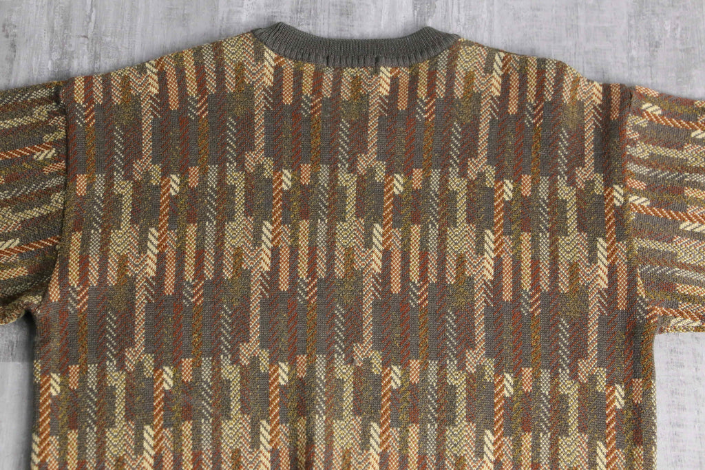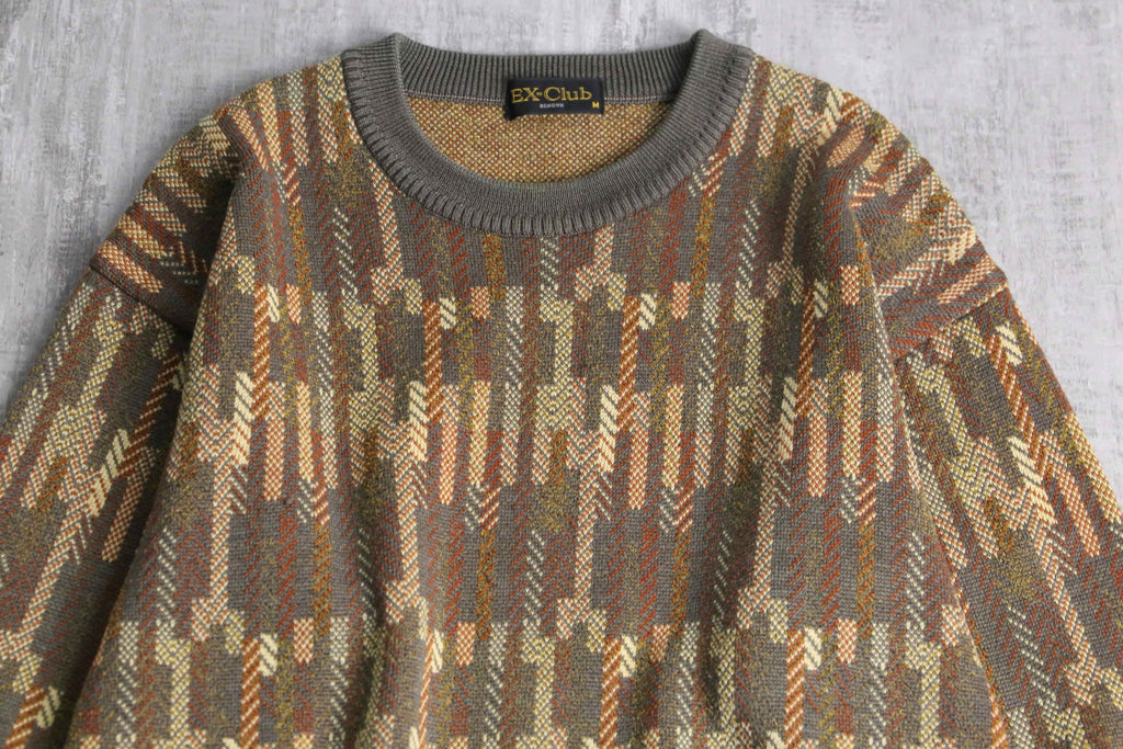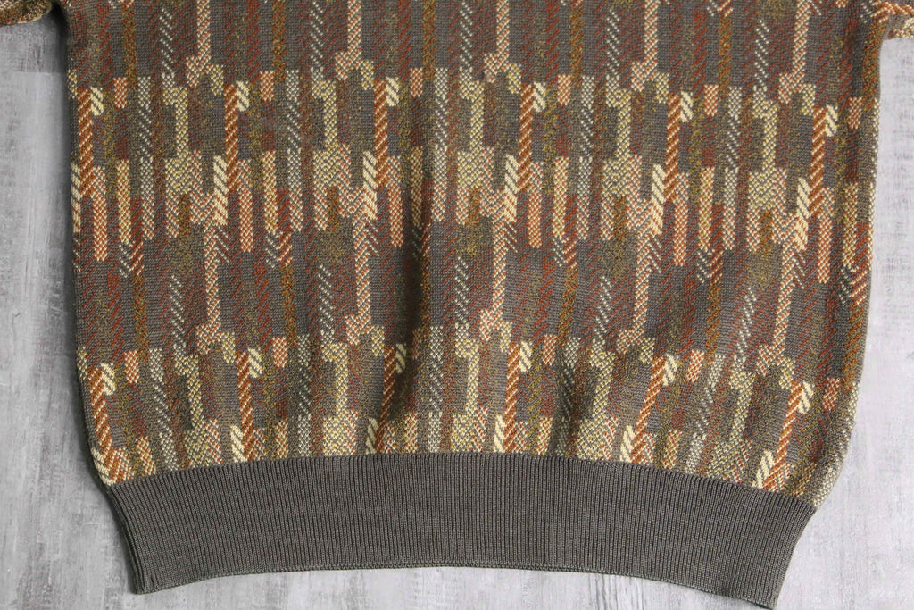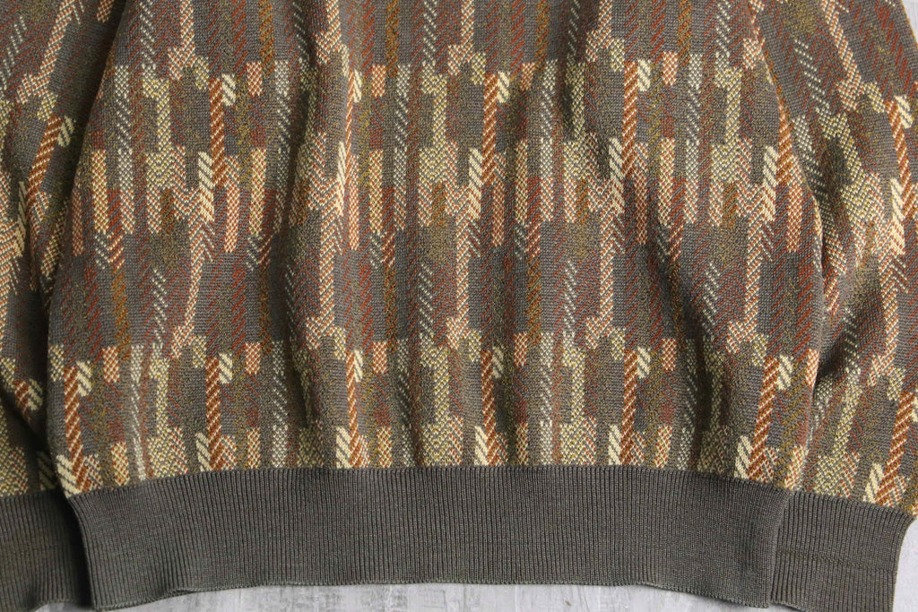 軽やかながらももっちりとした生地感に幾何学的な柄合いが可愛らしい1着。サイズ表記Mながらもゆったりとした身幅、肩幅。ですが、着丈はそこまで長くなくレイヤードと言うよりかは1枚で着るのに最適かと。この時期重宝する総柄ニットをこの機会に。