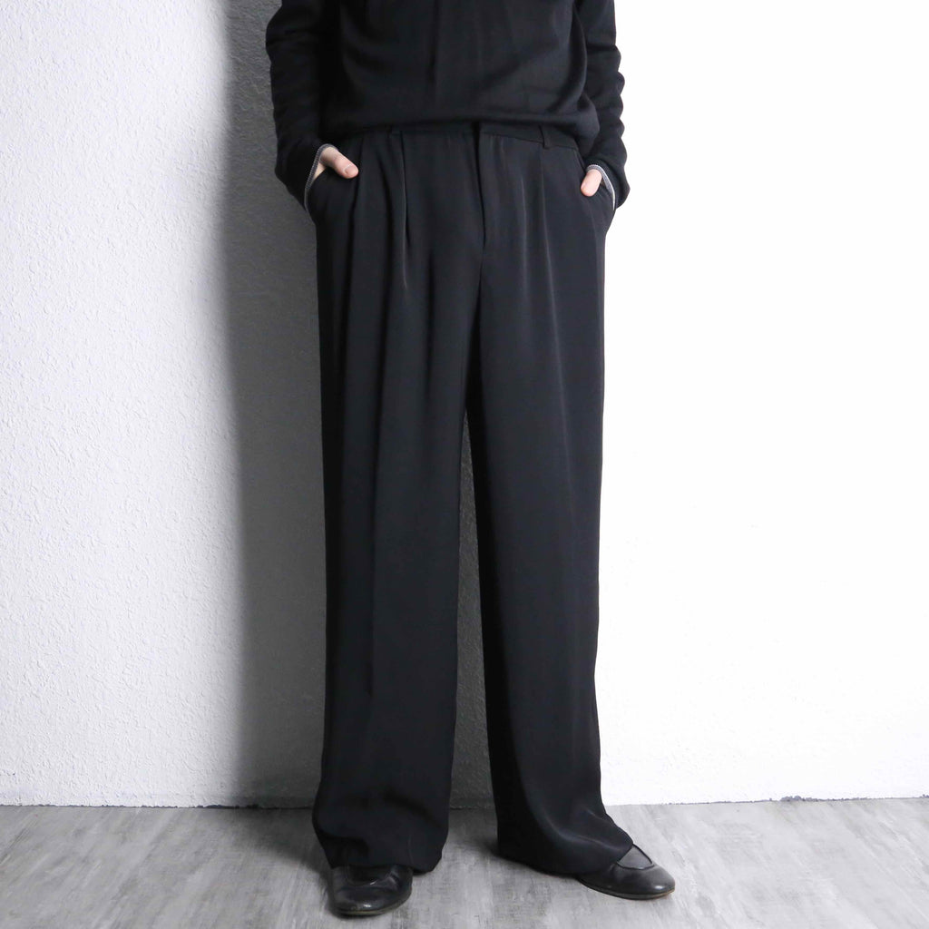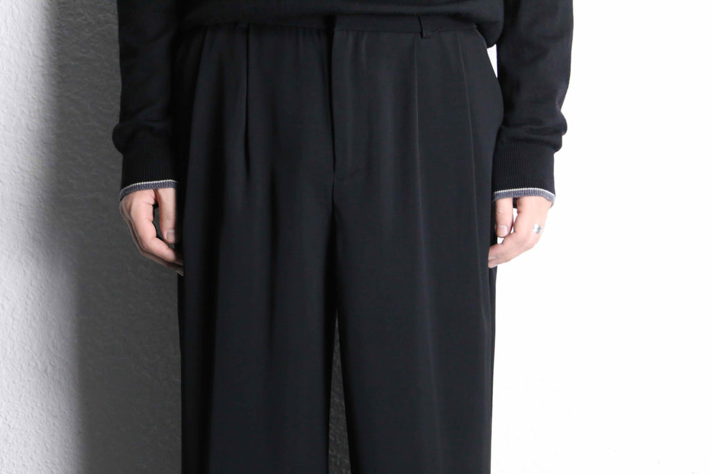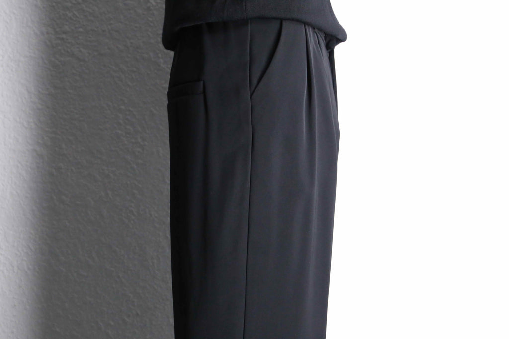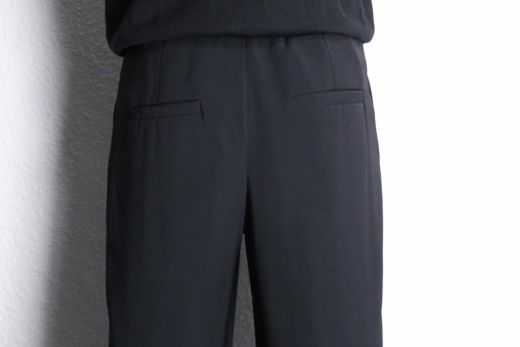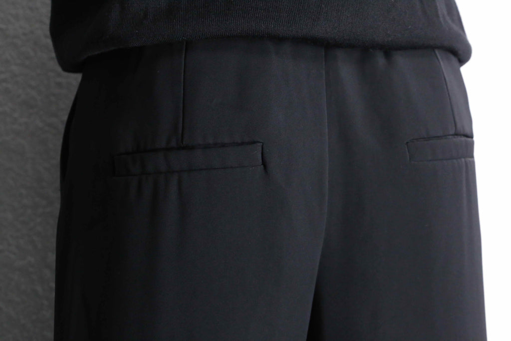 黒単色の綾織で仕上げたシンプルな一本。ウエストはゴム仕様で機能性がありながらも、ツータックの必要不可欠な部分はしっかりと。厚すぎず柔らかな生地感で、ほどよくカジュアルに着用いただけます。