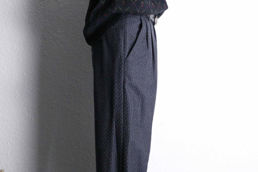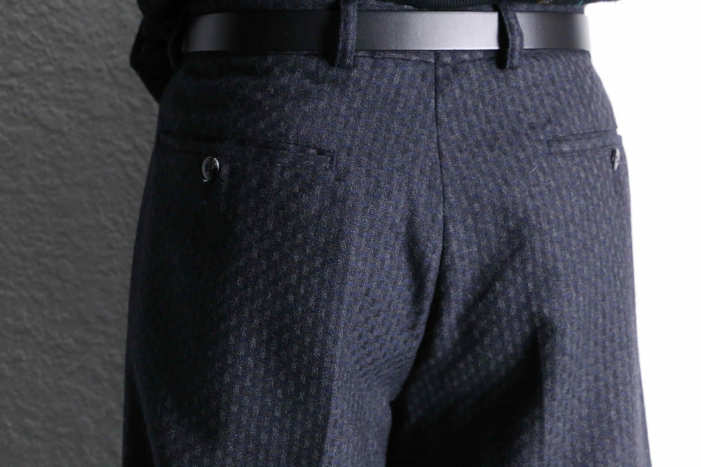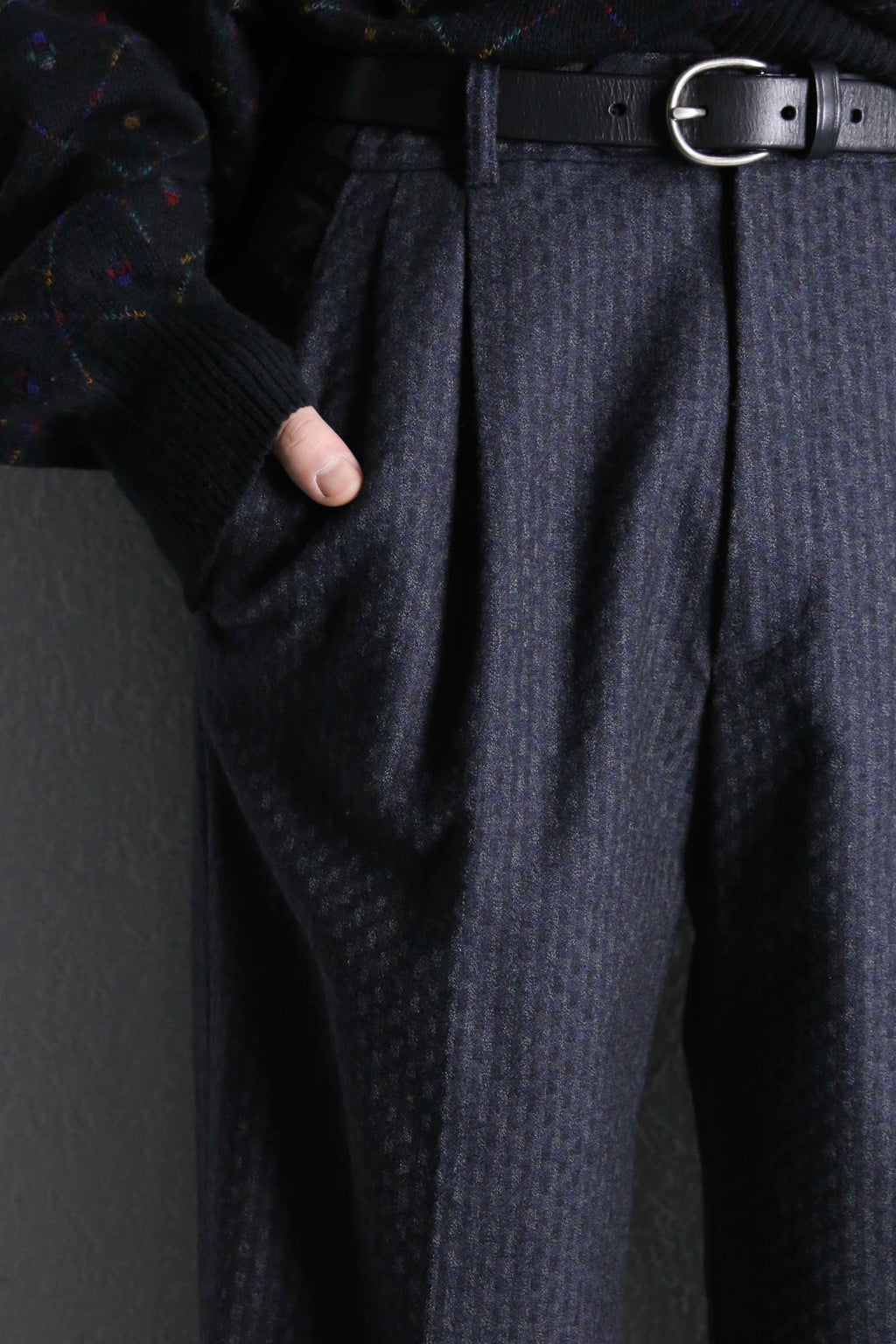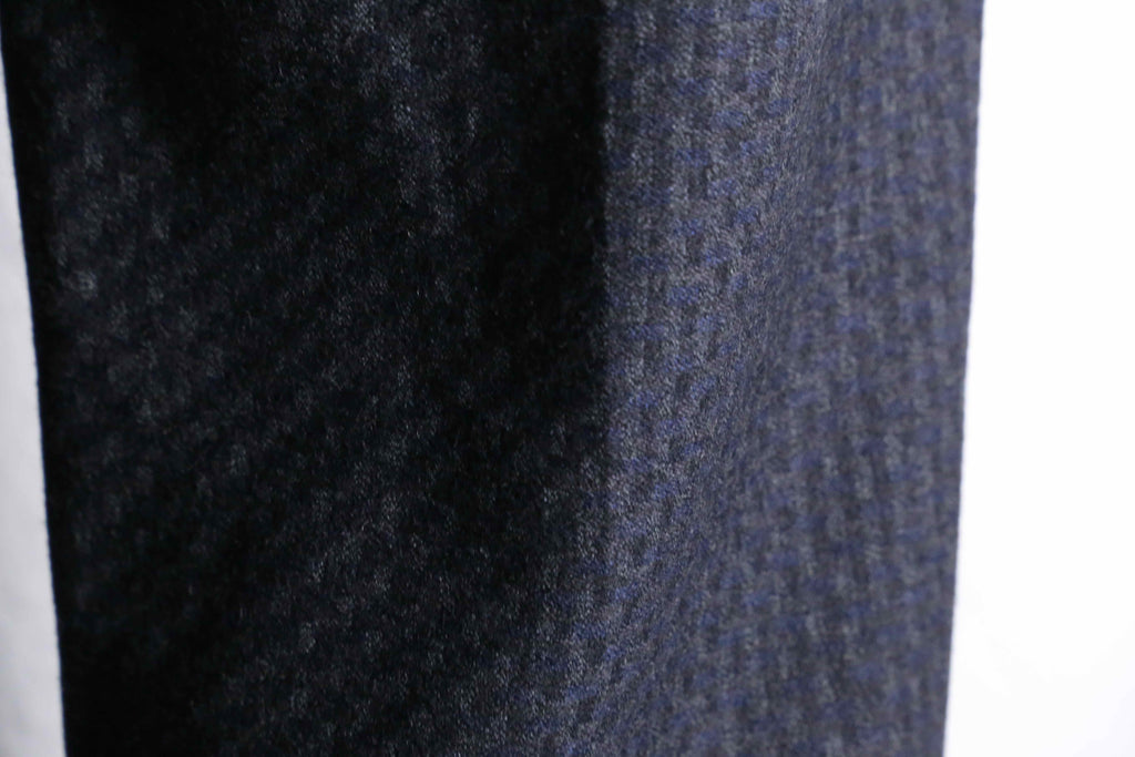 グレーにヴァーガンディーとネイビーを織り込んだ塩梅のいい3色混ウールによる総柄仕立て。生地質の問題でしょうか、ツイルでは無いというのに現れる鈍い光沢も実に美しいです。