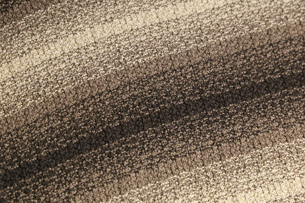 淡く滲むようなボーダーにごく浅いVネックのデザイン。インナーとしても収まりがよく、スタイリングに馴染みやすい1枚です。