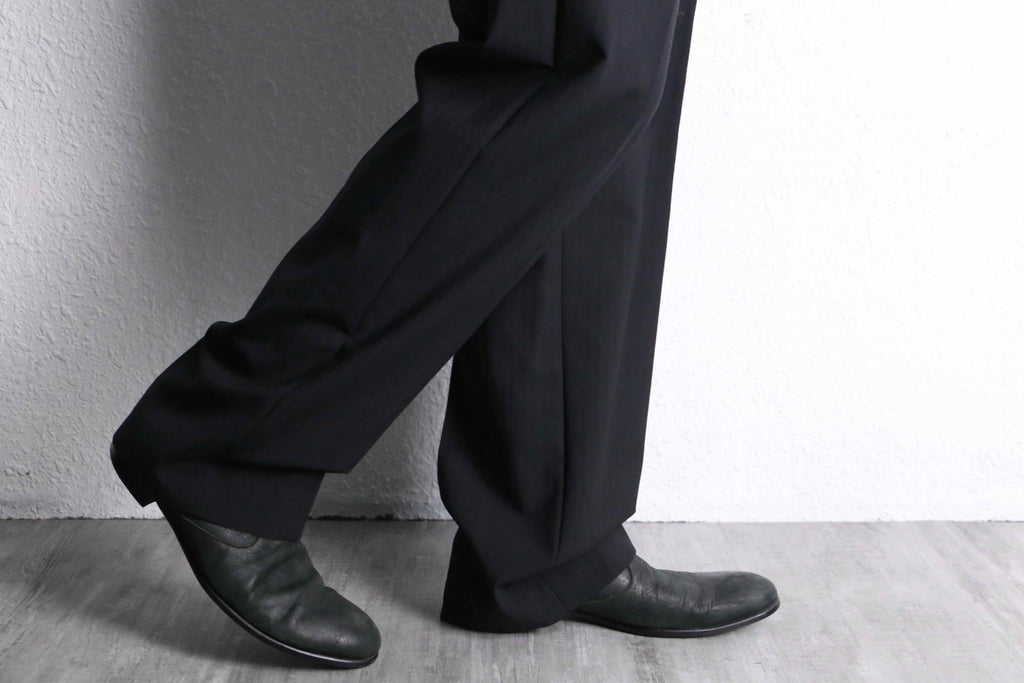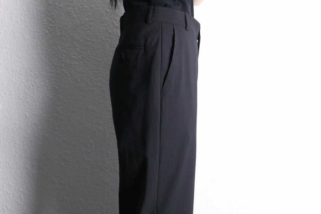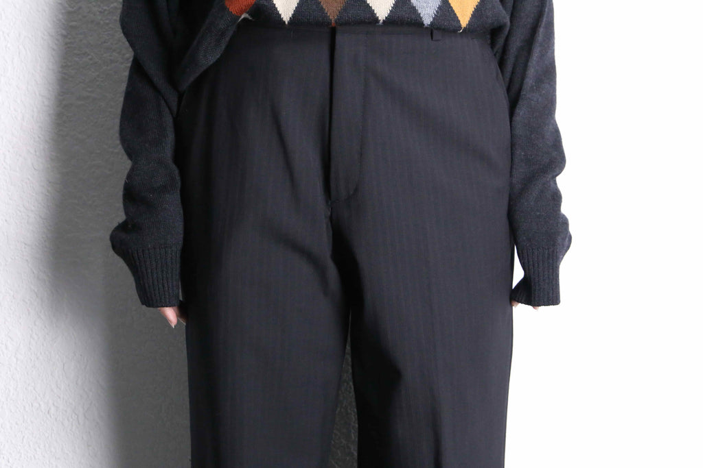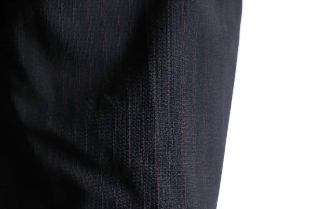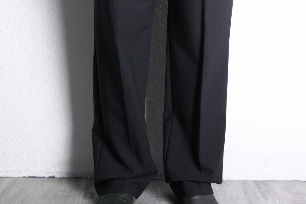 黒地に2本のピンストライプによるデザイン。形はユーロらしい王道のワイドテーパードシルエット。