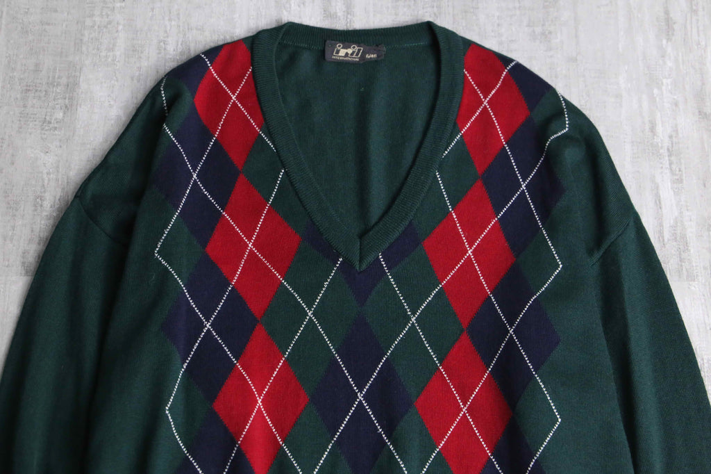 素材の混紡は分かりかねますが、恐らくウール主体にアクリル混と思われる、柔らかく薄い生地のアーガイルチェックニットが入荷です。