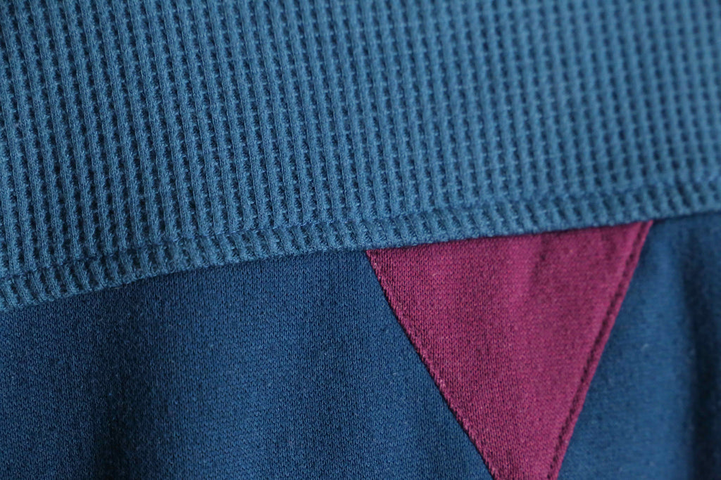 片面はポリエステル×コットンの混紡素材で、ワッフル・スウェット・ジャージという異なる生地を切り替えて構成した意匠的なデザイン。色味もパーツごとに変えており、ボディはもちろん、ネックやポケットフラップにまで切り替えを施す細やかな作り込みが素敵です。