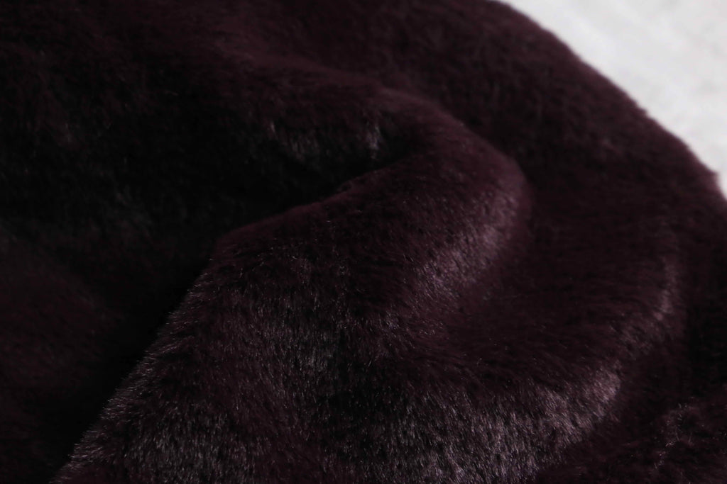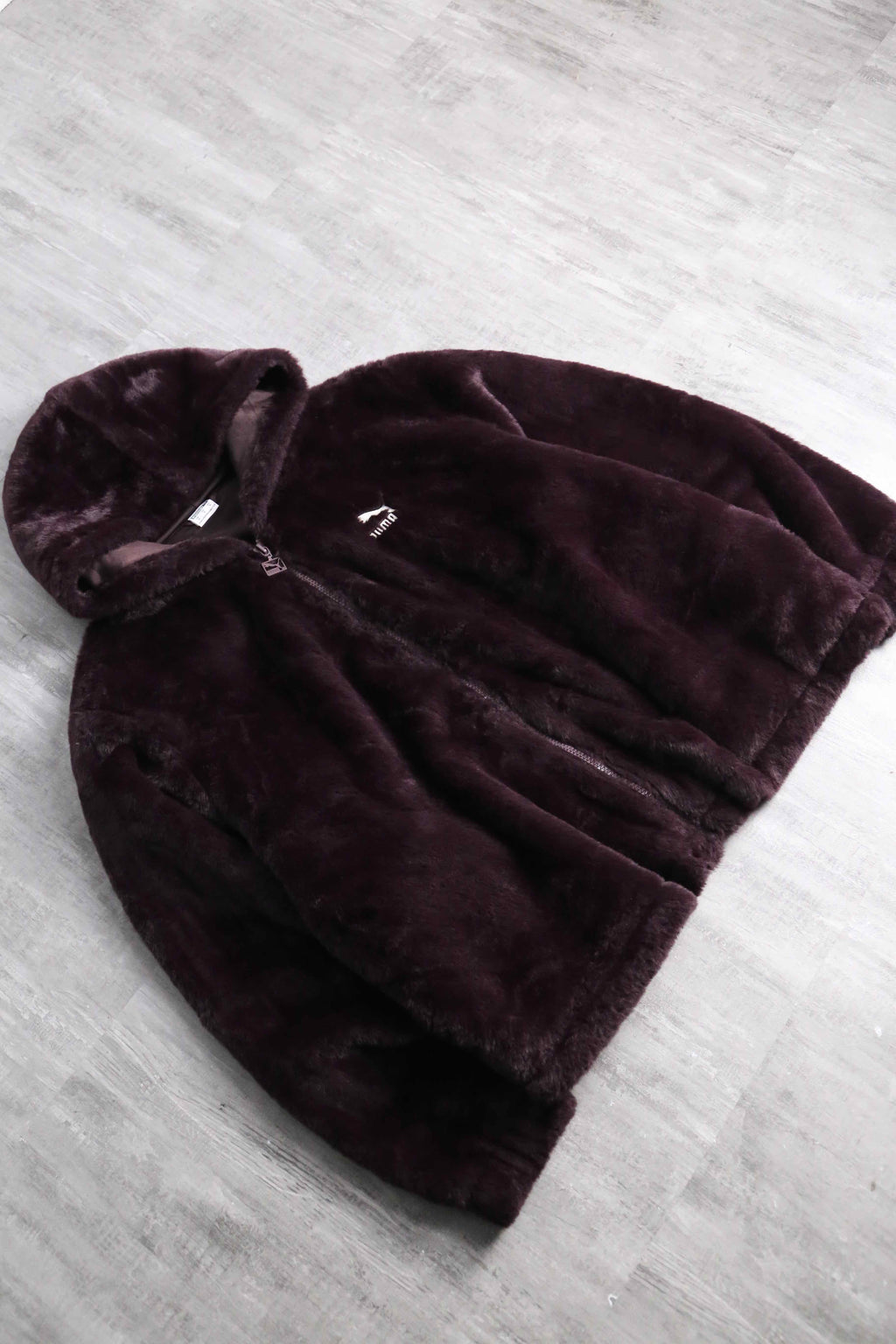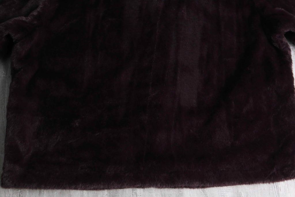 ヴァイオレットカラー単色というアウターには珍しい色合いでの毛足の整った肌心地良いシンセティックファー。着丈短くリブは緩め、フードは大判で目につくのはワンポイントロゴのみの色で勝負した存外なシンプルウェア。