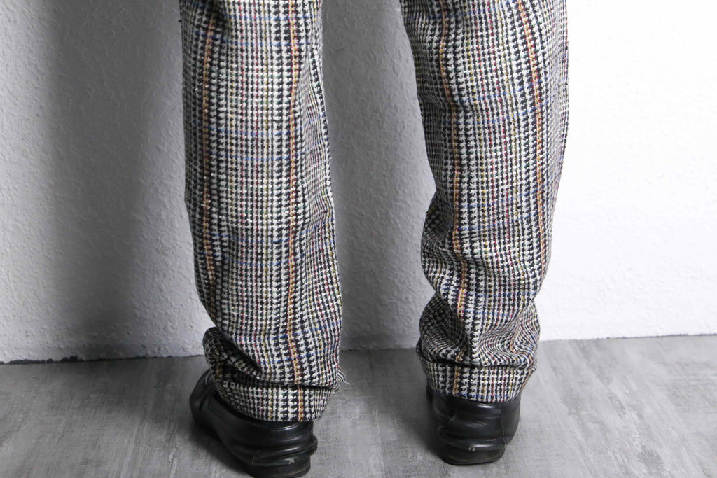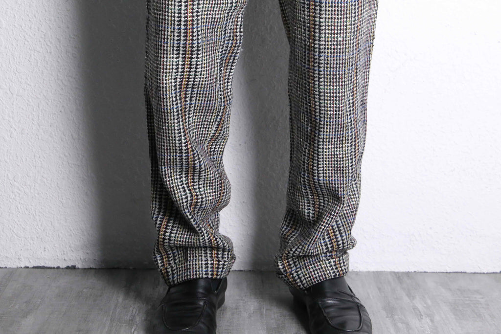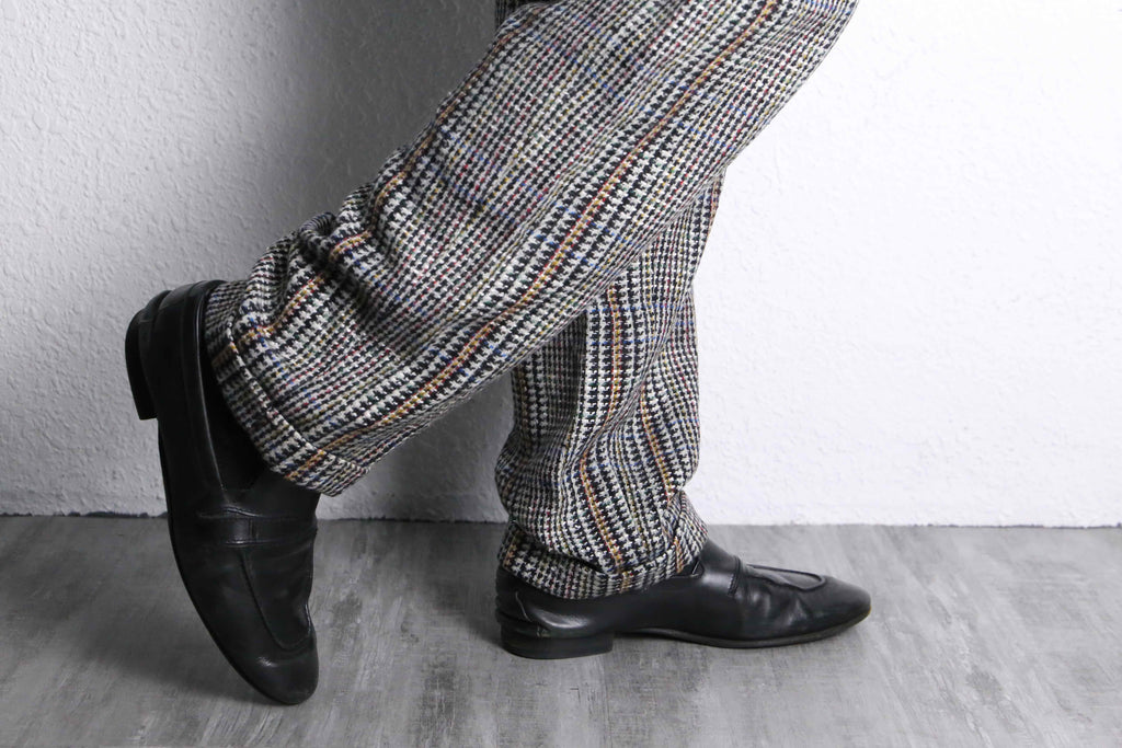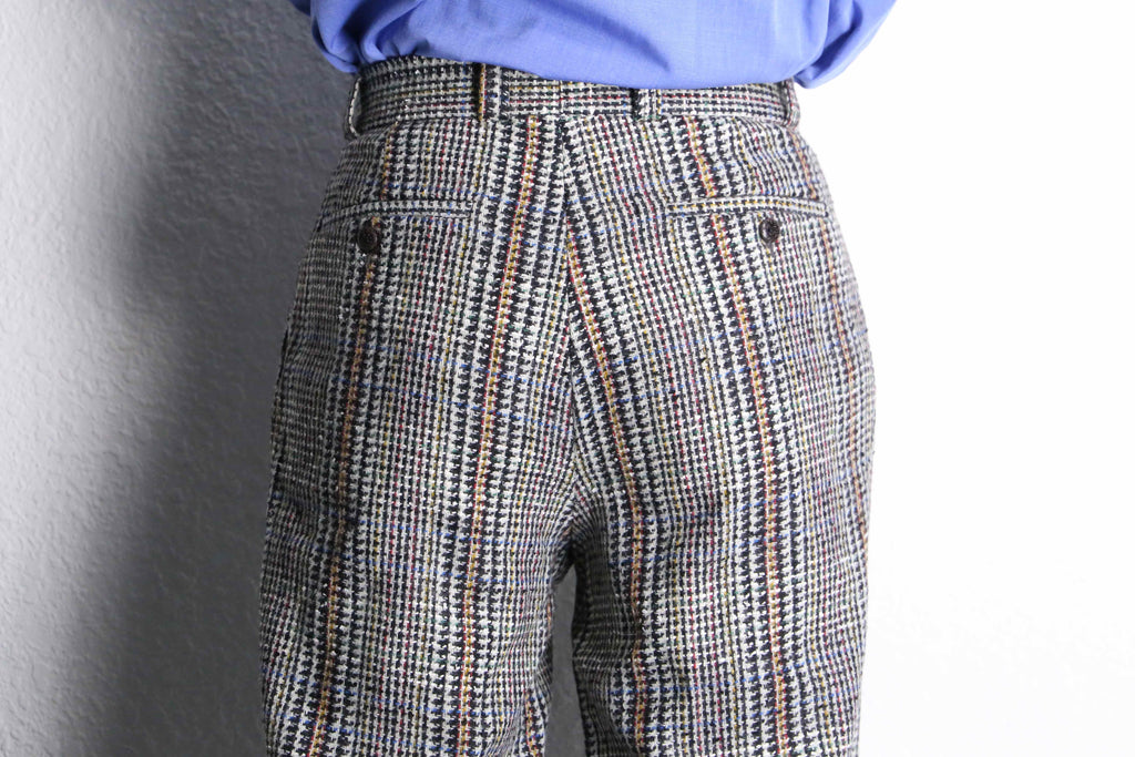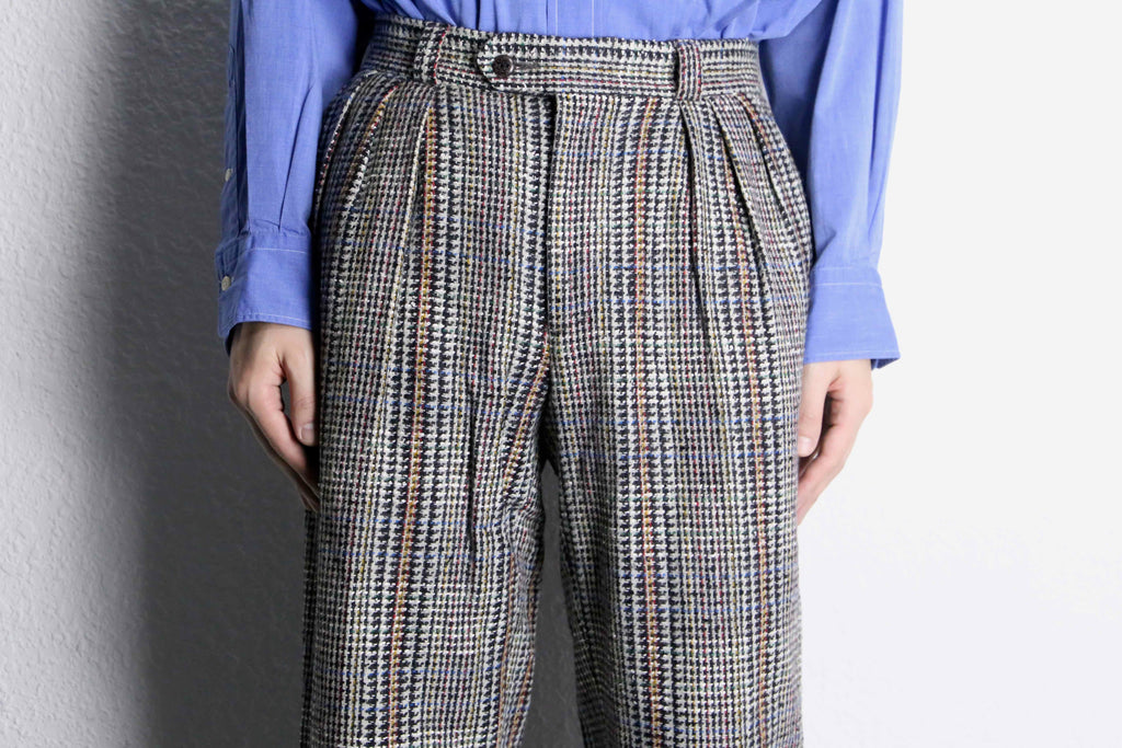細密な千鳥柄をベースに、赤・黄・青の多色糸を織り込むことで深みのある表情を持たせたツイードスラックス。柄物ながら落ち着いたスタイリングにも自然と馴染む上品な存在感です。