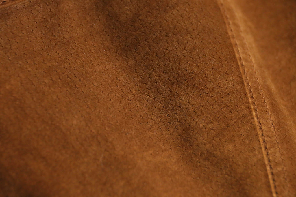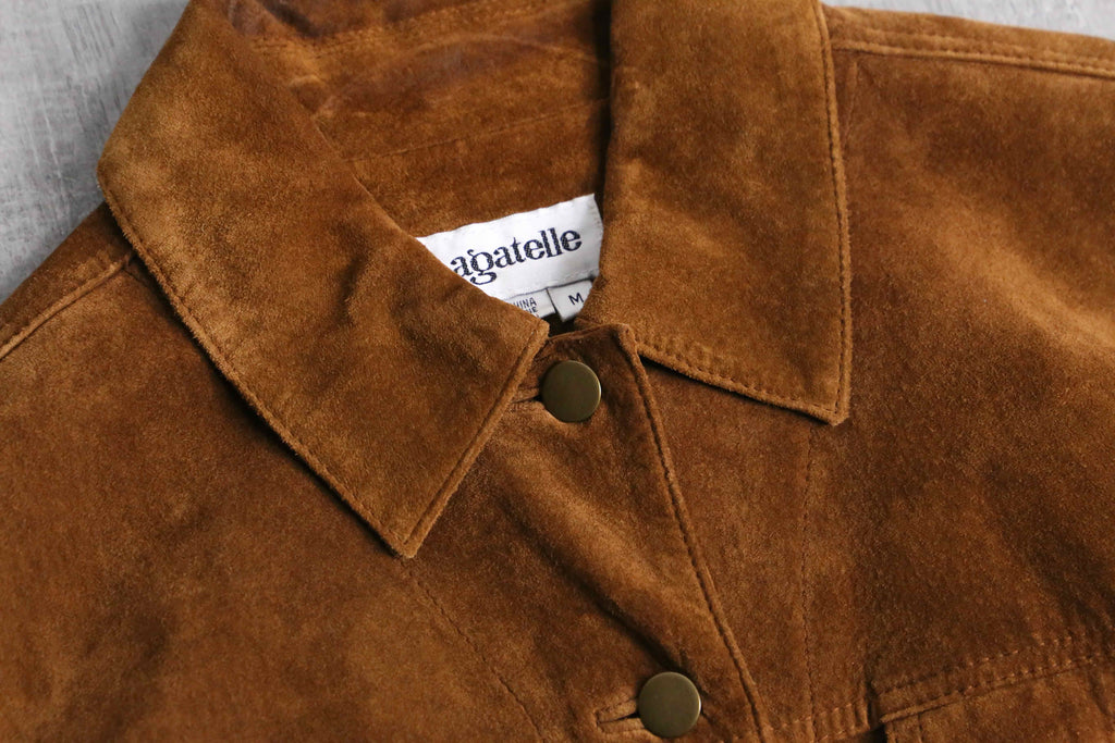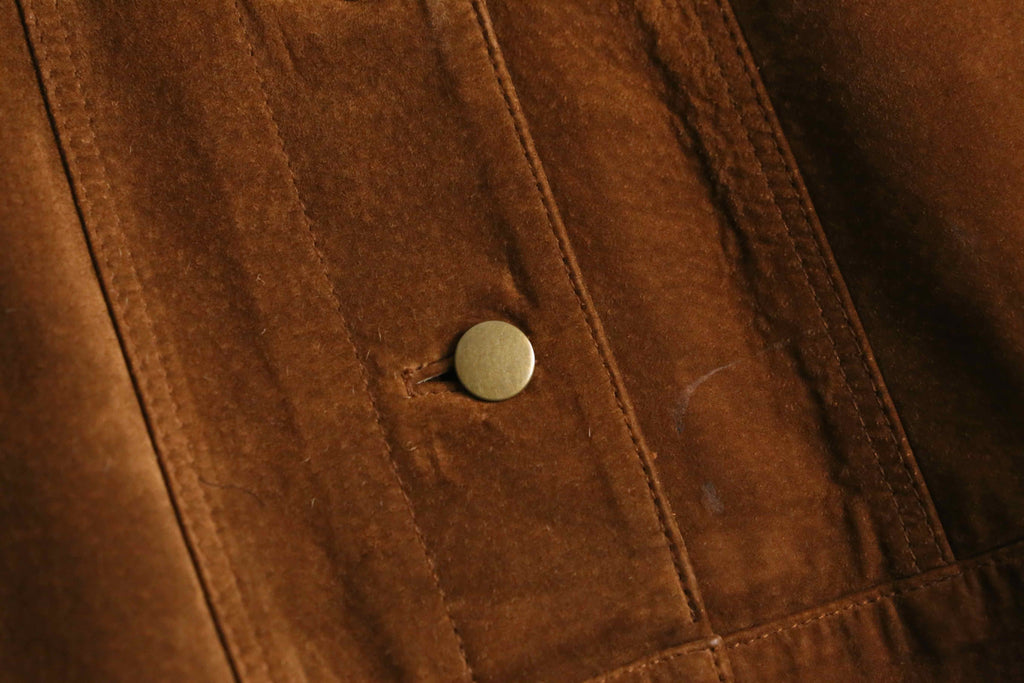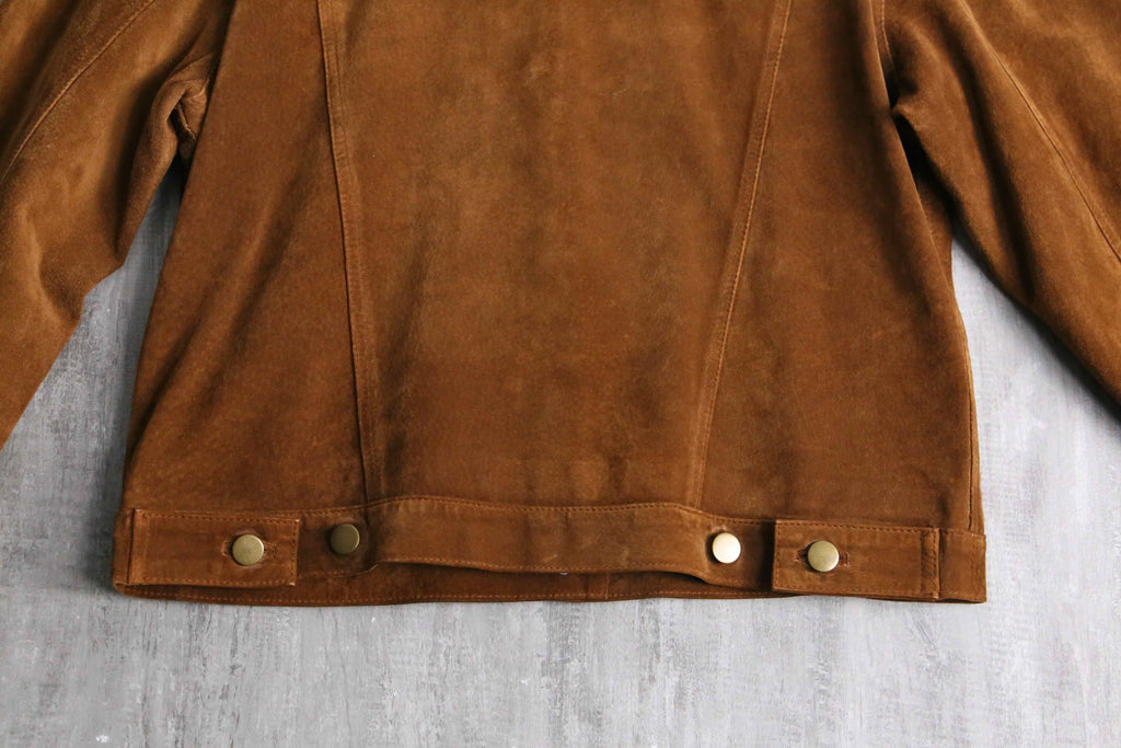 リアルスエードを贅沢に用いたトラッカージャケット。スエード特有の鈍い光沢と柔らかな起毛感が際立ち、シンプルなトラッカー型ながら素材の存在感で奥行きのある表情に仕上がっています。