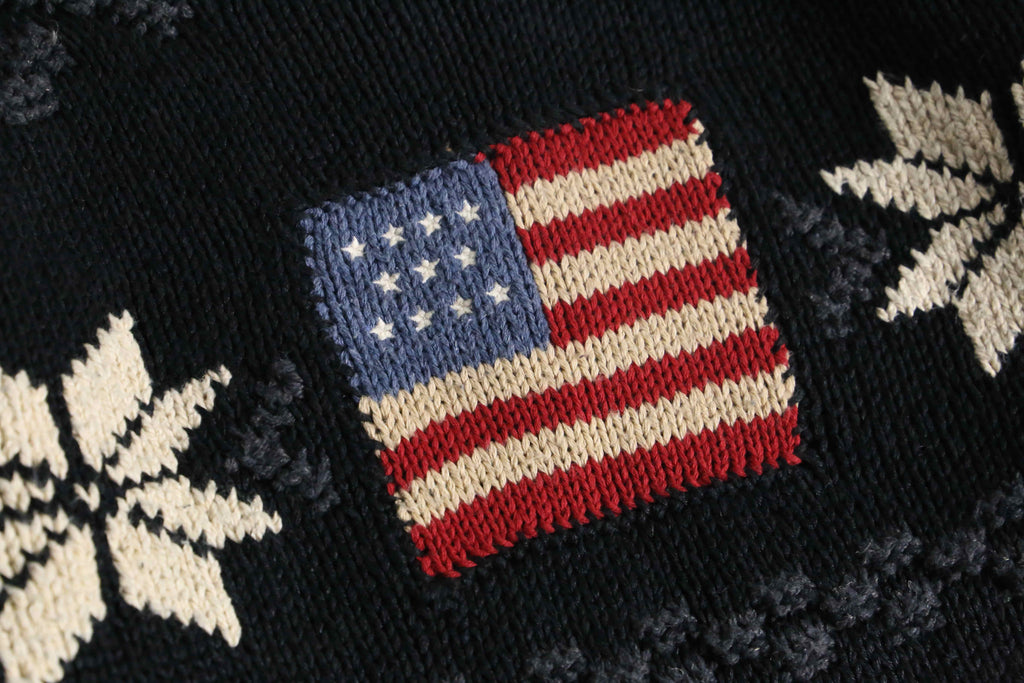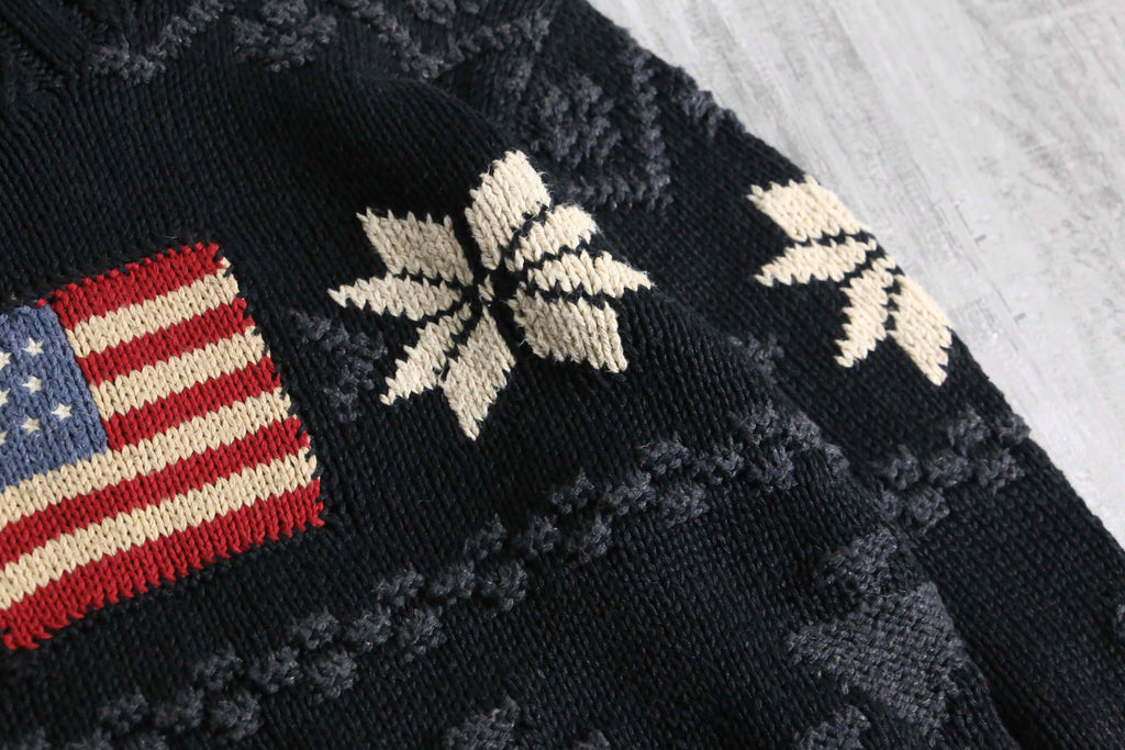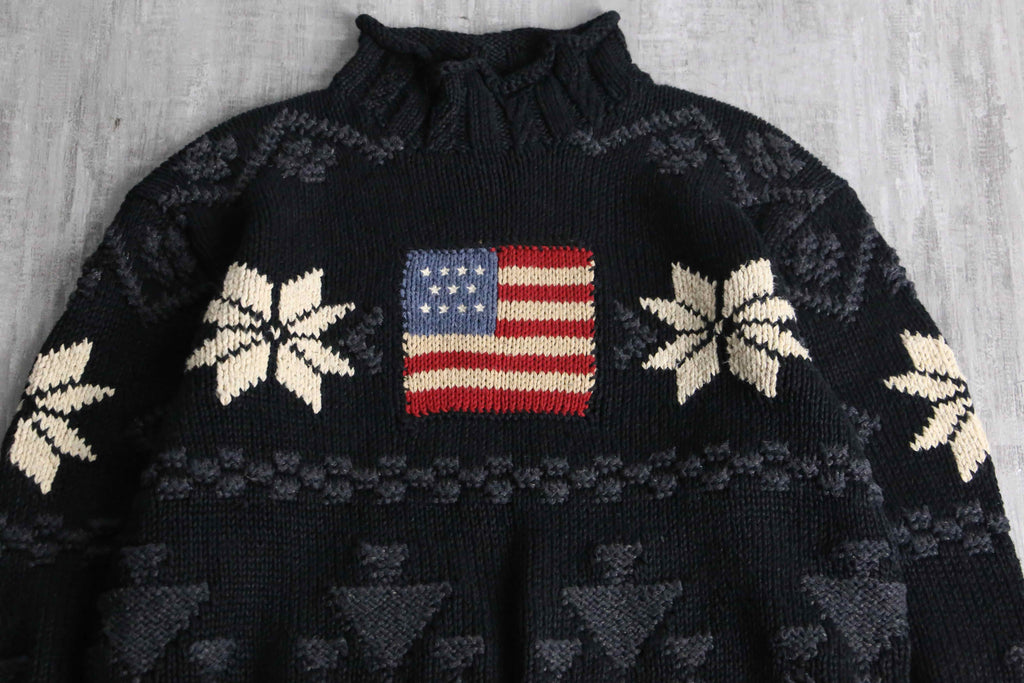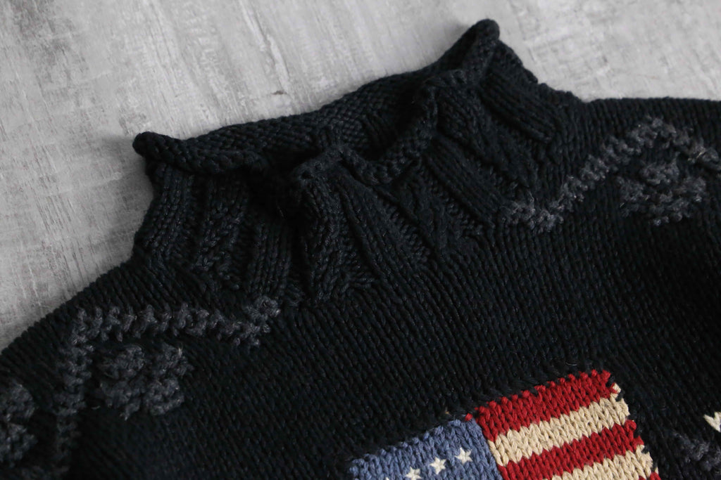 首元はモックネックほどの高さがあるロールネック仕様で、締め付け感がなく自然に立ち上がるバランスの良いデザインです。フロントには星条旗モチーフ、全体にはノルディック調の柄が配されており、存在感はありつつも落ち着いた配色でスタイリングに取り入れやすい一枚。