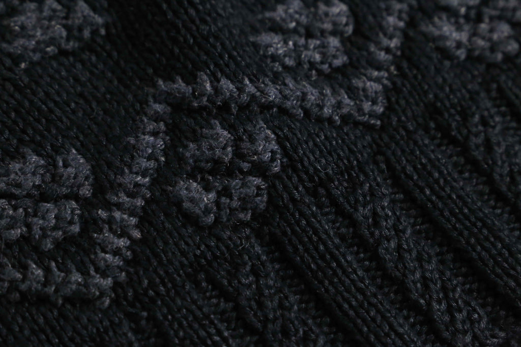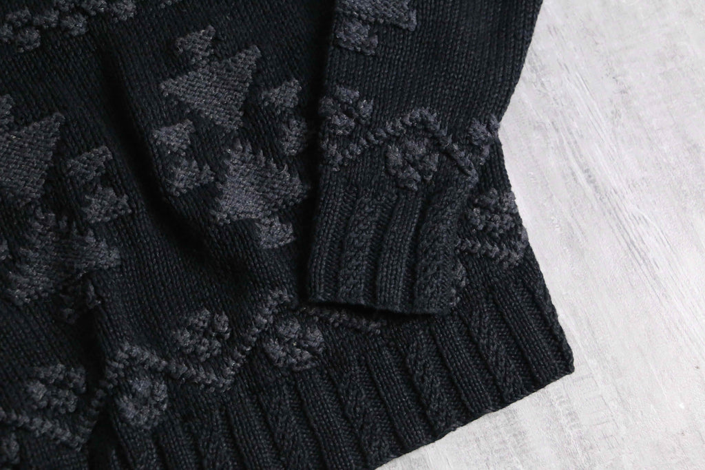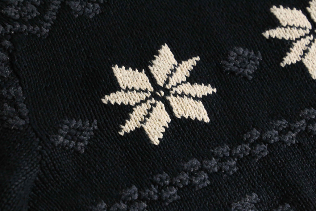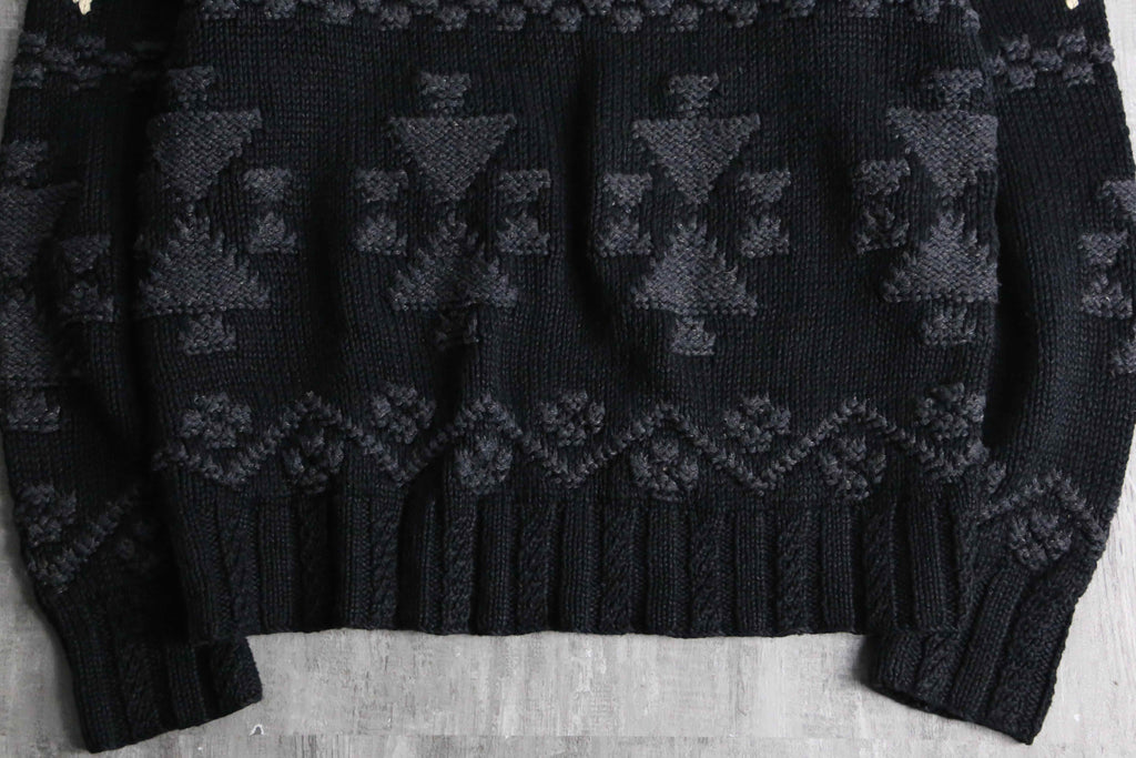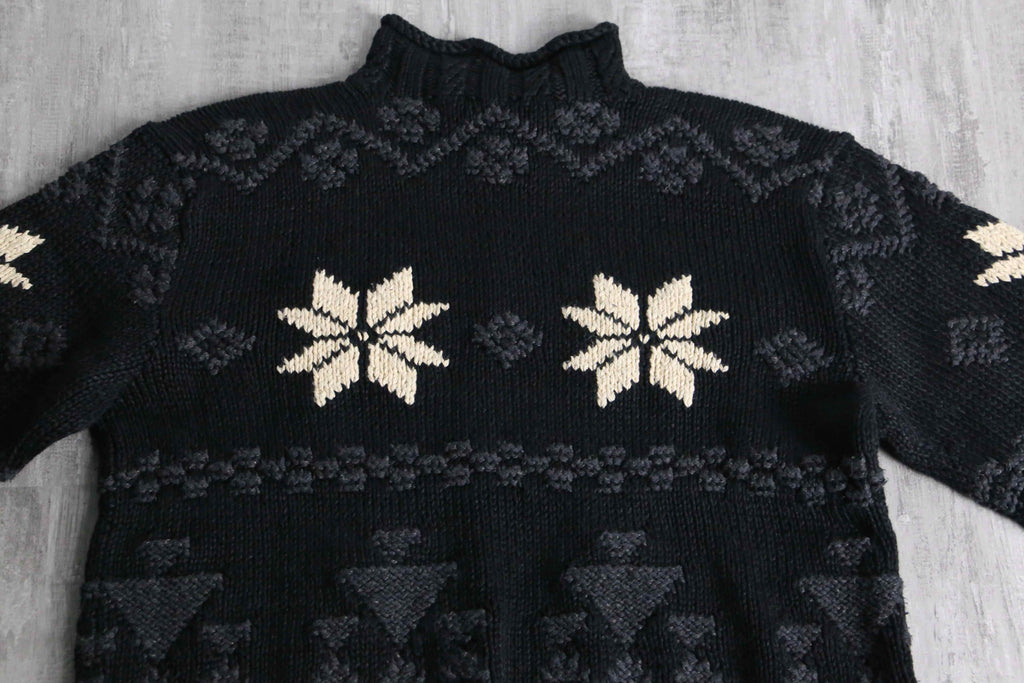 首元はモックネックほどの高さがあるロールネック仕様で、締め付け感がなく自然に立ち上がるバランスの良いデザインです。フロントには星条旗モチーフ、全体にはノルディック調の柄が配されており、存在感はありつつも落ち着いた配色でスタイリングに取り入れやすい一枚。