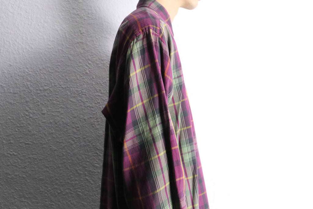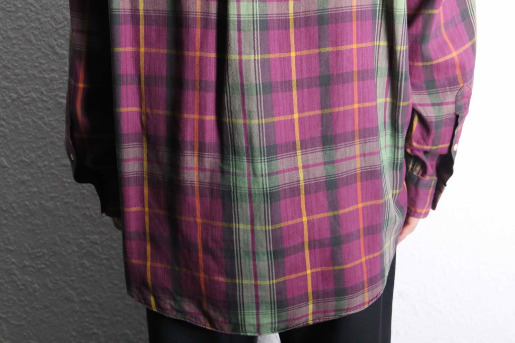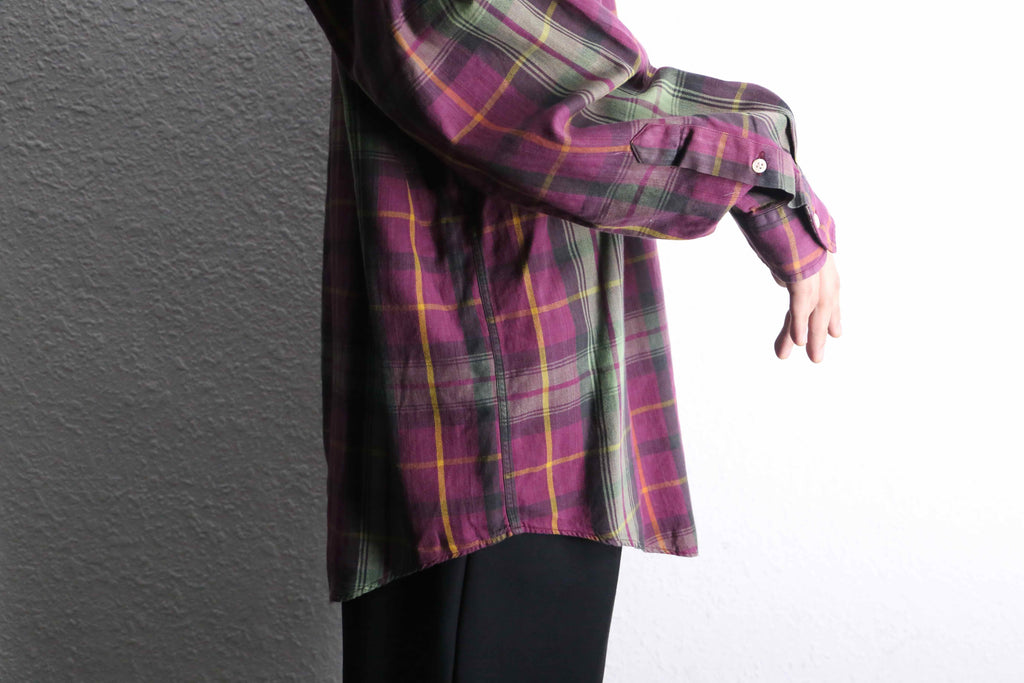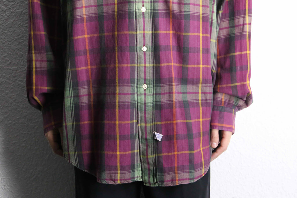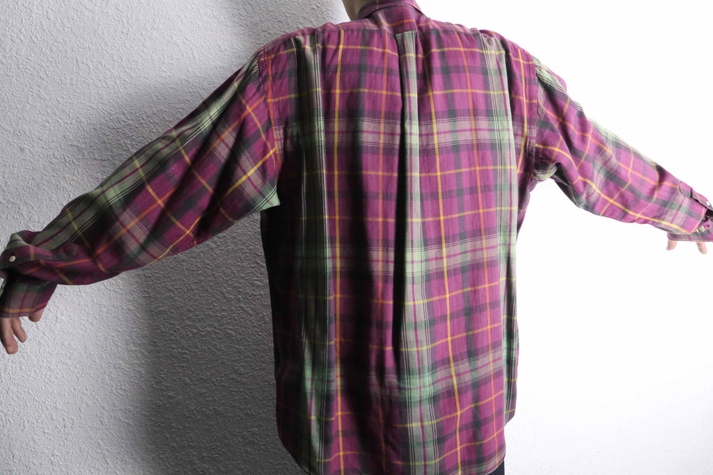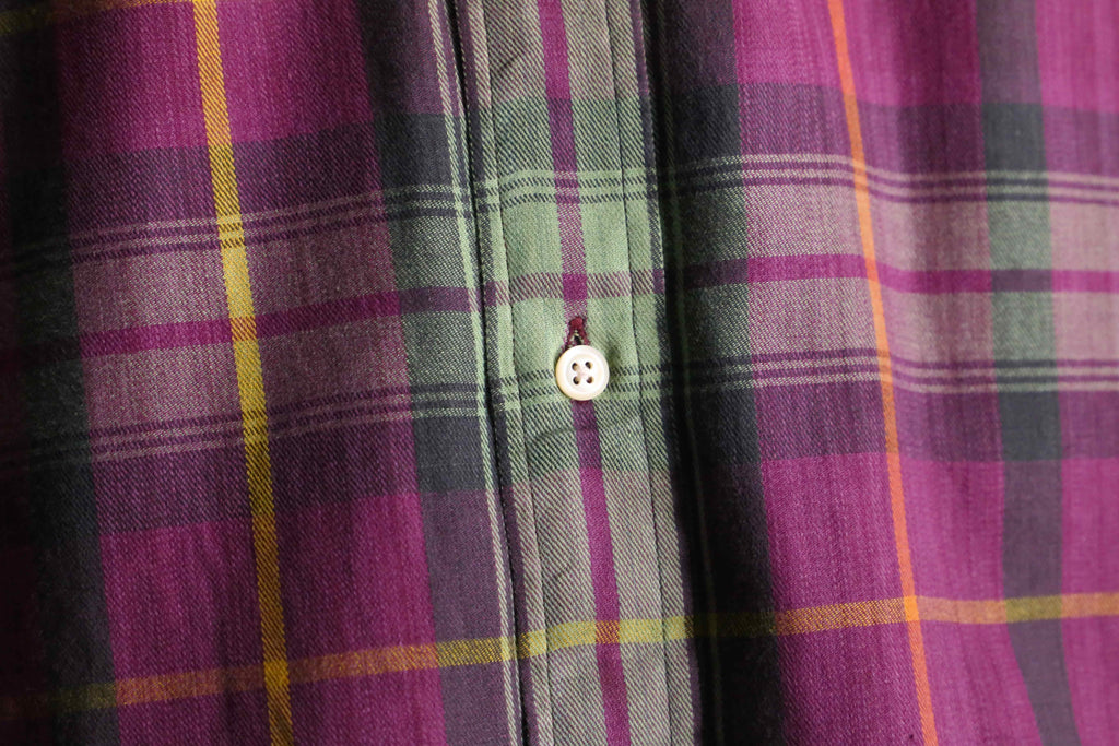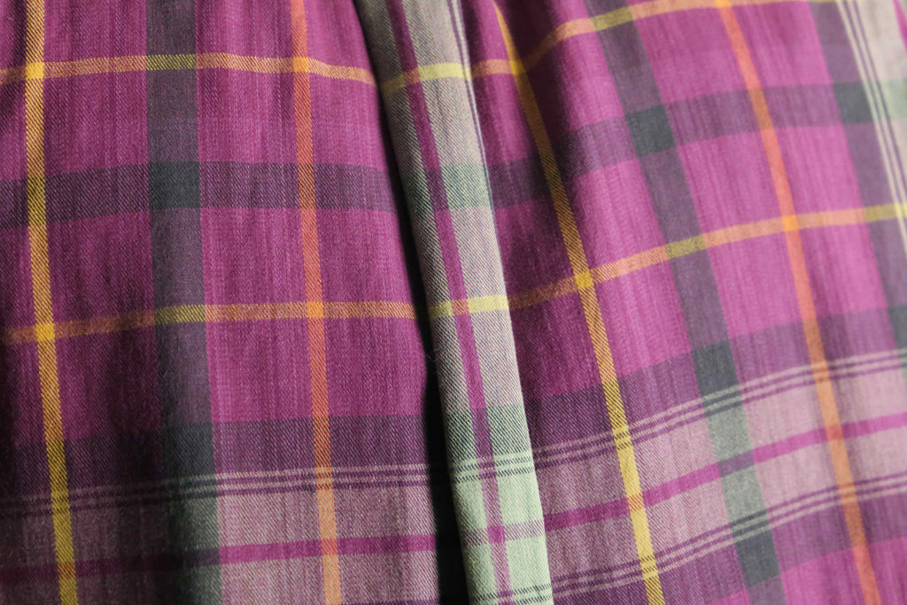 パープル×グリーンを基調に、イエローのラインが効いたチェック柄が印象的な一枚です。