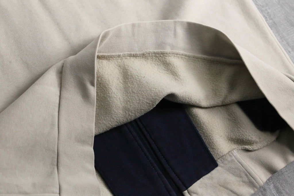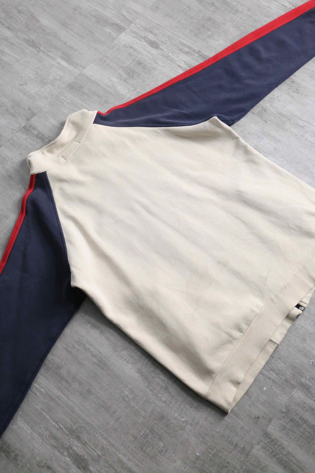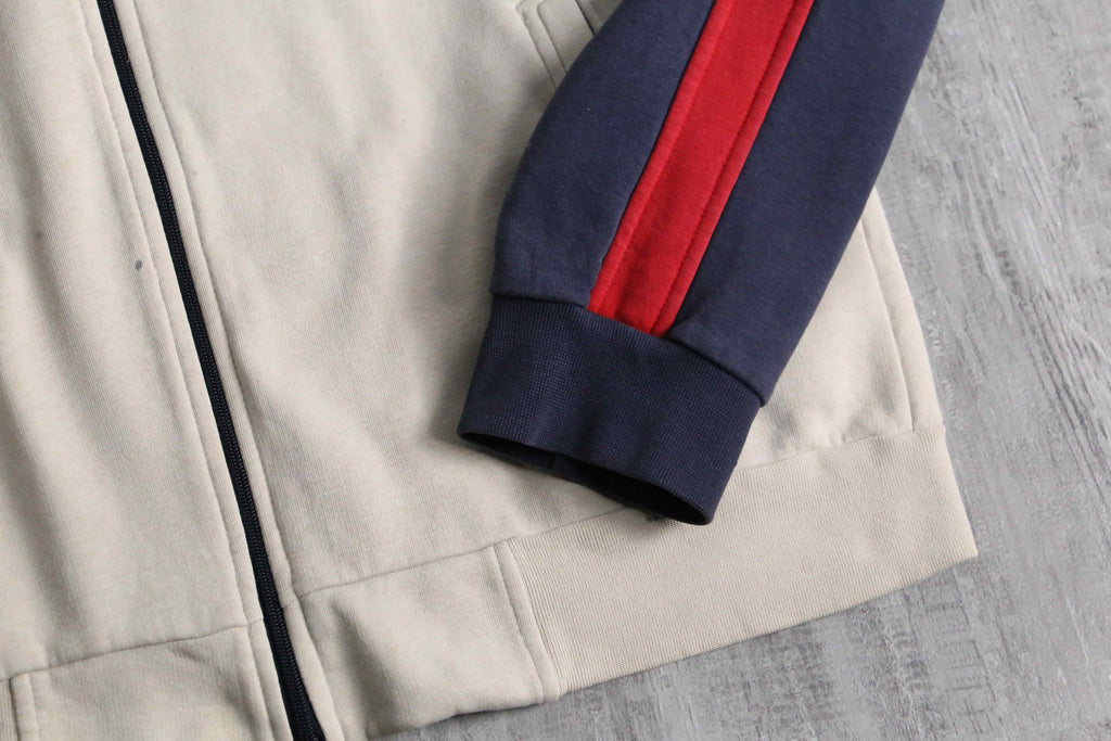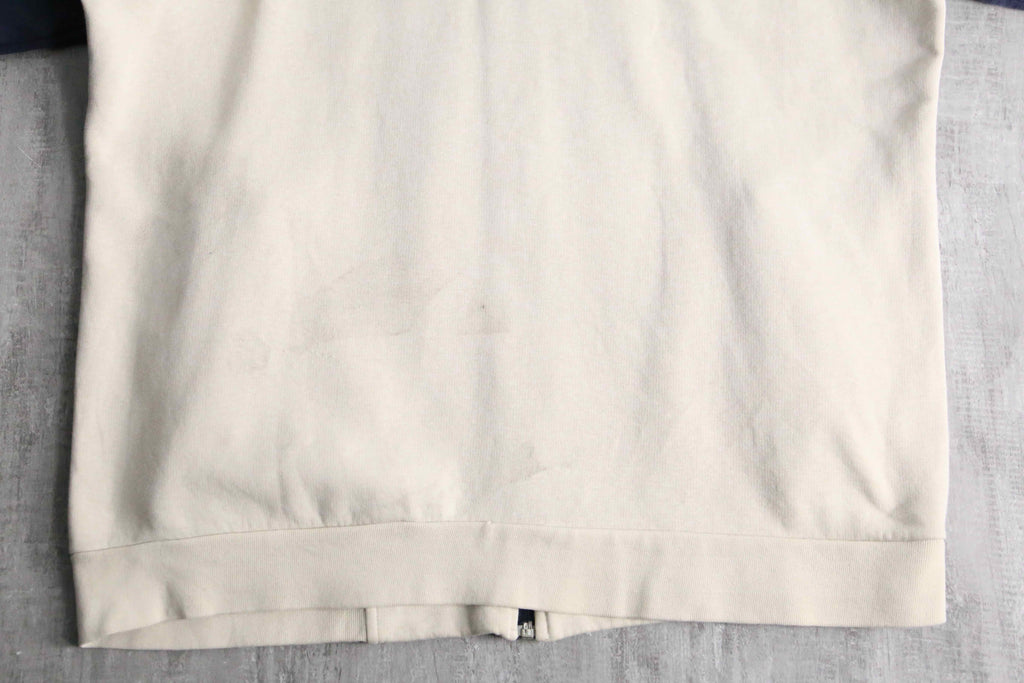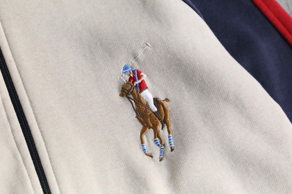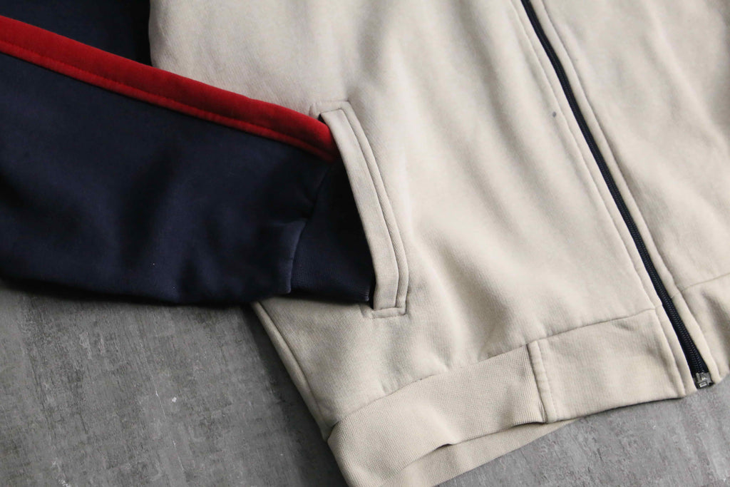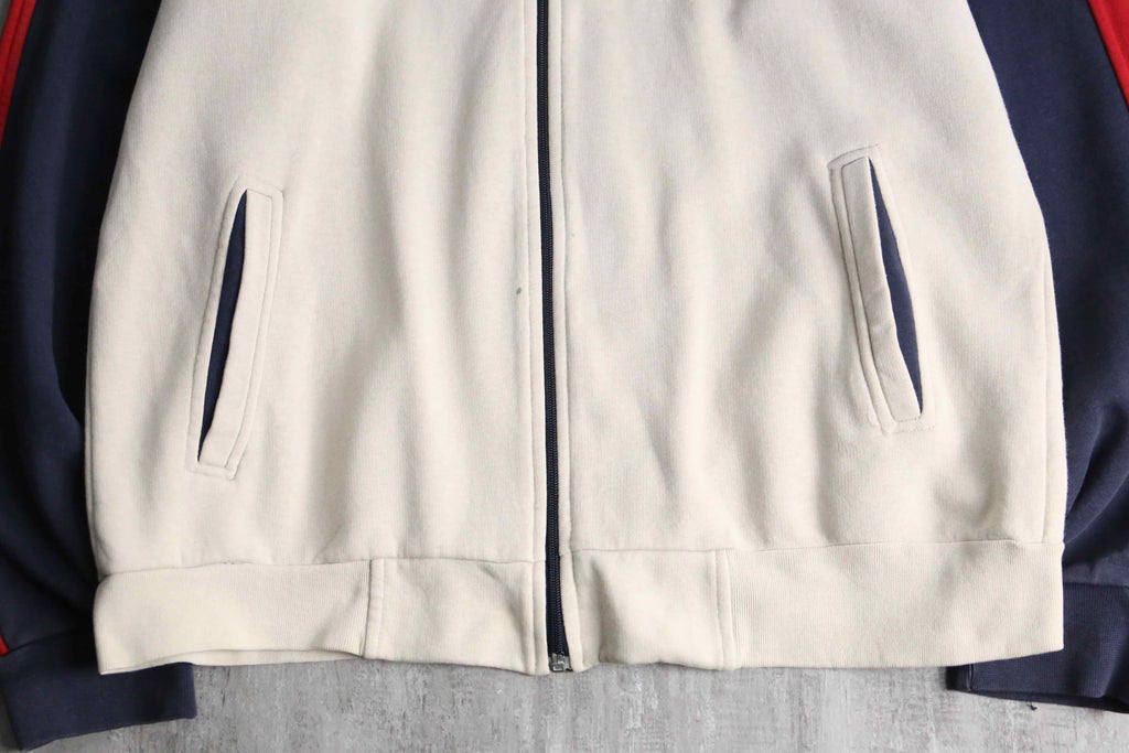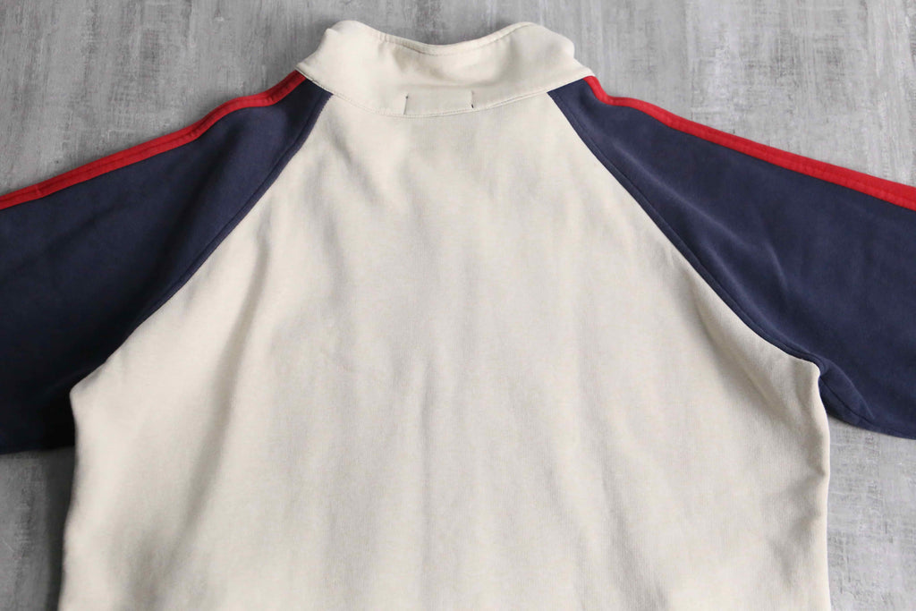 少し生成りがかったベースに、ネイビーとレッドのラインを効かせた配色は、推定00’sらしいスポーティさと上品さのバランスが取れた仕上がりです。胸元にはポロプレイヤー刺繍、反対側には当時らしいモチーフ刺繍が入り、単調になりがちなトラックジャケットに程よい主張を加えています。