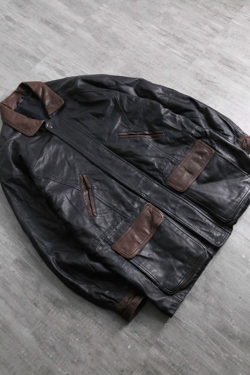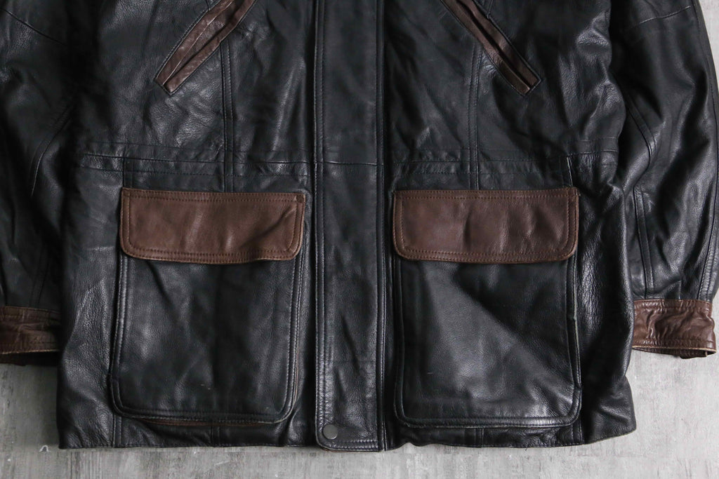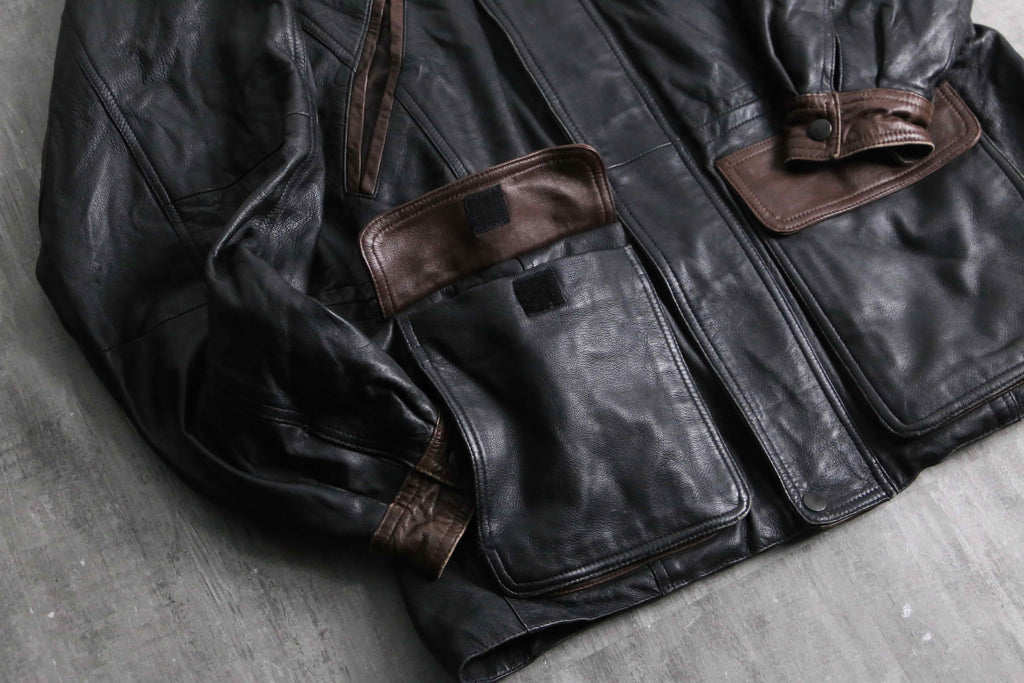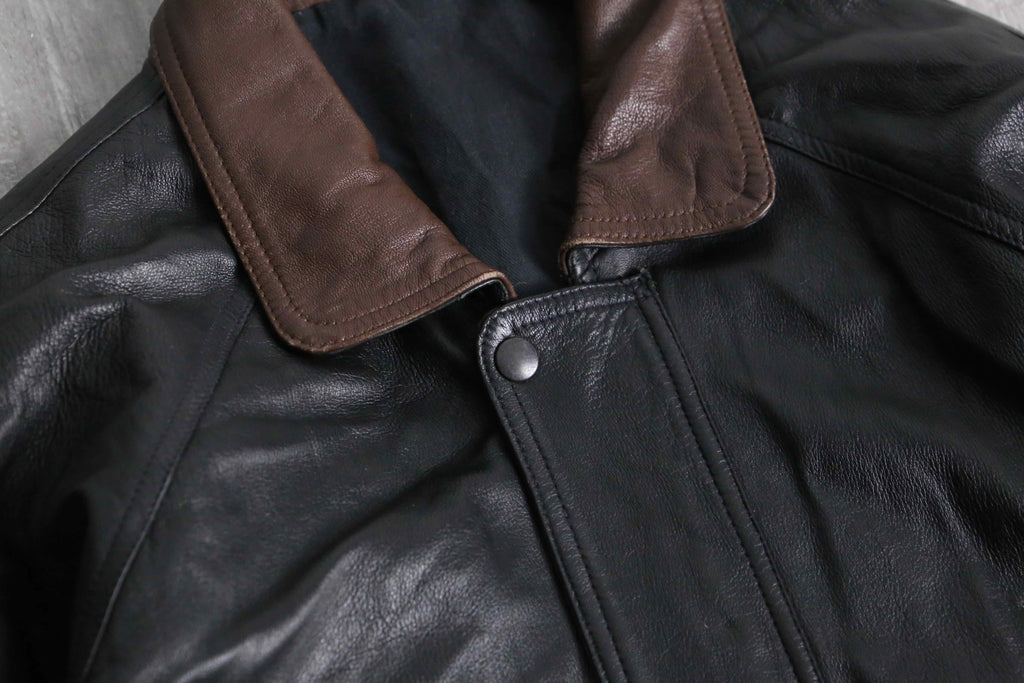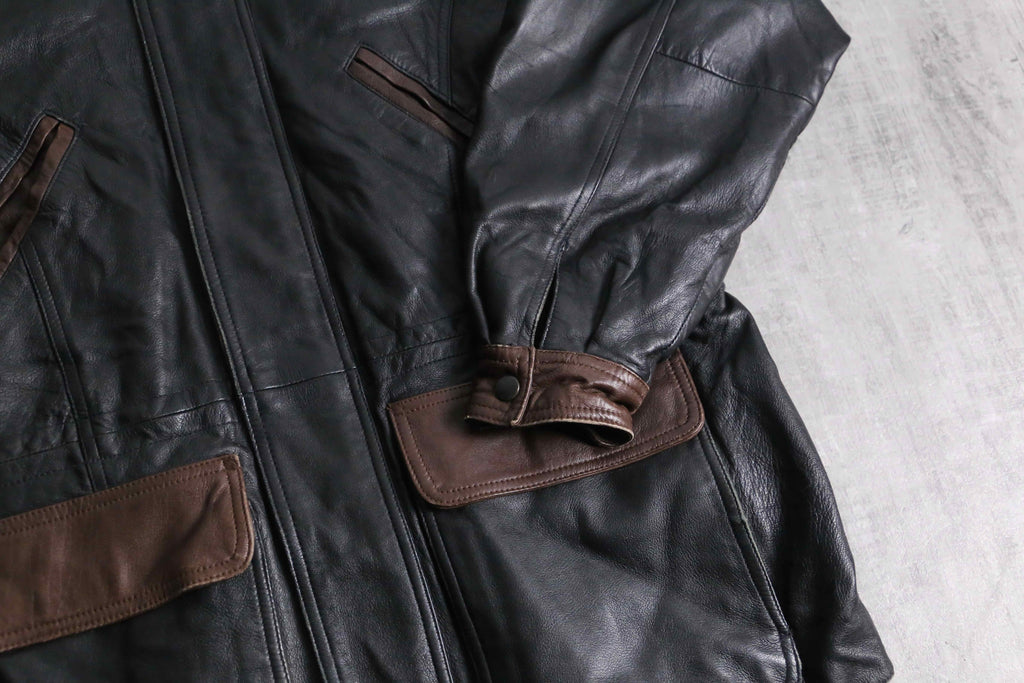 もちっと柔らかな質感のレザーが用いられたミドルレングスジャケット。ブラックレザーを基調に、襟・カフス・ポケット・比翼裏・脇部分にブラウンレザーを配した切り替えデザインが施されています。