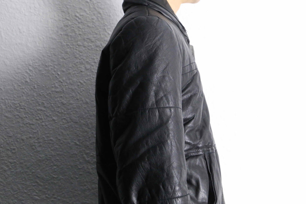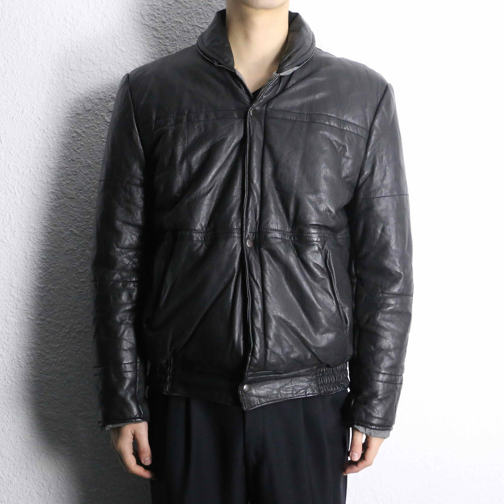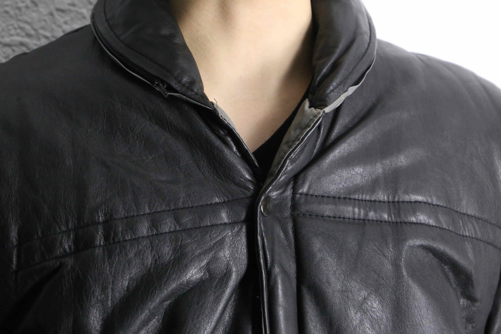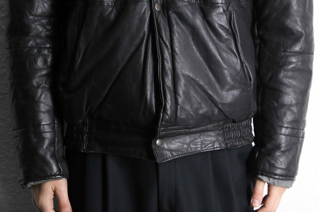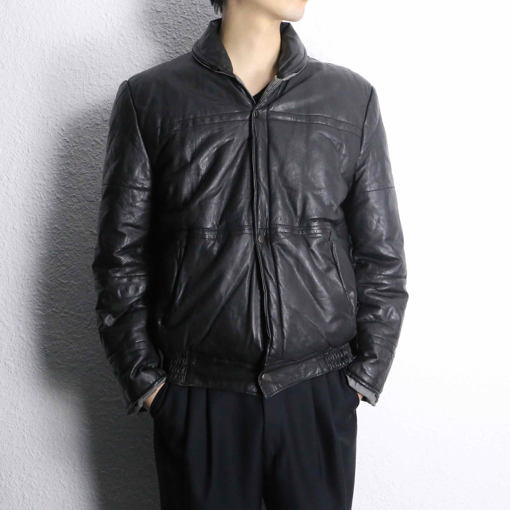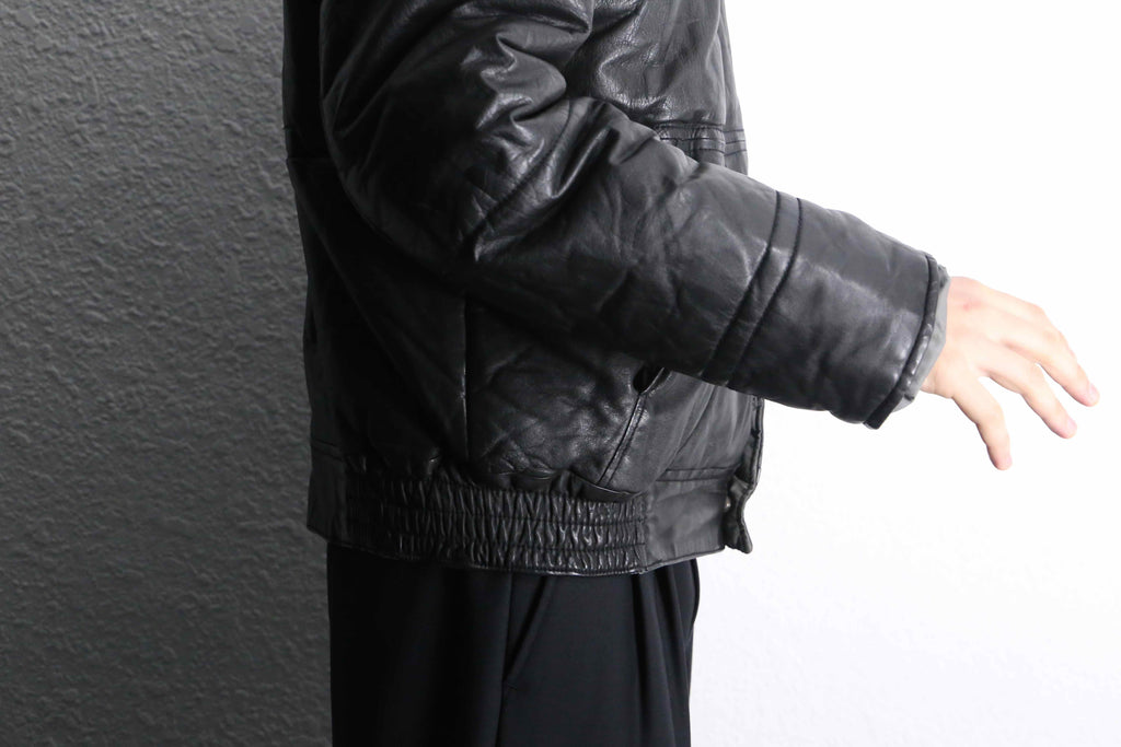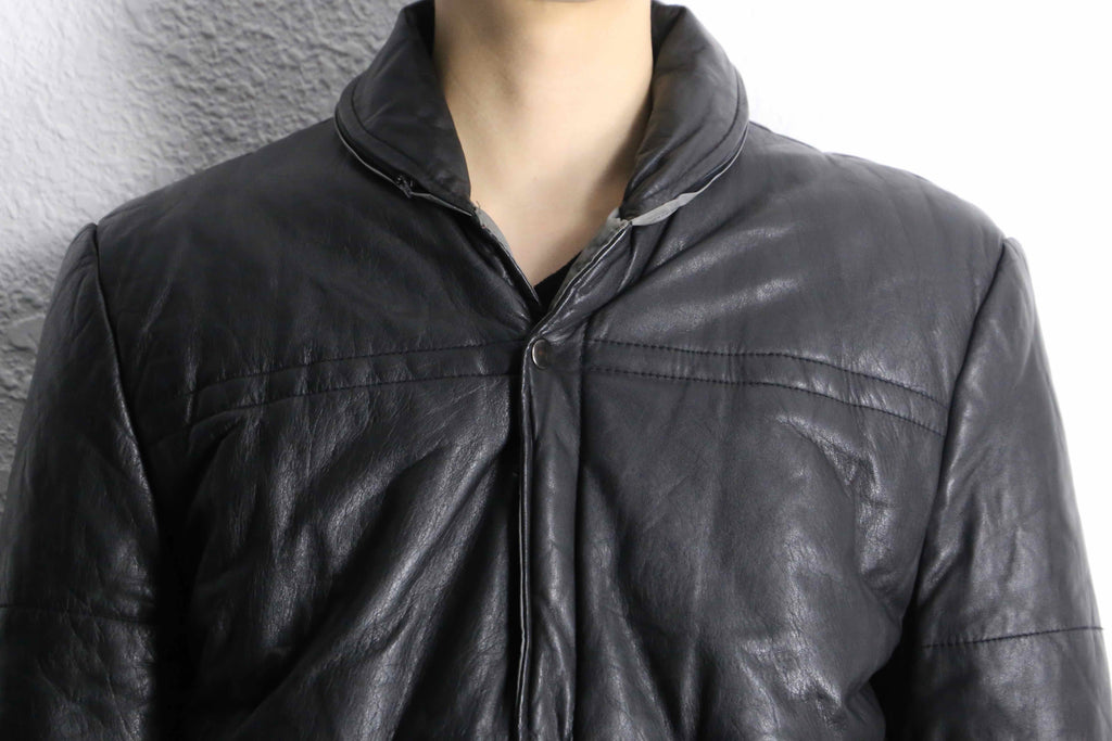 表はブラックレザー、裏はグレーのTCポプリン生地を使用した、リバーシブル仕様の中綿ジャケット。