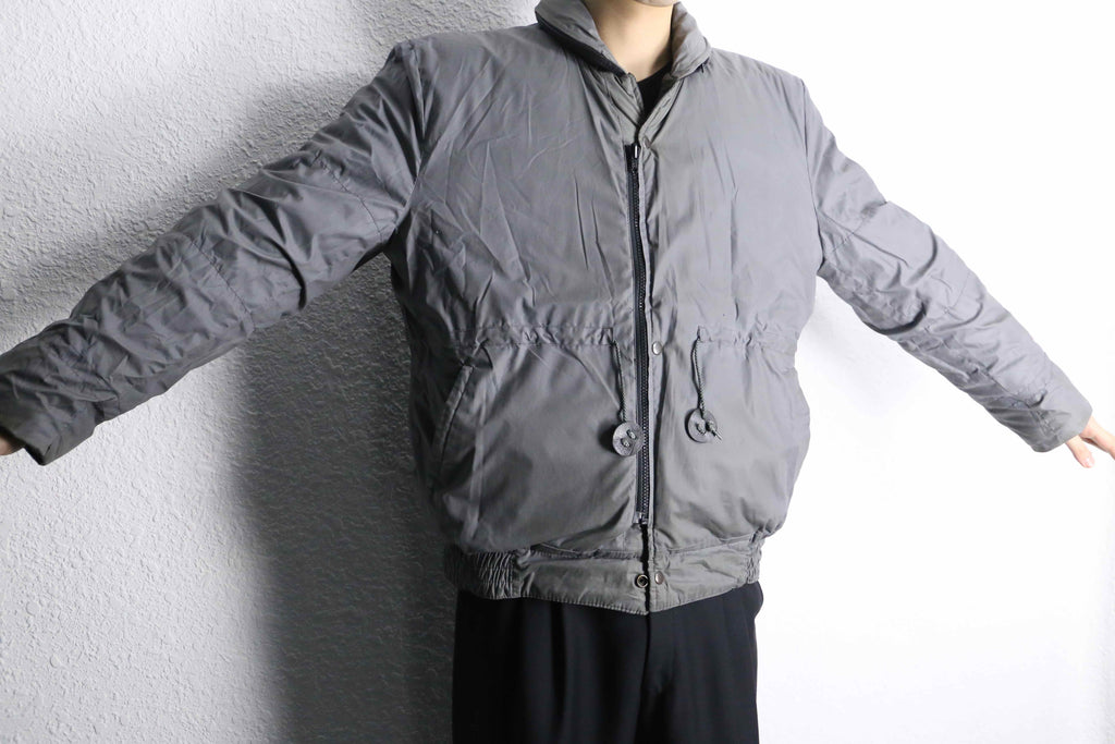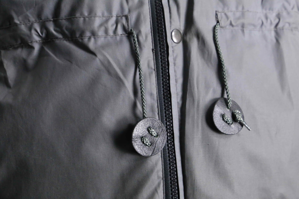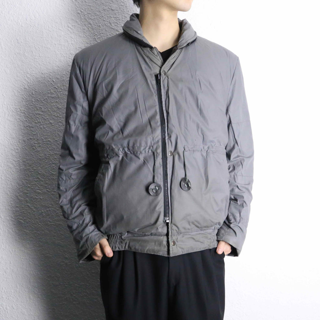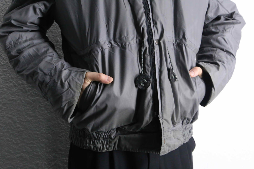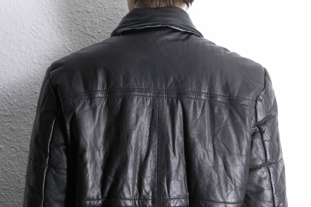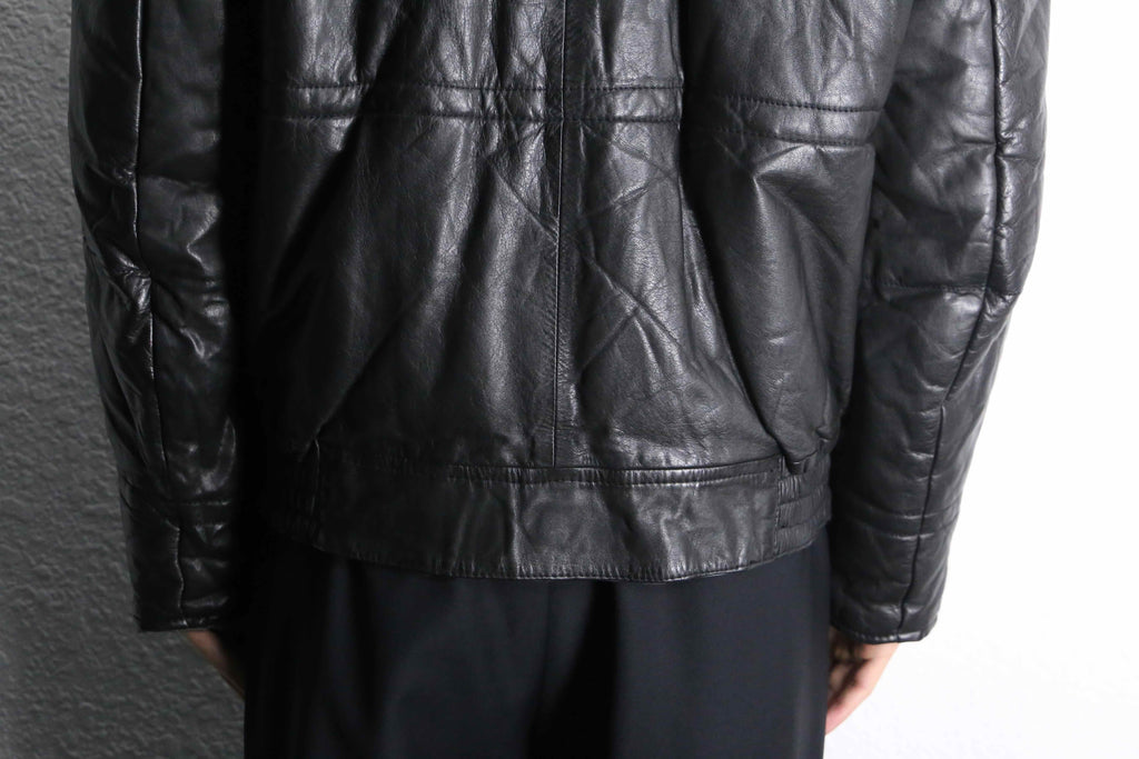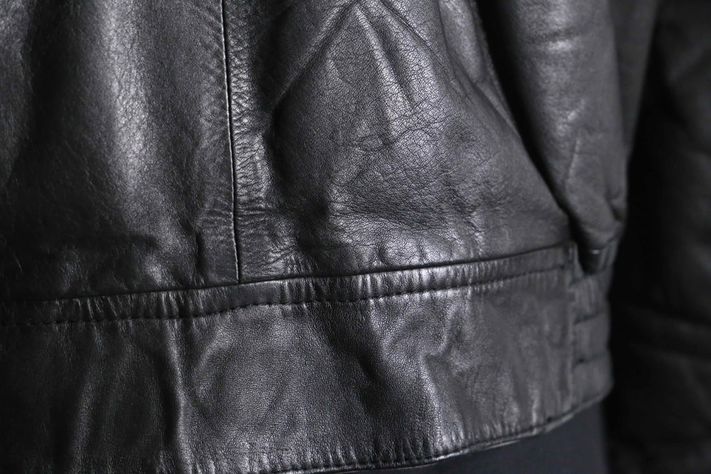 表はブラックレザー、裏はグレーのTCポプリン生地を使用した、リバーシブル仕様の中綿ジャケット。