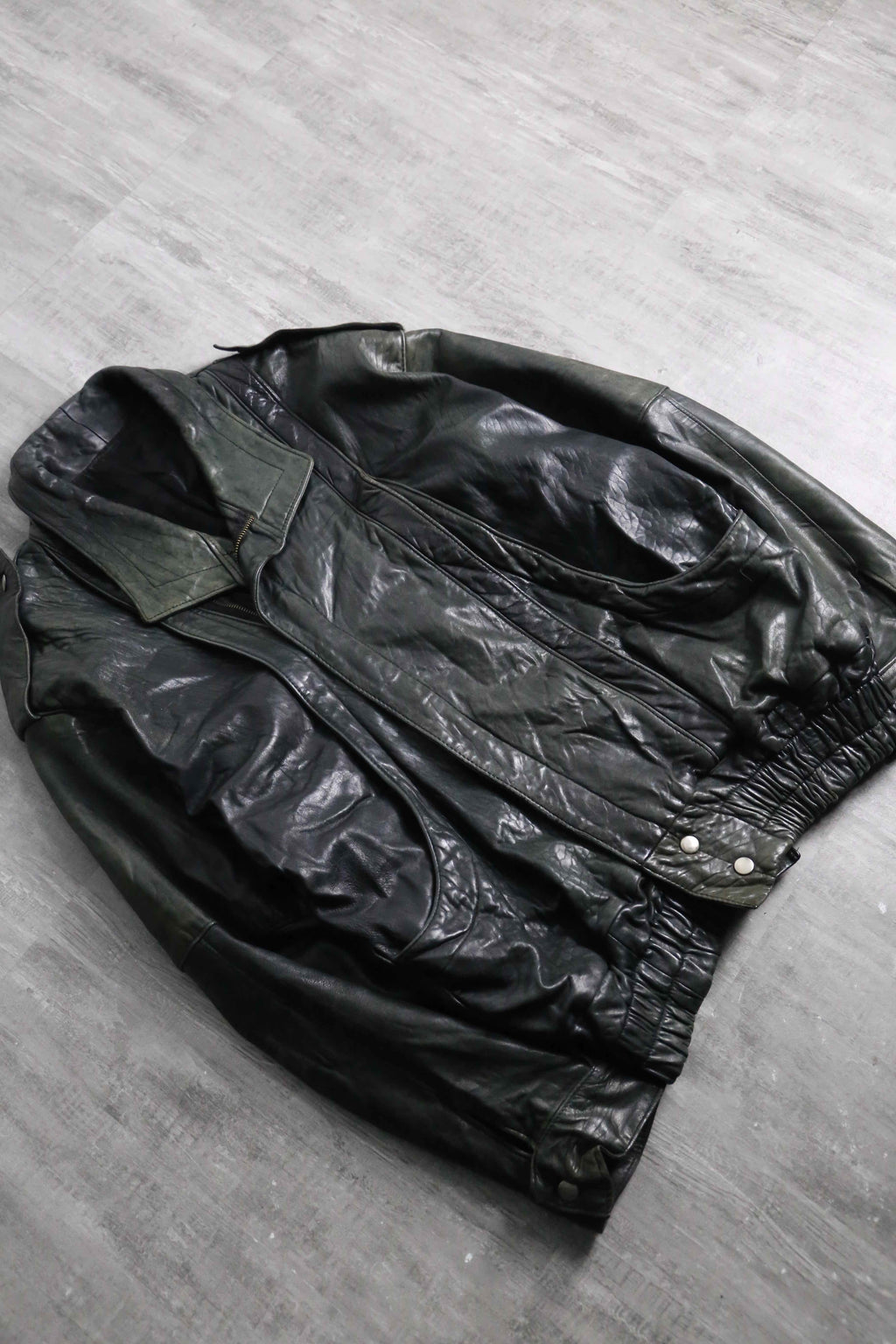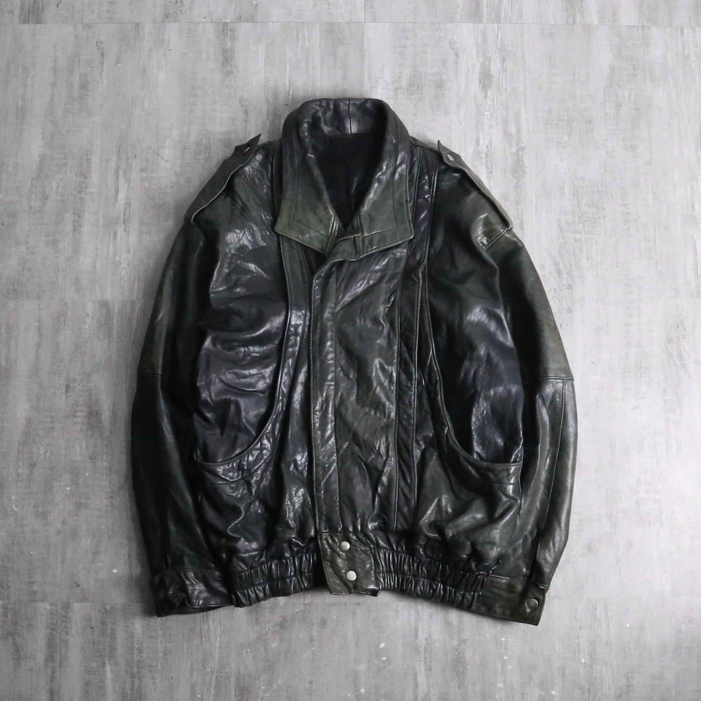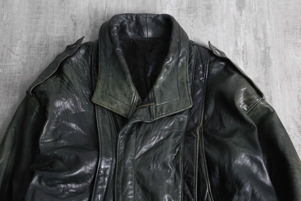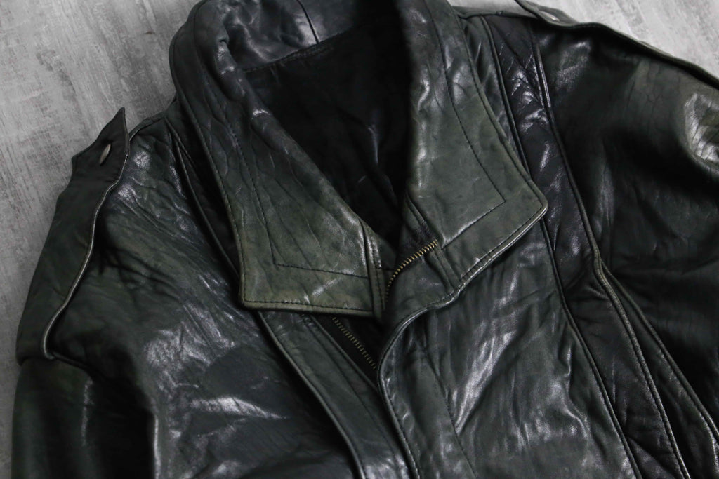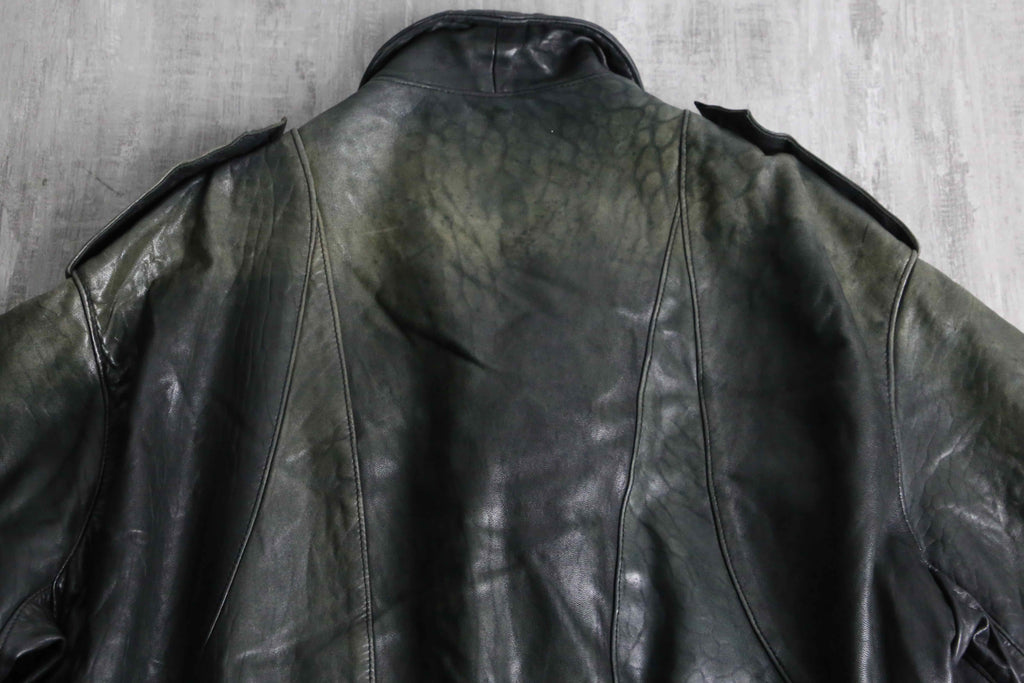 褪色により黒から深緑へと変色を遂げたダブル仕様のレザージャケット。