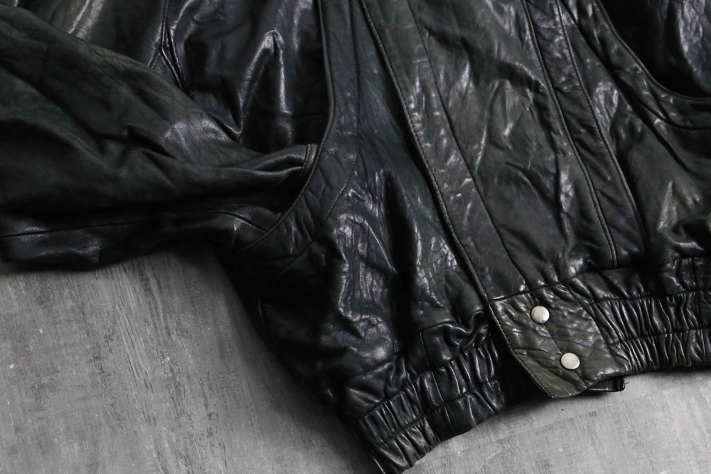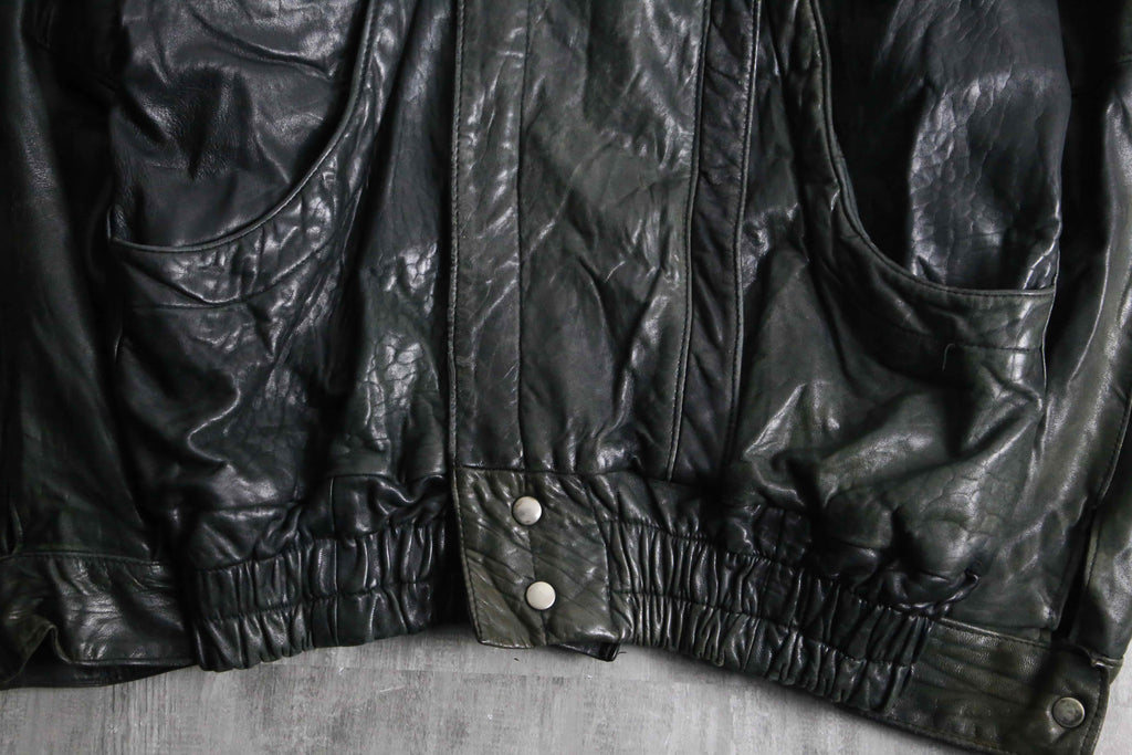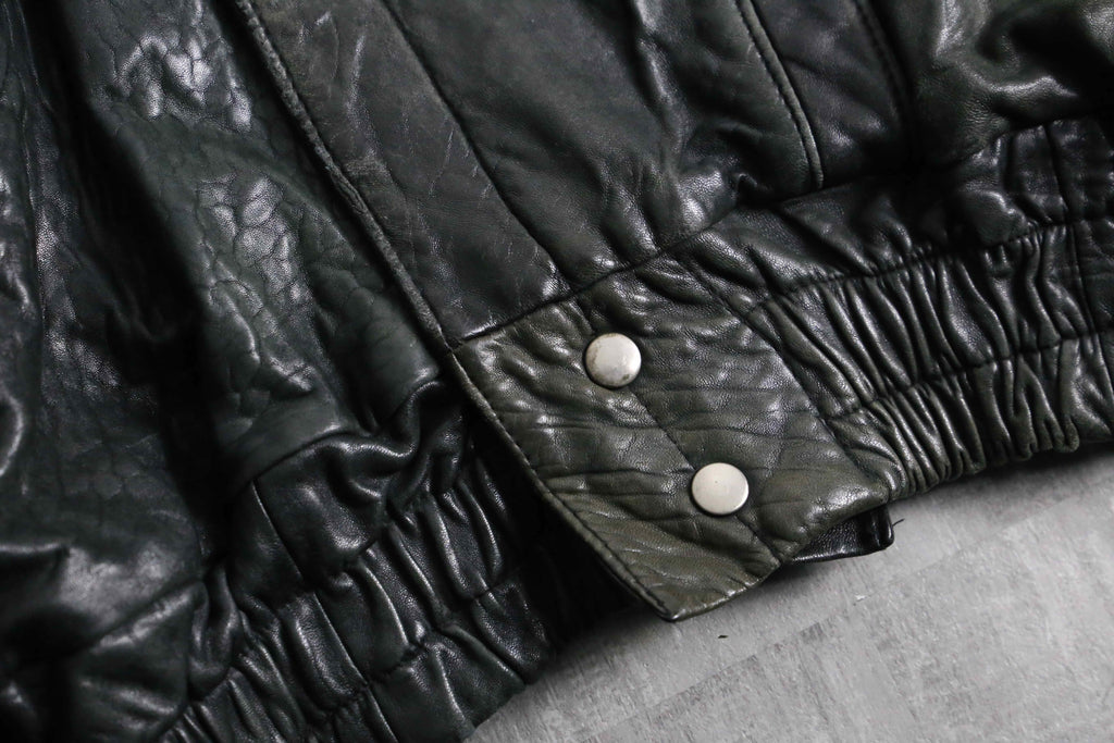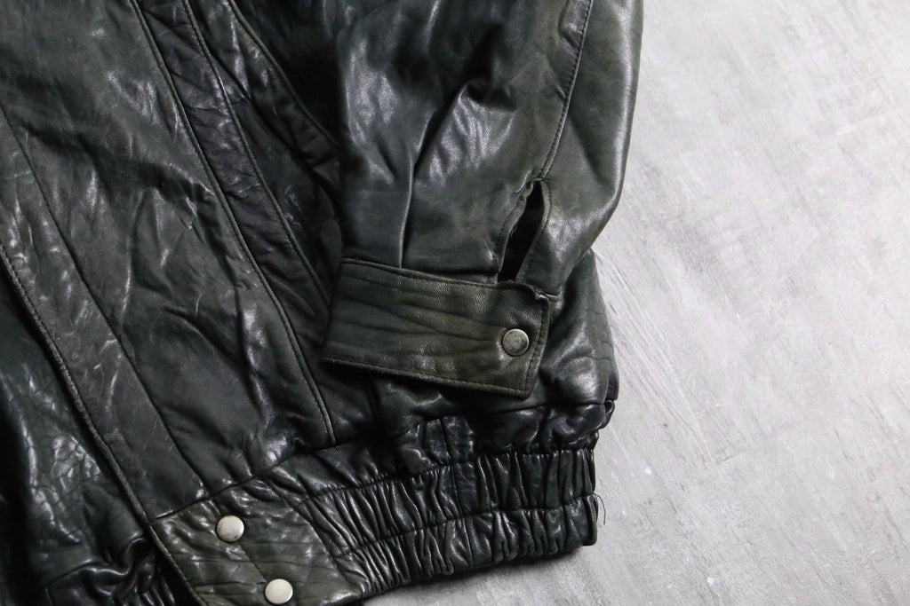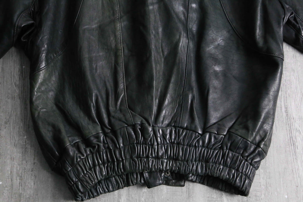 褪色により黒から深緑へと変色を遂げたダブル仕様のレザージャケット。