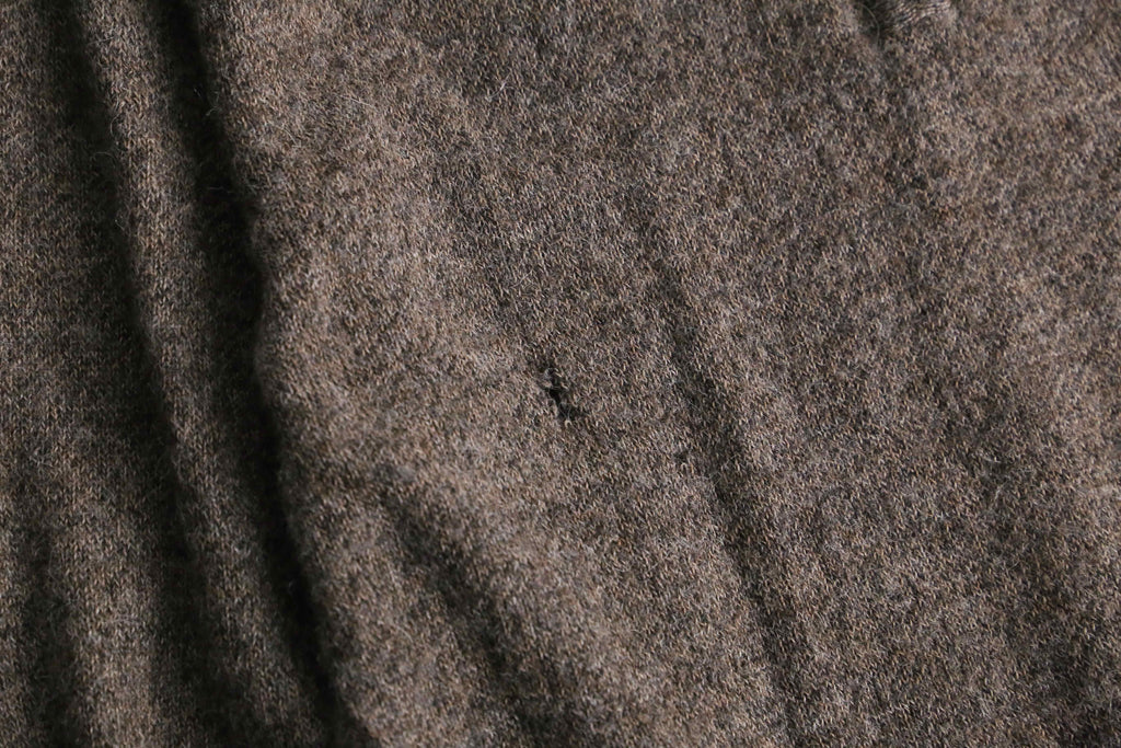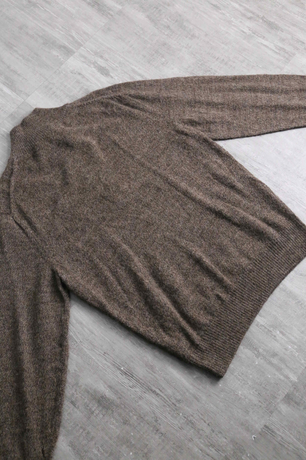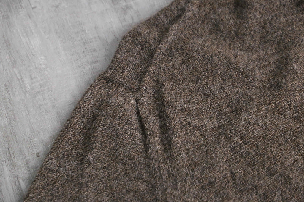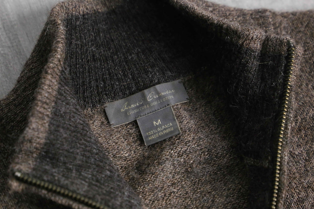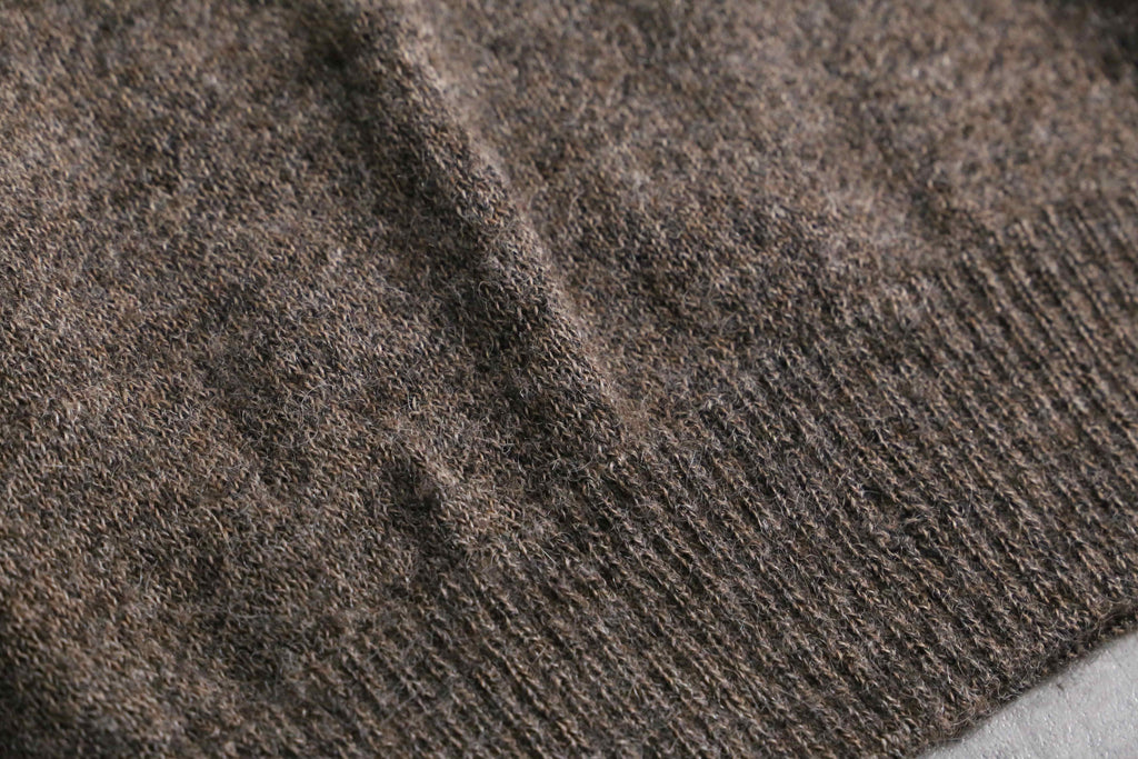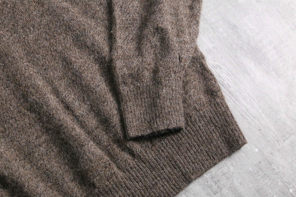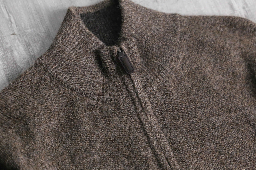 ふんわりと起毛感のある表情と、アルパカ特有の軽さ・保温性が魅力の一着。ジップのレザーとブラウンのボディが落ち着いた印象を与え、甘さの出やすい素材感を大人っぽくまとめています。