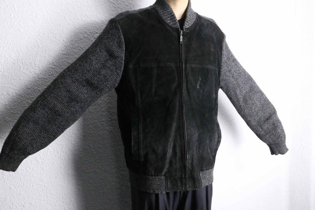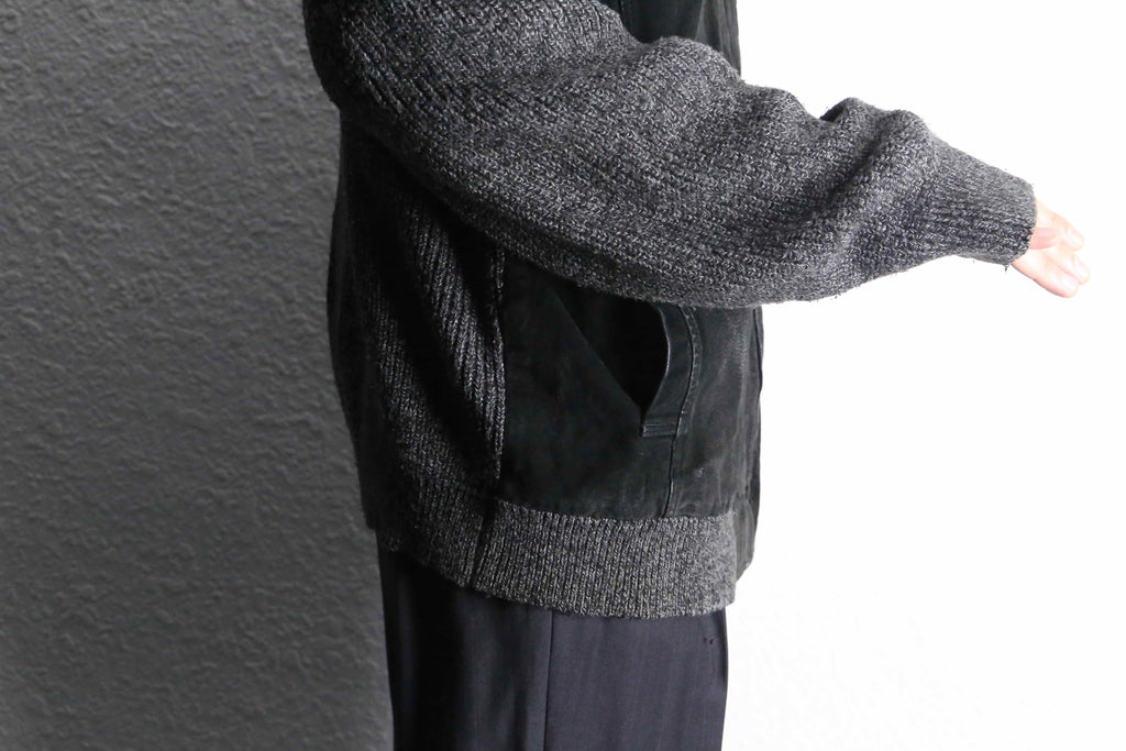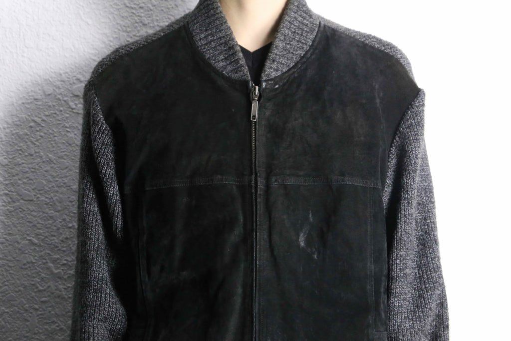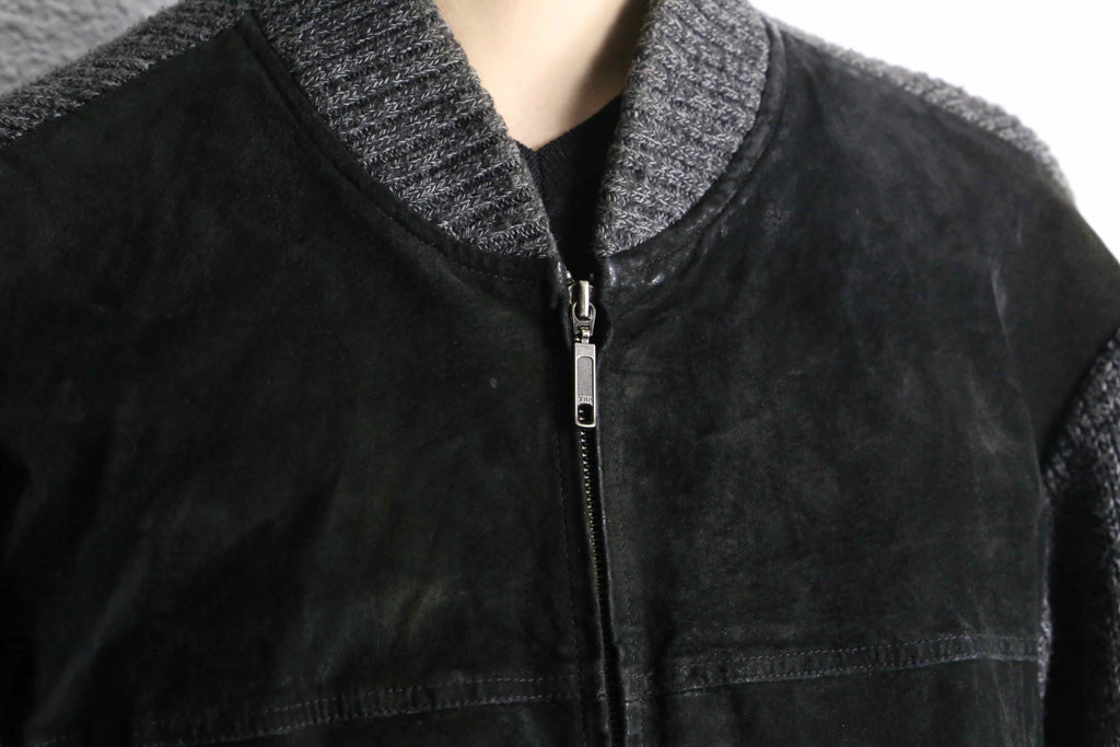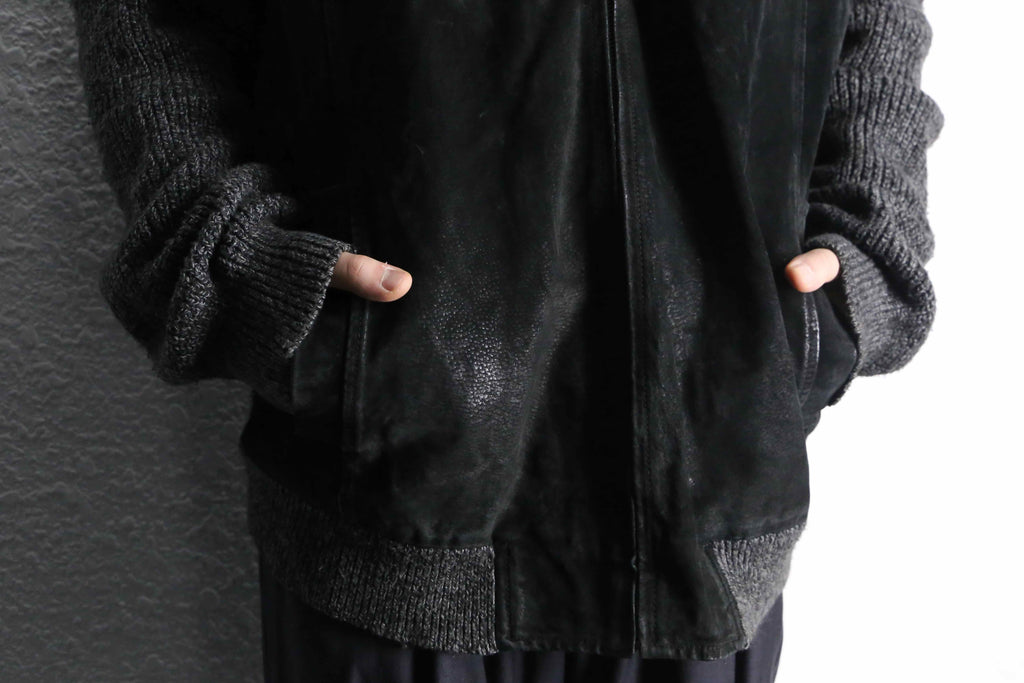 フロントにブラックスエード、袖・背面・リブにニットを組み合わせた異素材コンビのジップブルゾン。モノトーンによる落ち着いた佇まいながら、素材の切り替えによって奥行きのある表情に仕上がっています。