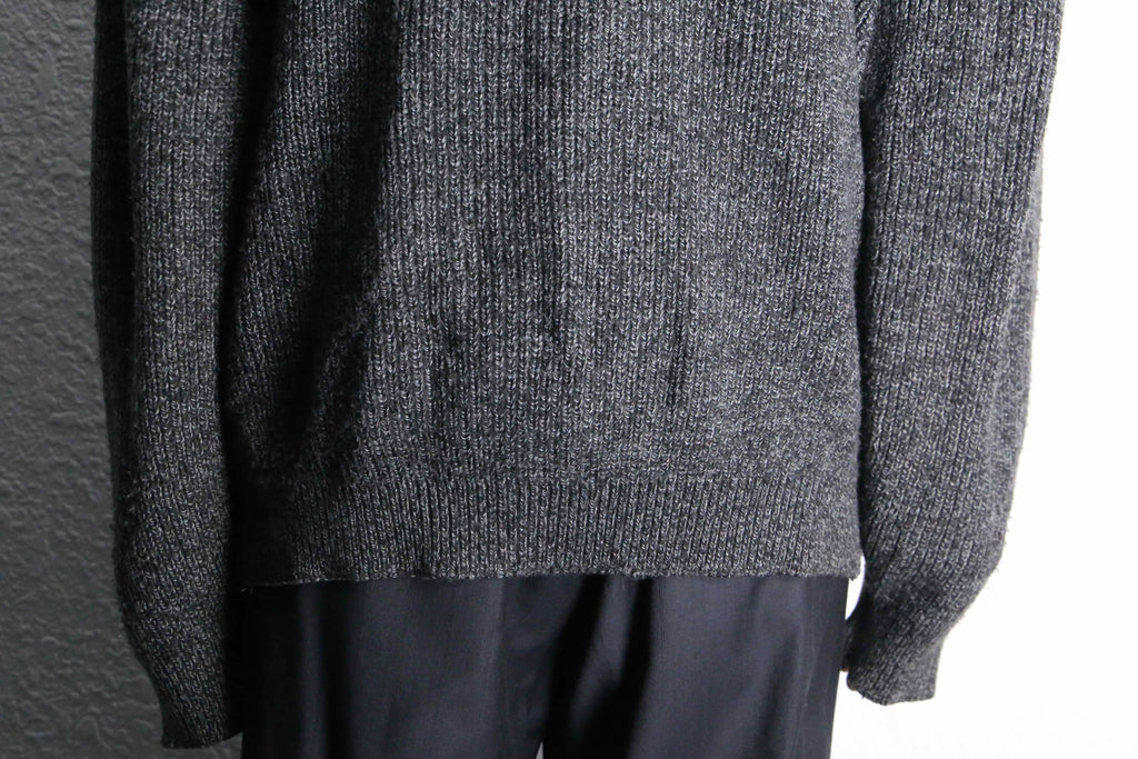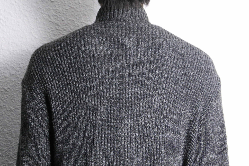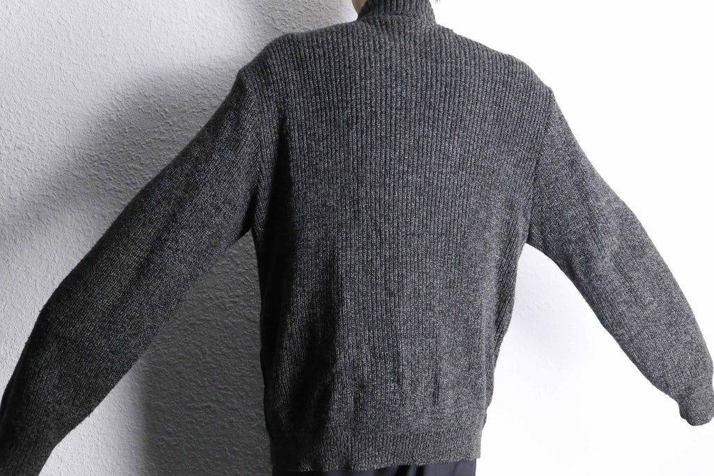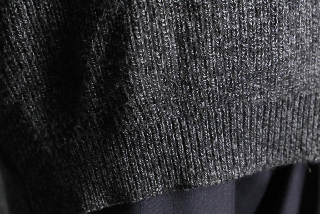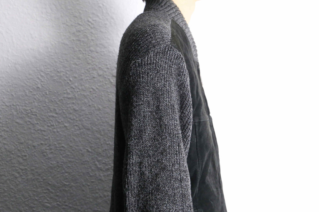 重厚感のあるブラックスエードとグレーニットによるダークトーンの構成ですが、ニット部分に混じる白糸のおかげで重くなりすぎず、日常的に使いやすい一着です。