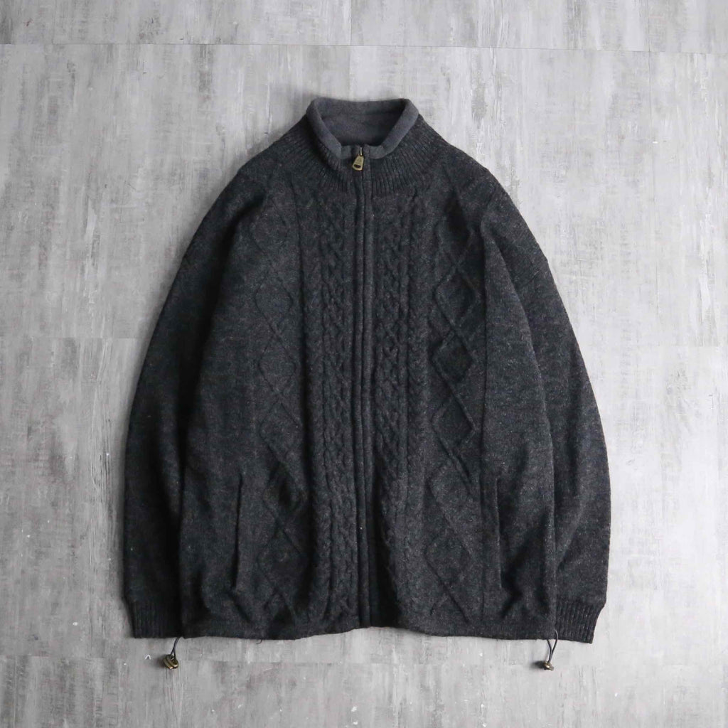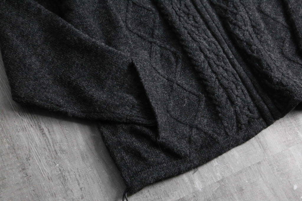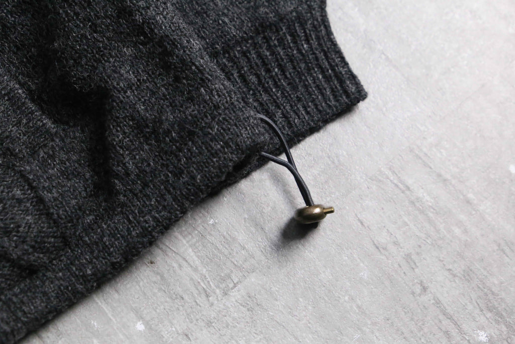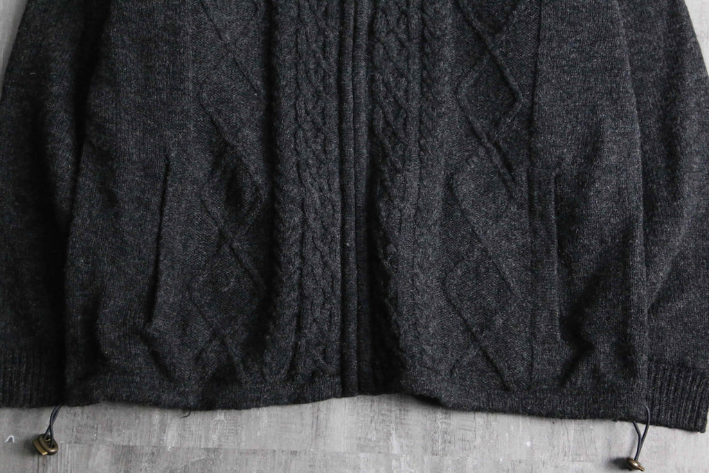 フルジップ仕様のウールニット。伝統的なアランニットをベースにしながら、ポケットや裾のドローコードといった実用的なディテールを備えた一着です。