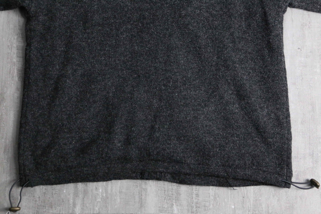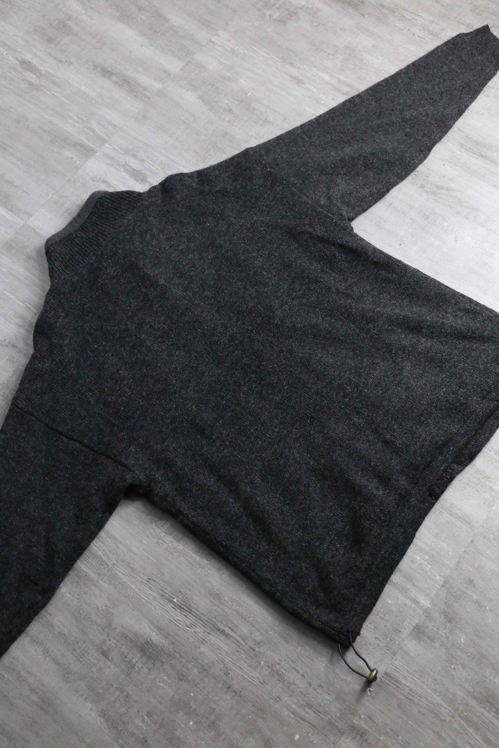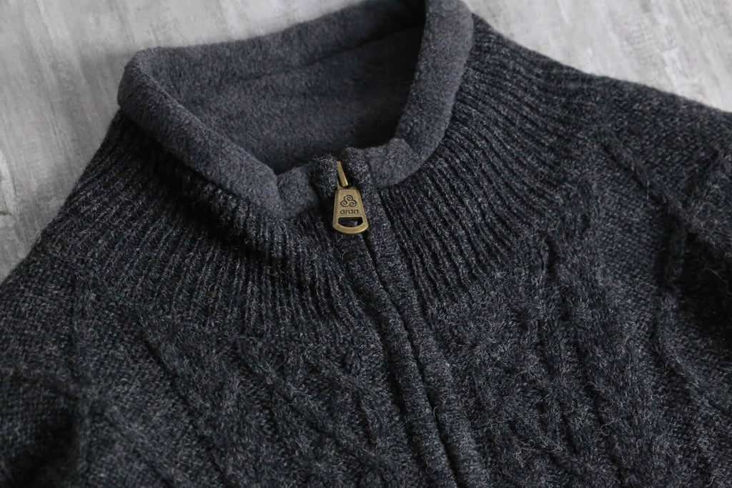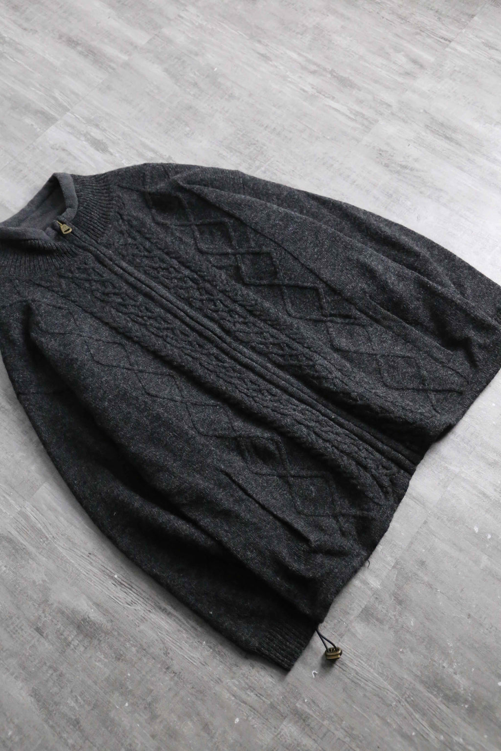 フルジップ仕様のウールニット。伝統的なアランニットをベースにしながら、ポケットや裾のドローコードといった実用的なディテールを備えた一着です。