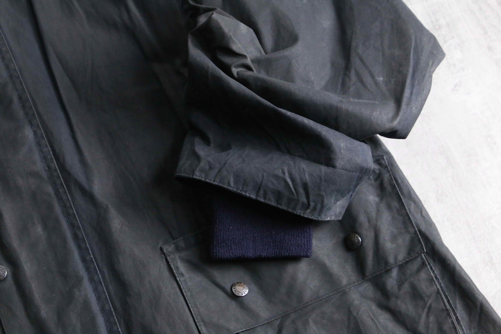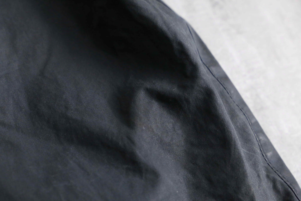 今回はブラックのオイルドクロスを採用した1着。仕立ては某有名ブランドの名作モデルを彷彿とさせるシルエットで、ダブルジップ仕様にハンドウォームポケットと、普段使いしやすいディテール。袖口がリブになっている点も防風性の面で嬉しいポイントですね。