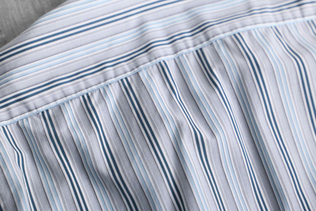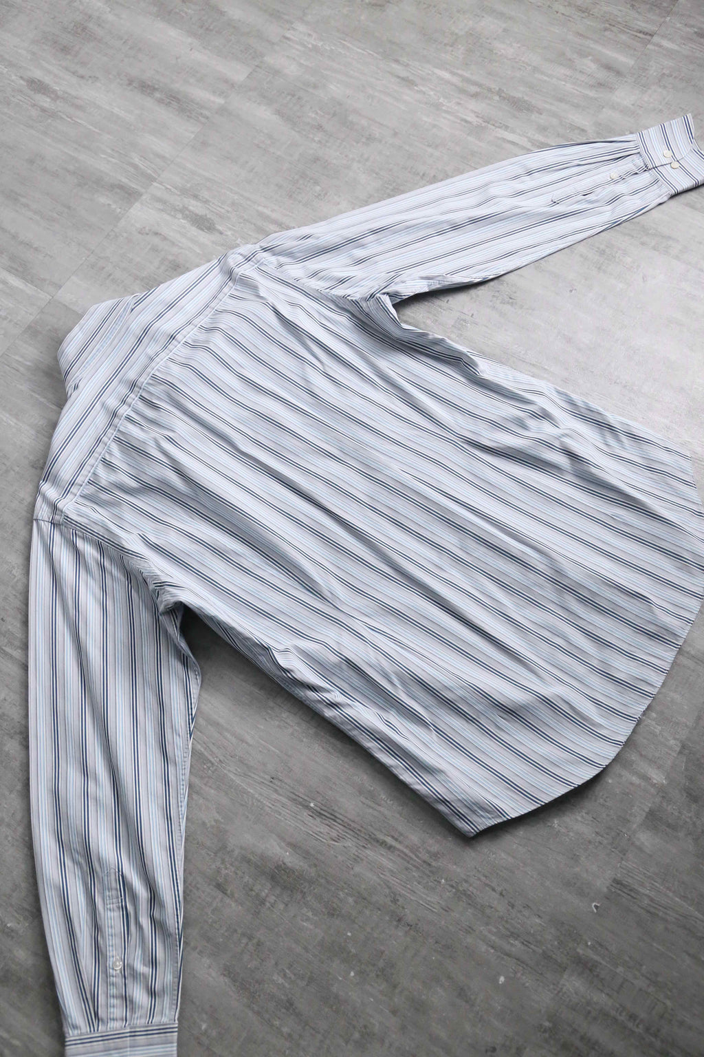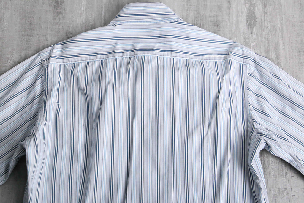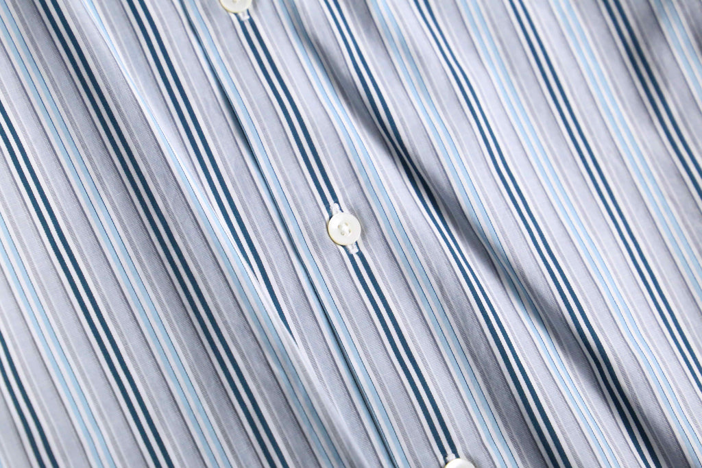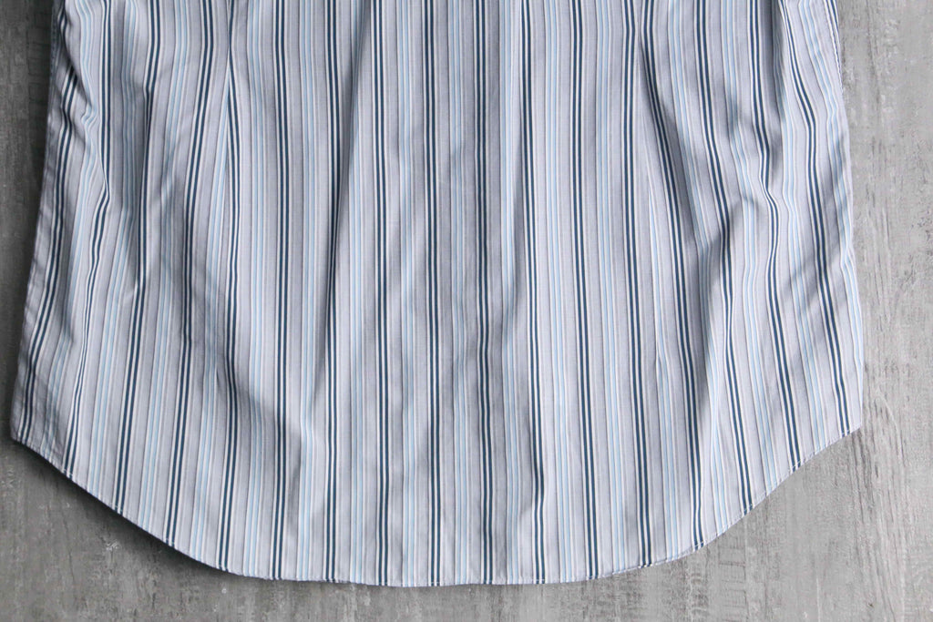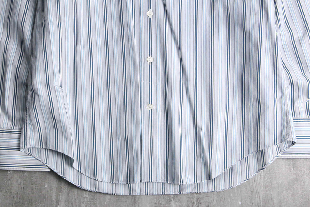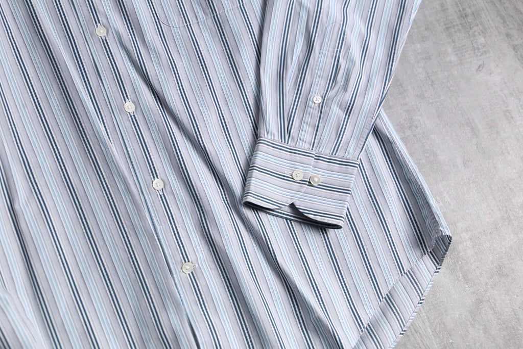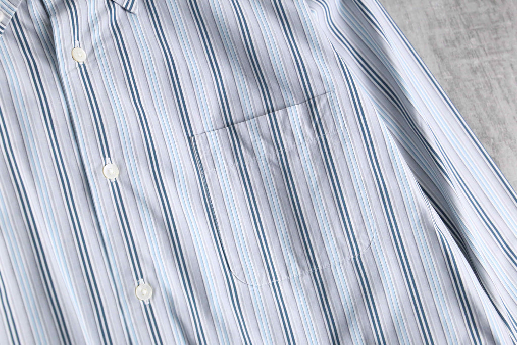 端正なストライプの配色やハリ・コシのある生地感には英国的なムードを感じさせつつ、ボタンダウン仕様やフロントポケットといったディテールはどこかアメリカらしい空気感。堅すぎず、崩しすぎない、ちょうど良い塩梅のドレスシャツといった立ち位置でしょうか。
