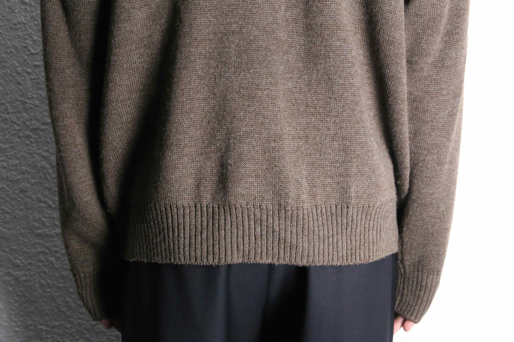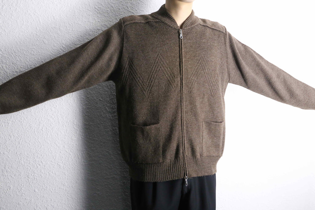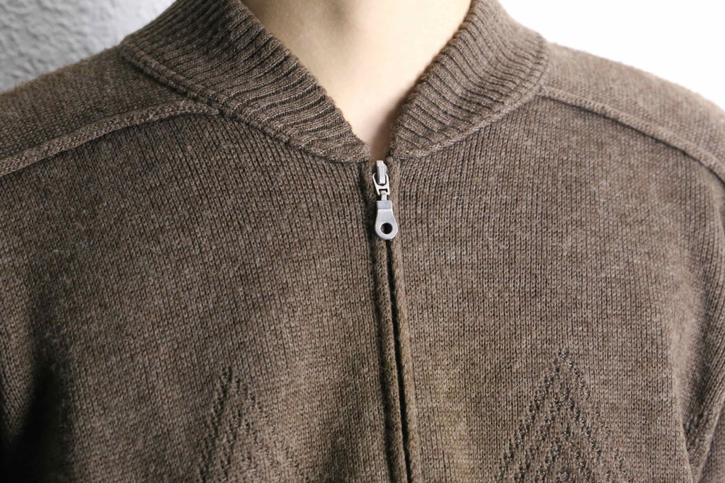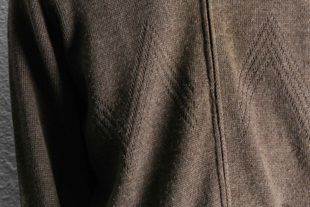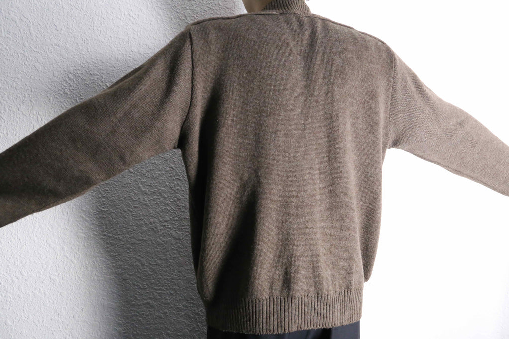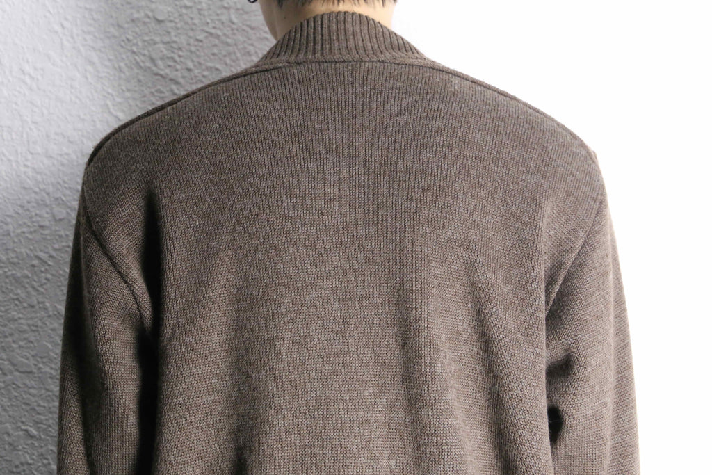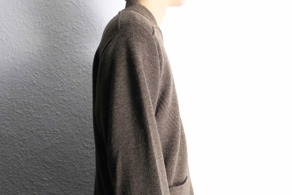 温かみのあるブラウンに、胸元にはさりげなく織柄を配置。シンプルすぎず、やりすぎない絶妙な塩梅が魅力です。フロントはポケットが剥き出しの仕様となっており、実用性はもちろんデザインアクセントとしても機能しています。ウールアクリルの混紡具合も流石イタリアメイドといったふんわりしながらもちょうど良い軽やかさ。