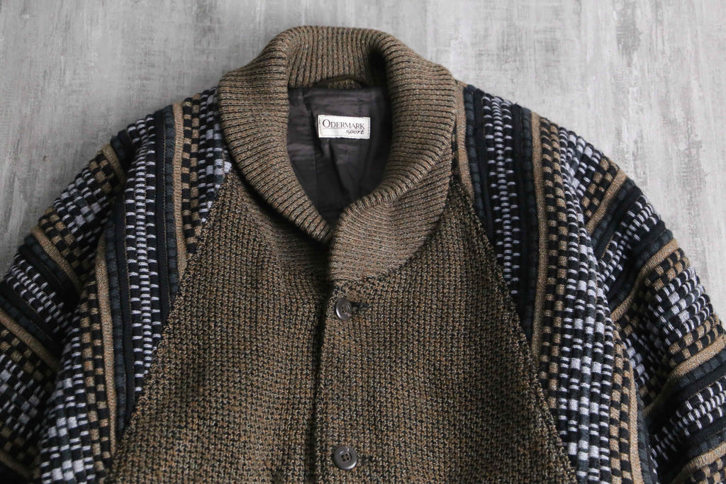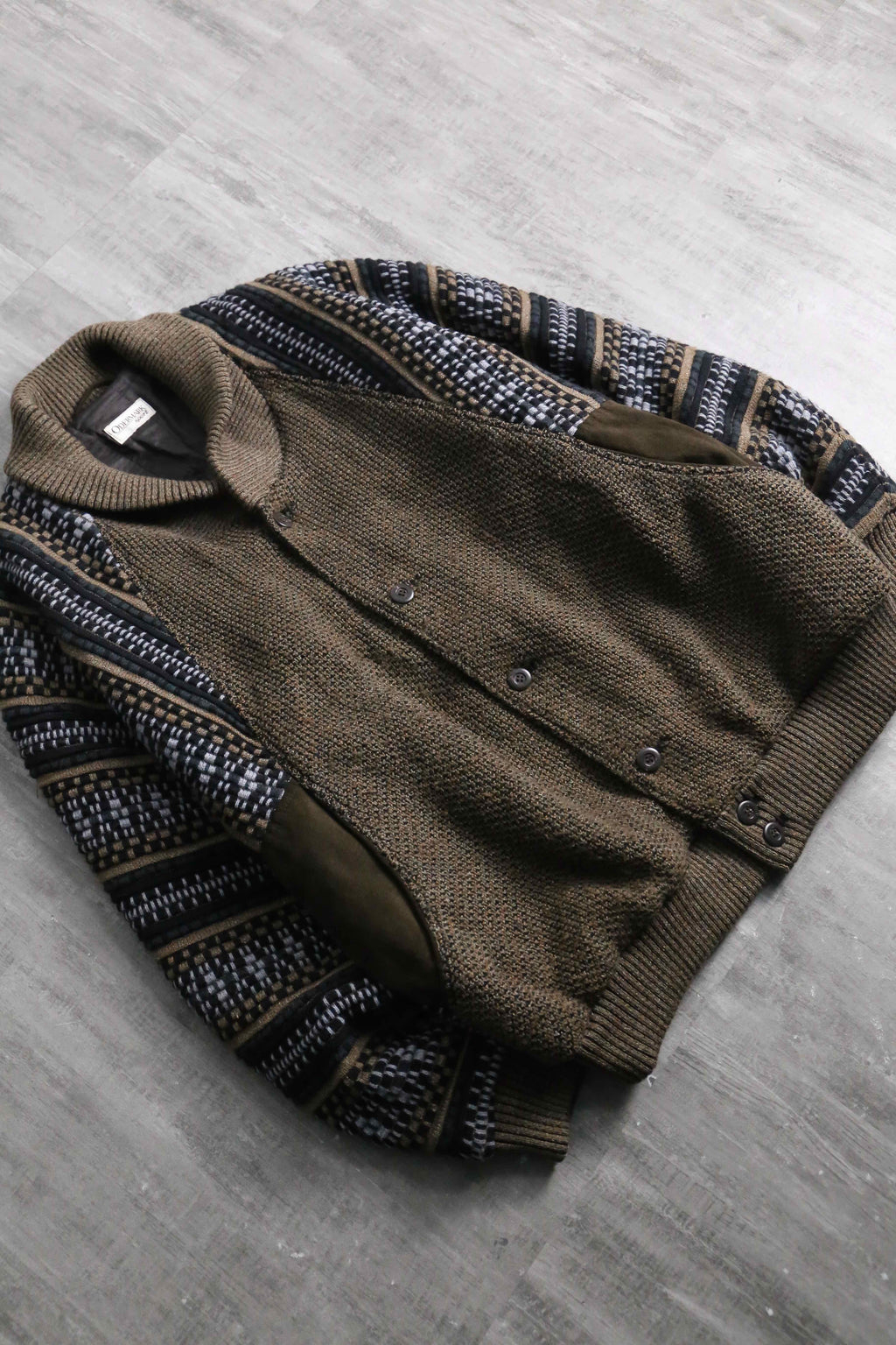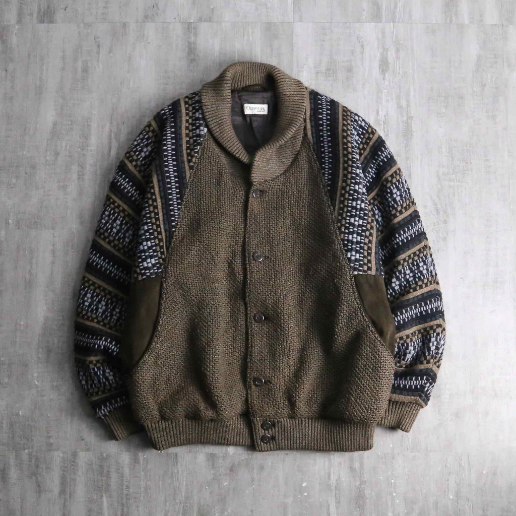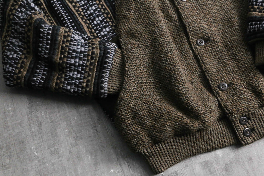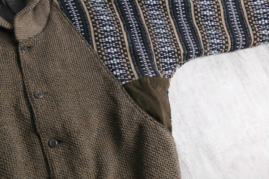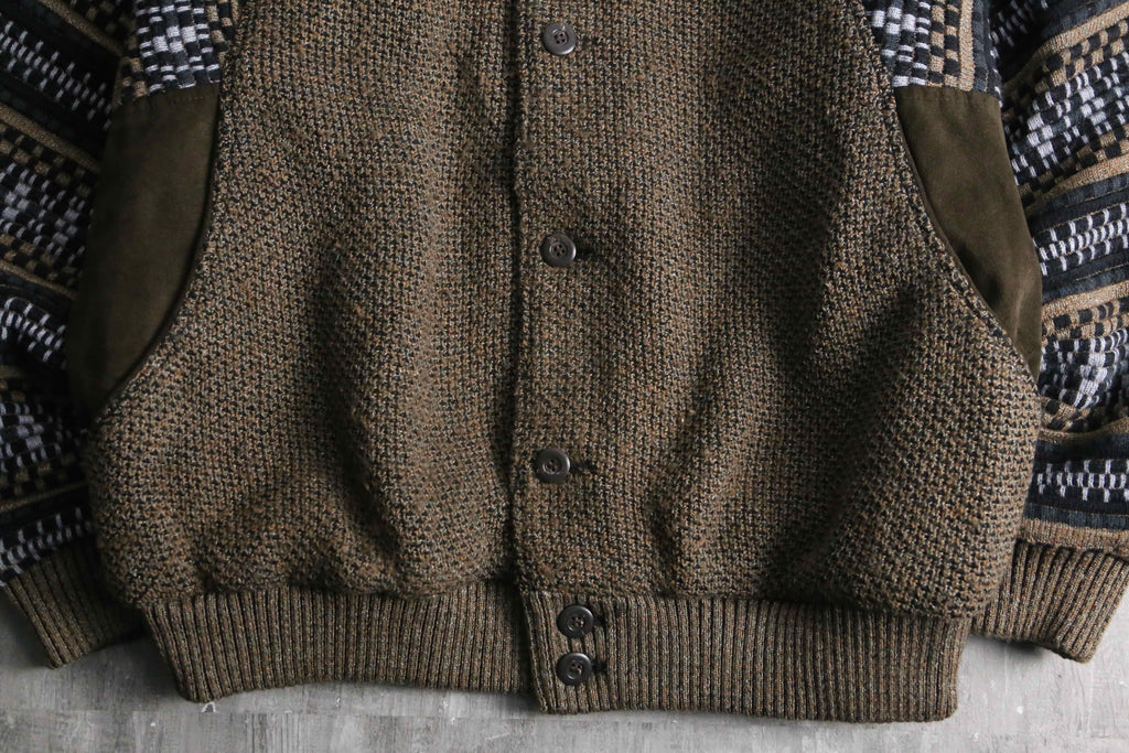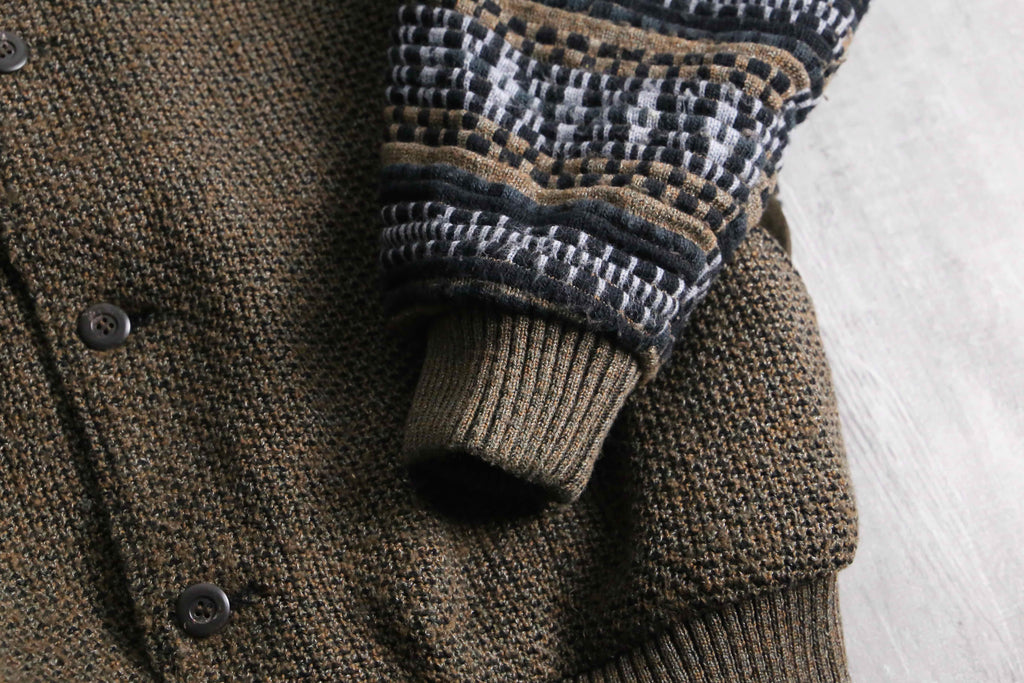前身頃は茶系を基調とした複雑な色構成。一方で袖と後身頃は幾何学ストライプへ切り替えられた、少し遊びの効いたデザイン。フェイクながらポケット口にスエードを配している点も含め、どこかユーロライクな佇まいを感じられるのが個人的にかなり好みです。