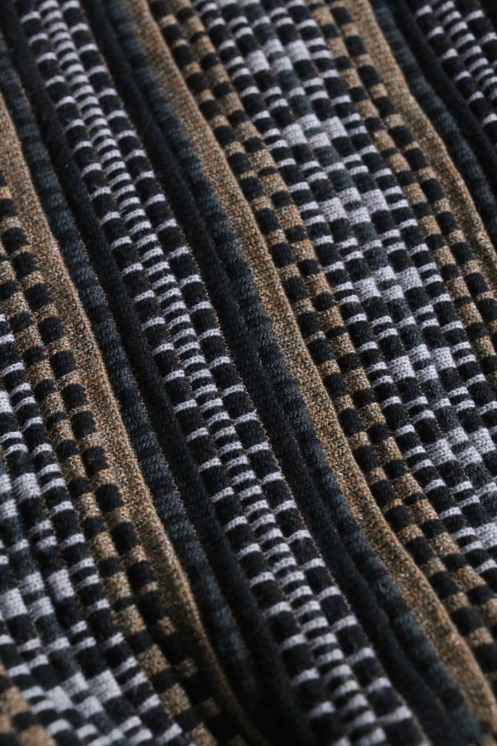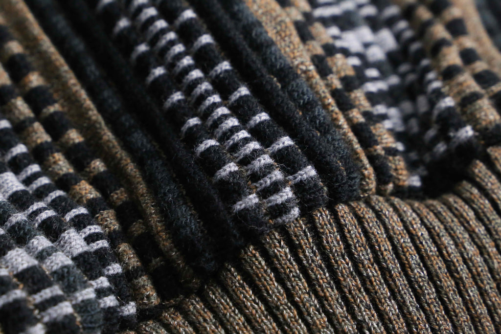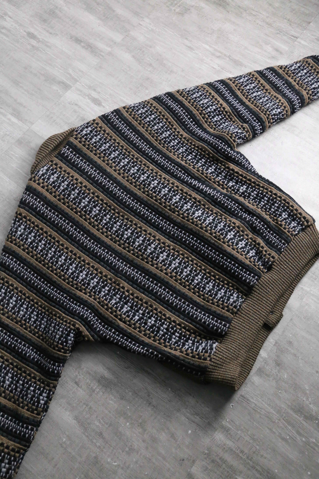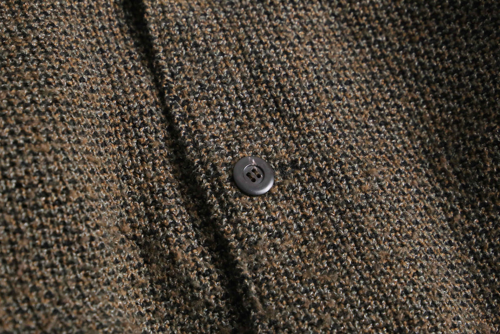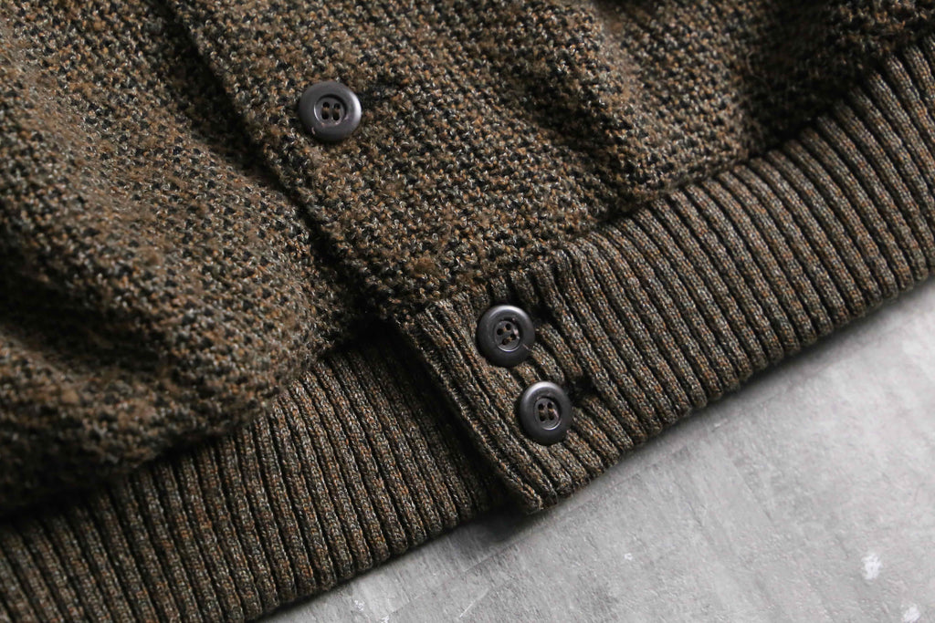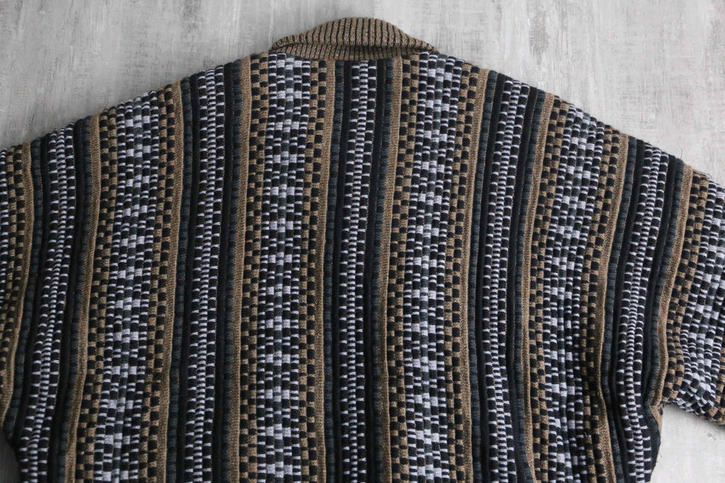 前身頃は茶系を基調とした複雑な色構成。一方で袖と後身頃は幾何学ストライプへ切り替えられた、少し遊びの効いたデザイン。フェイクながらポケット口にスエードを配している点も含め、どこかユーロライクな佇まいを感じられるのが個人的にかなり好みです。