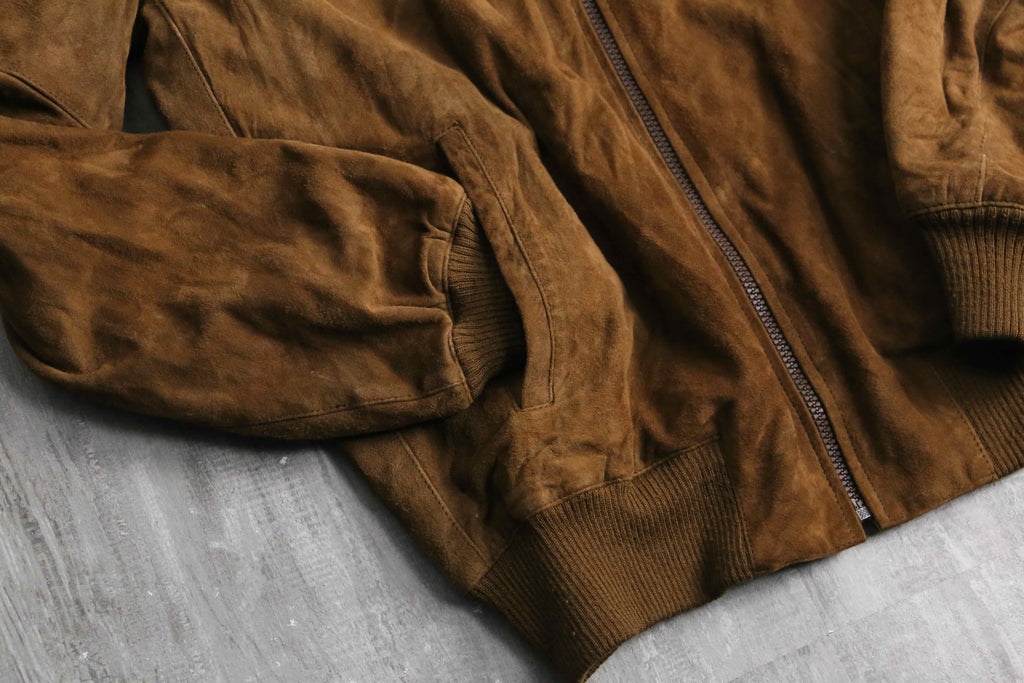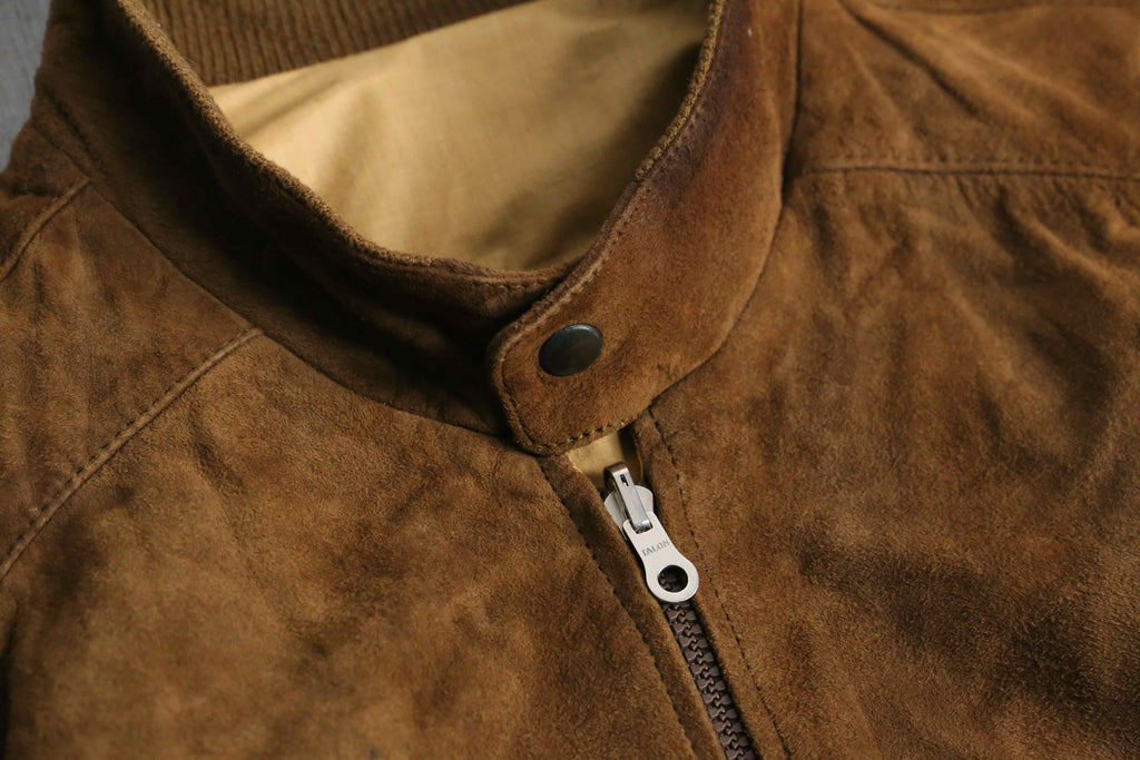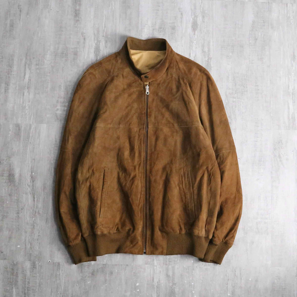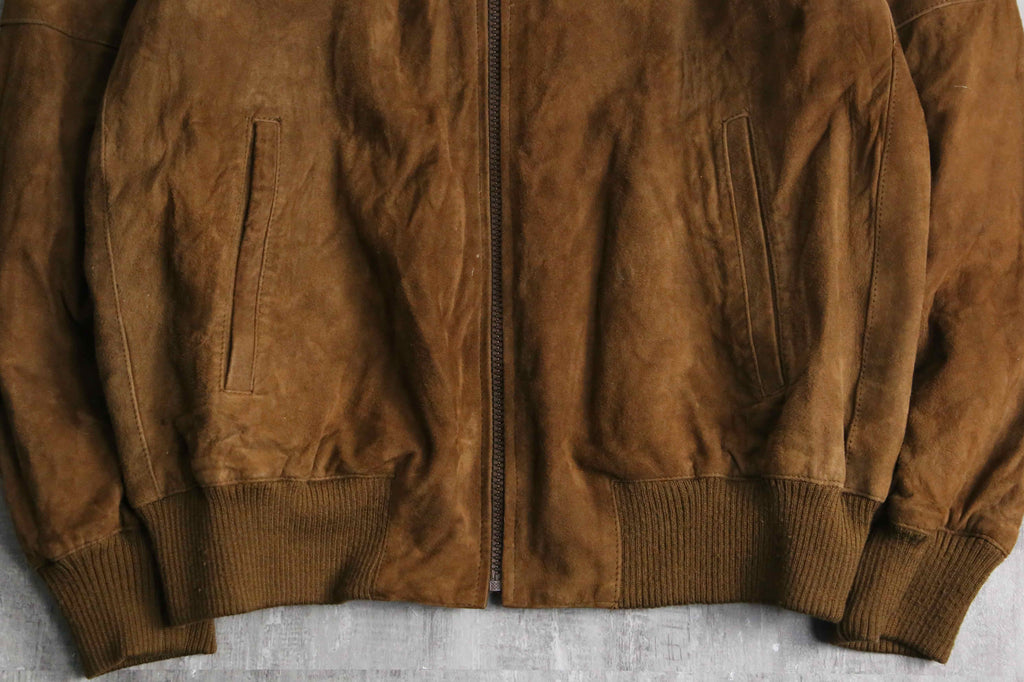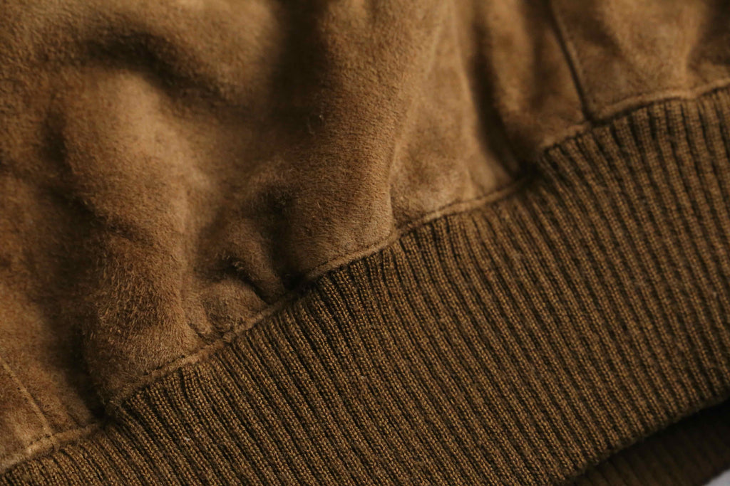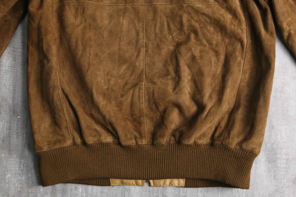 毛並みは縮みもなくコンディションはかなり良好。非常に柔らかな質感で、手に吸い付くようなしっとりとしたタッチから察するに、恐らく羊革のスエードでしょうか。着心地も良く、春にかけてのライトアウターとしては十二分な活躍が見込めそうです。個人的にスタンドカラーという点も、冷たい風を防いでくれるので好みですね。是非。