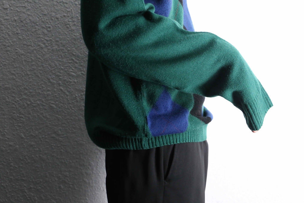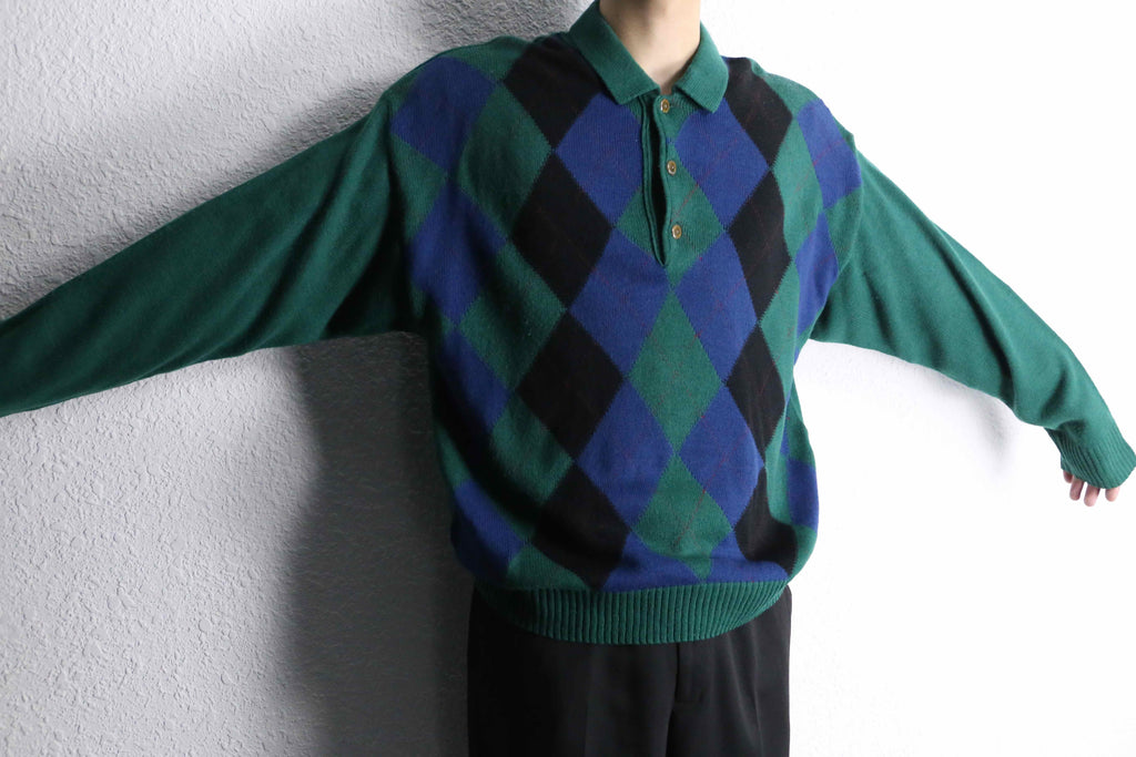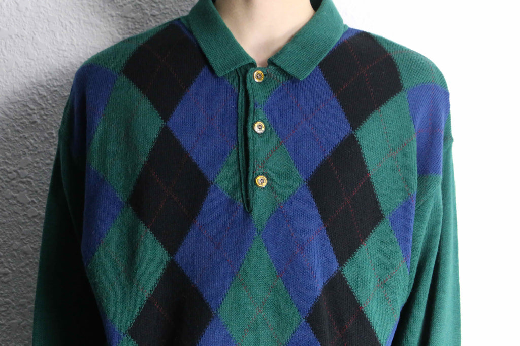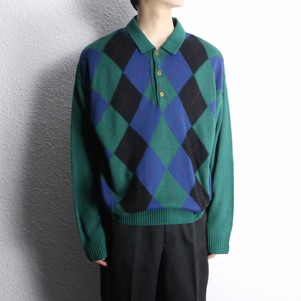 ・green argyle acryl knit polo sweater