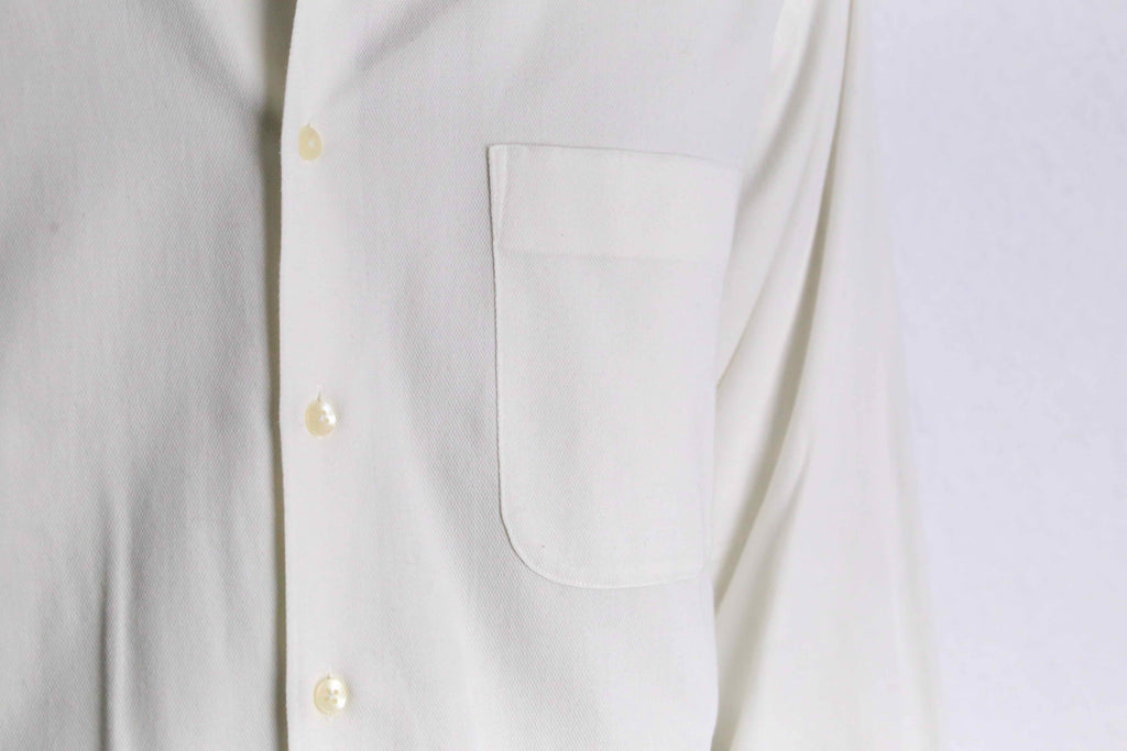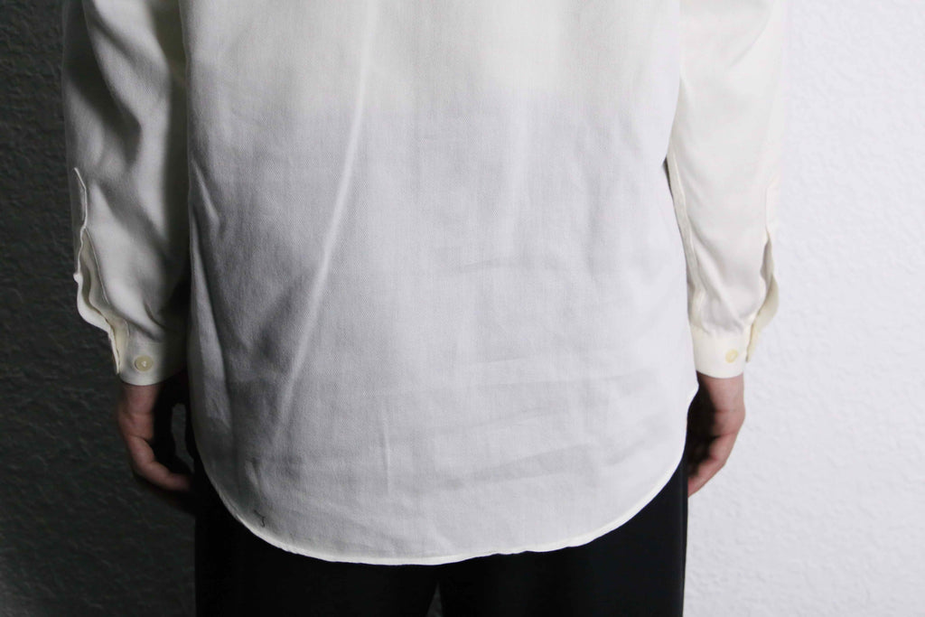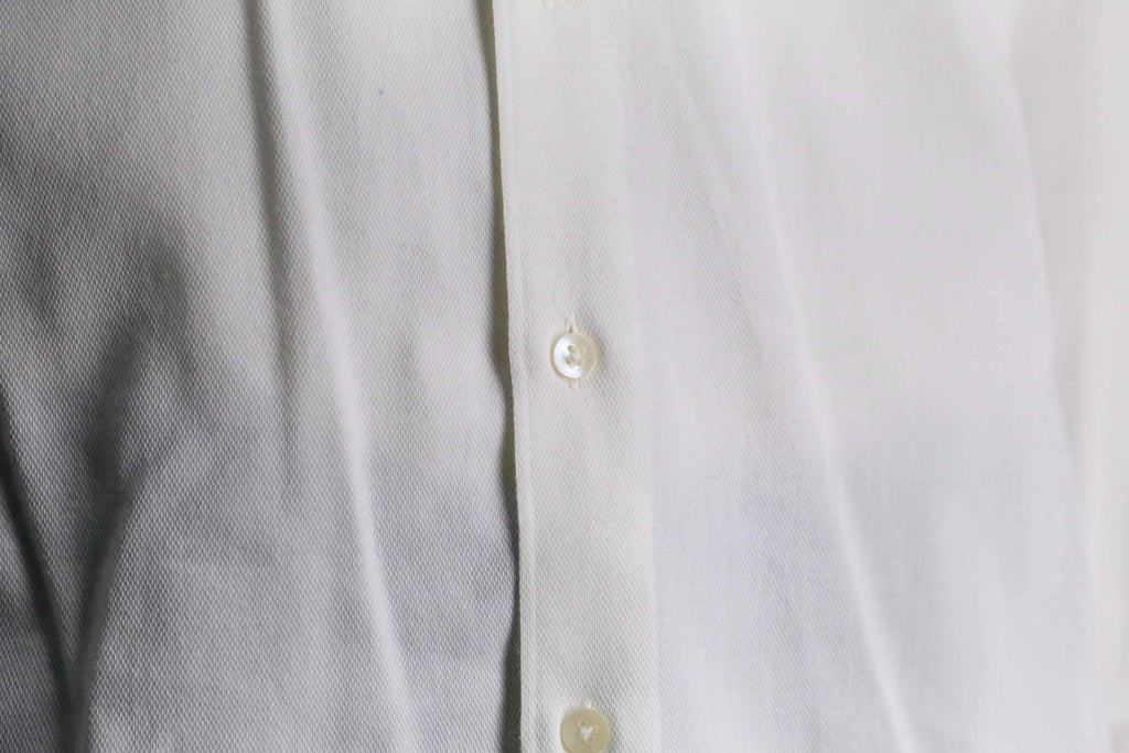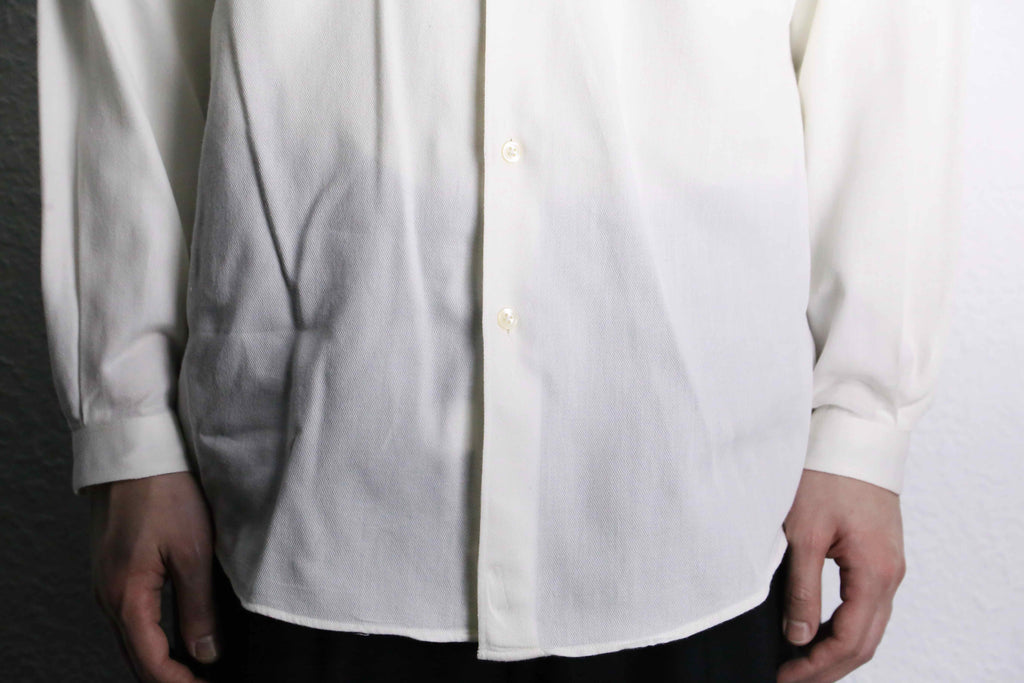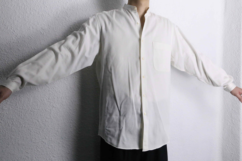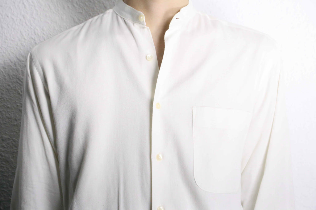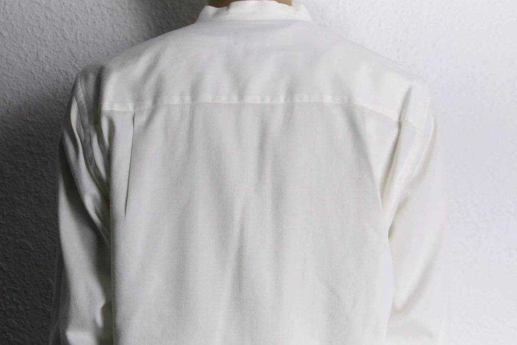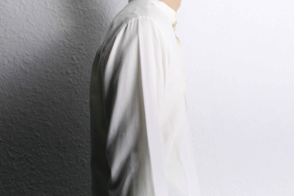 ミニマルな佇まいのカラーレスシャツ。襟を排し、光沢を抑えた柔らかなコットン生地により、抜け感のある落ち着いた印象に仕上がりです。同じ白単色でもドレスシャツと比べるとデニムパンツ等と合わせたカジュアルなスタイルにも馴染んでくれる一着です。