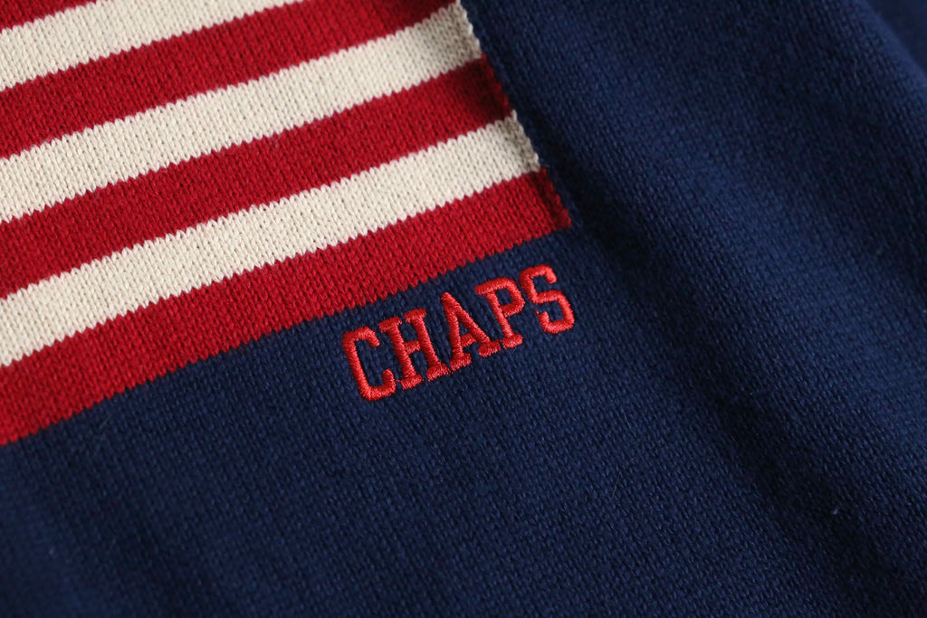 “CHAPS”より、フロントに星条旗モチーフをあしらったコットンニット。ネイビーボディをベースに、星条旗のグラフィックを大きく配置したアイコニックなデザイン。星部分と“CHAPS”のレタリングは刺繍で表現されており、立体感のある仕上がりが魅力です。