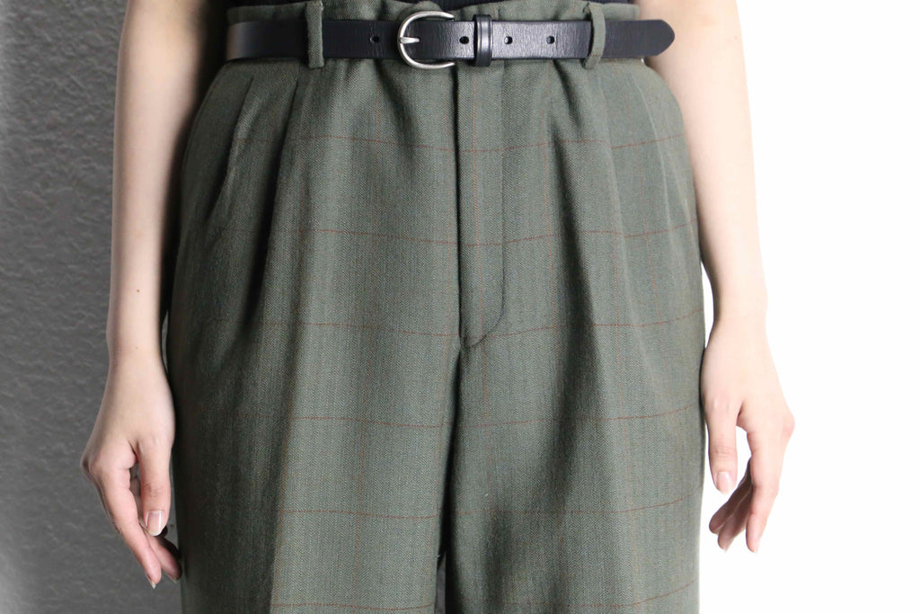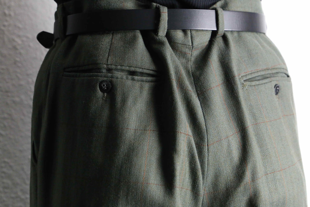 オリーブカラーをベースにしたチェック柄が上品かつどこか可愛らしさも感じるウールスラックス。落ち着いたトーンの中にうっすらと走るチェックが、主張しすぎずスタイリングに奥行きを加えてくれます。