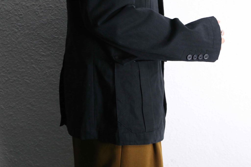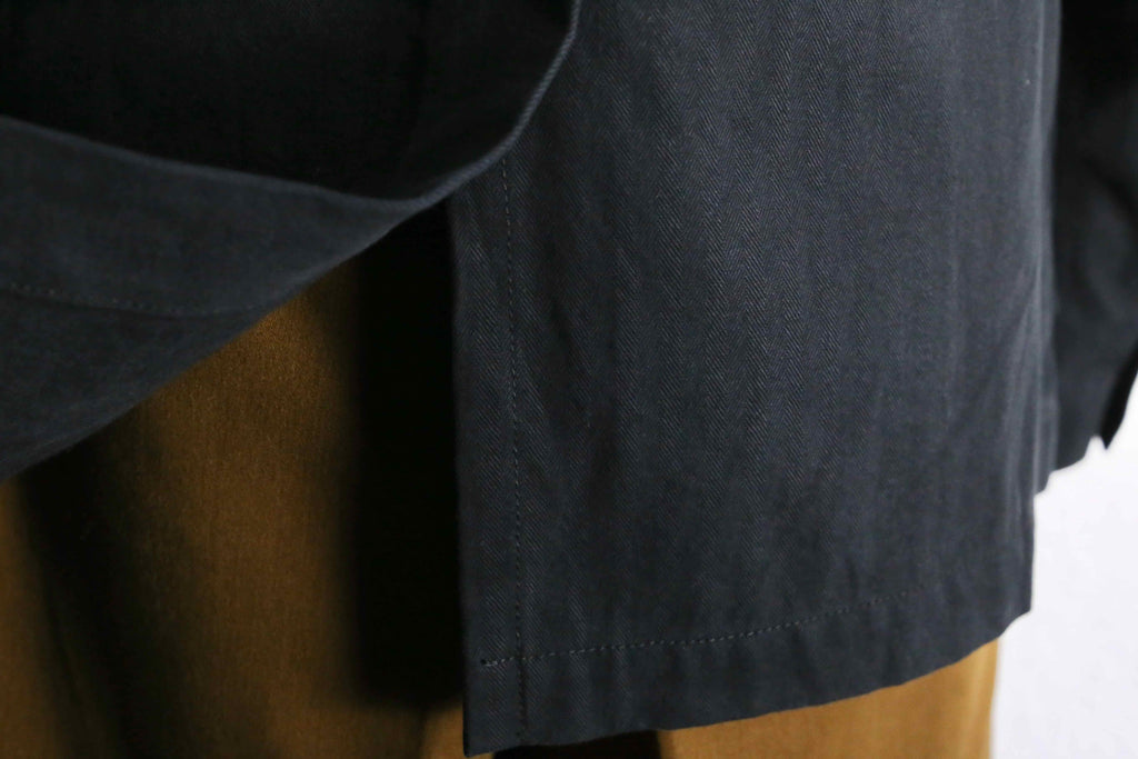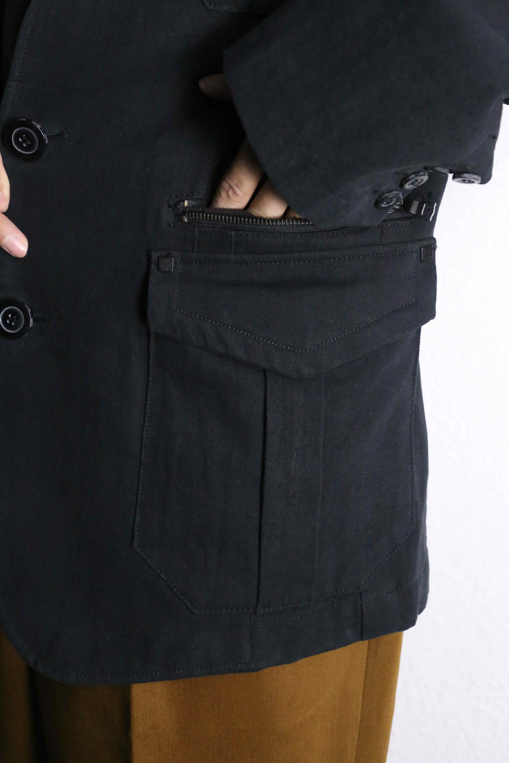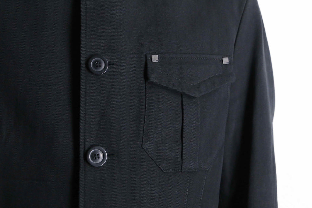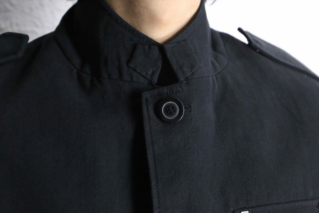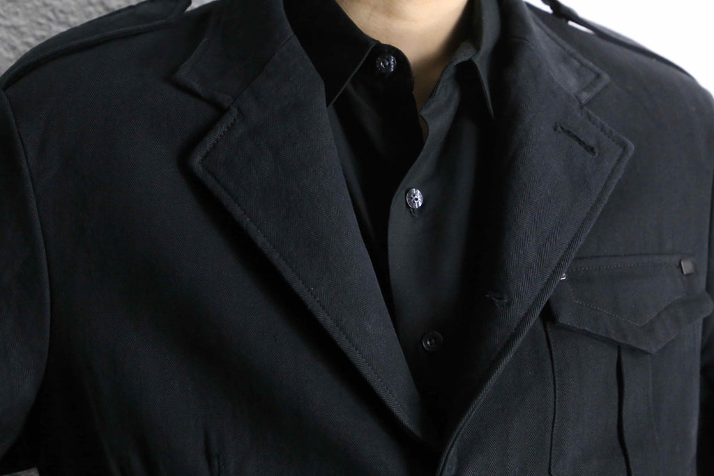 エポレット付き・3つのフラップポケット・コットンヘリンボーン生地…でありながらベースはテーラードジャケット型。ミリタリー要素の無骨さとジャケットの上品さを合わせ持つ一着です。