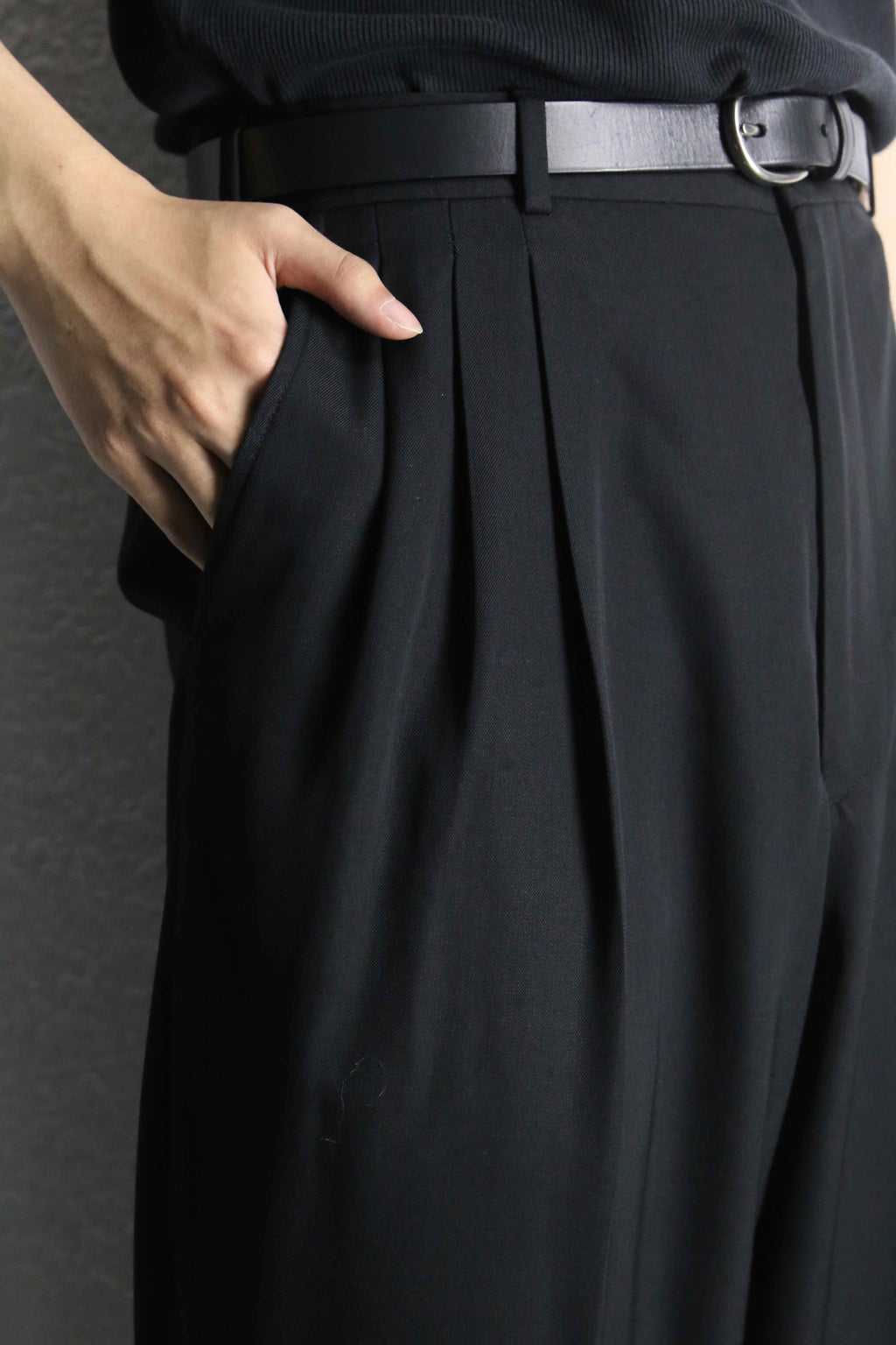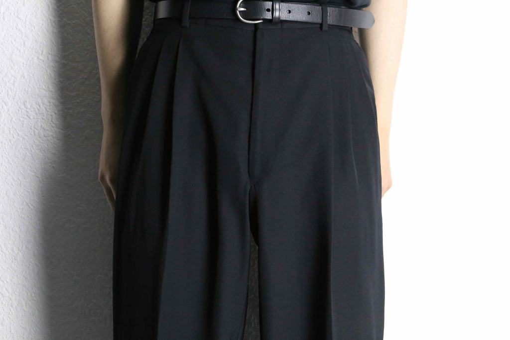 ポリエステル65% × ウール35%の混紡生地になっており、程よいハリと落ち感を両立。ドレープが綺麗に出るため、動きに合わせてシルエットが自然に揺れ、上品な空気感を纏います。フロントには3タックが入り、腰回りにはゆとりを持たせつつ、裾にかけて緩やかなテーパード。野暮ったさを感じさせない、計算されたワイドシルエットが魅力。