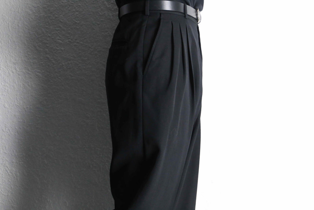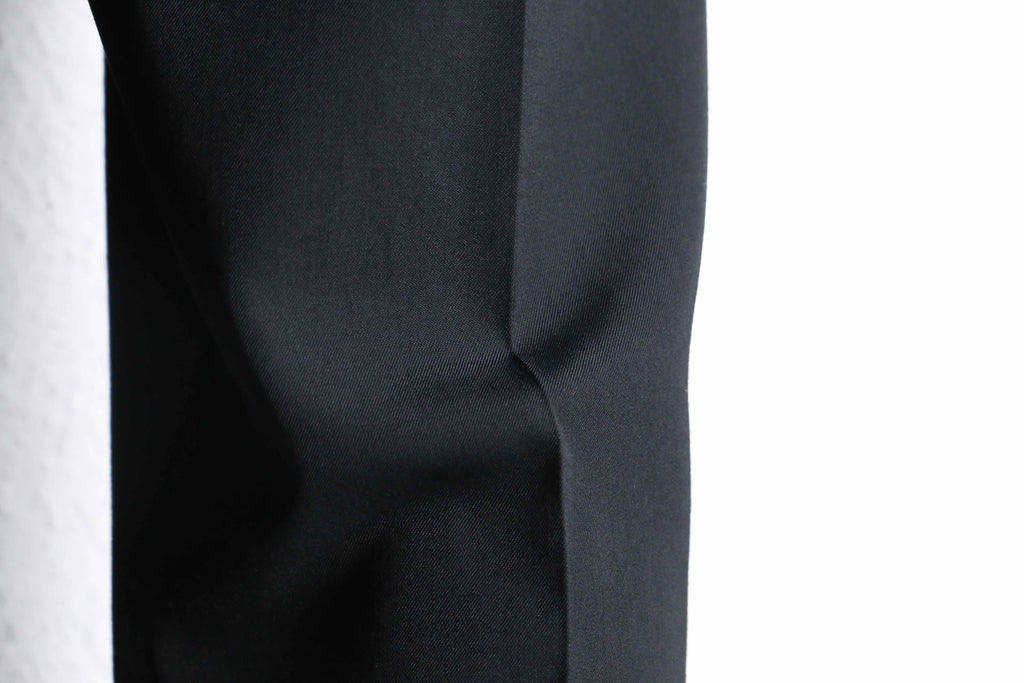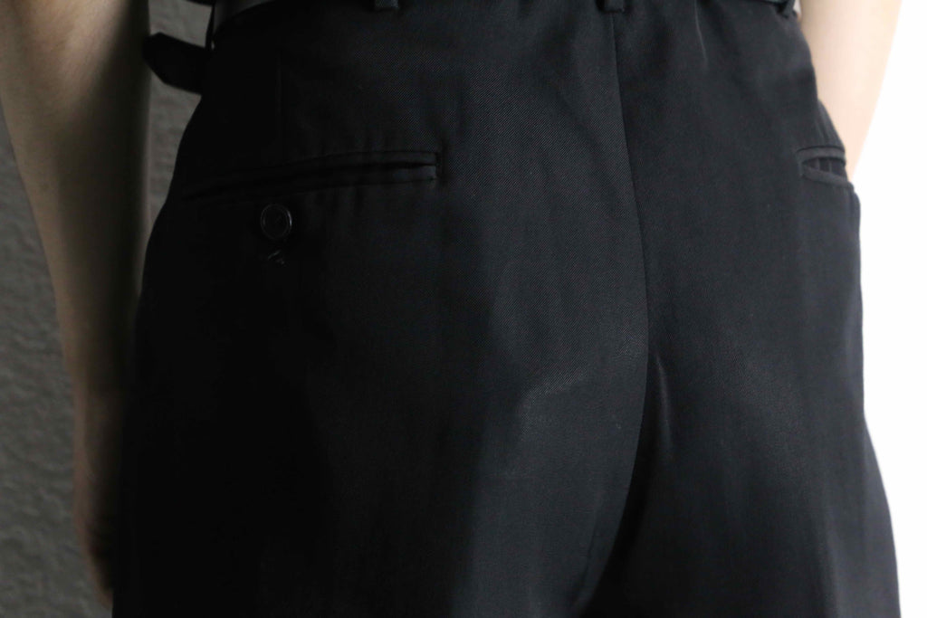 シンプルなブラックアイテムながら、素材とパターンで魅せる一本。シャツやニットはもちろん、当店らしいジャケットと合わせたモードなスタイリングにもハマる、汎用性の高い仕上がりかと。是非。