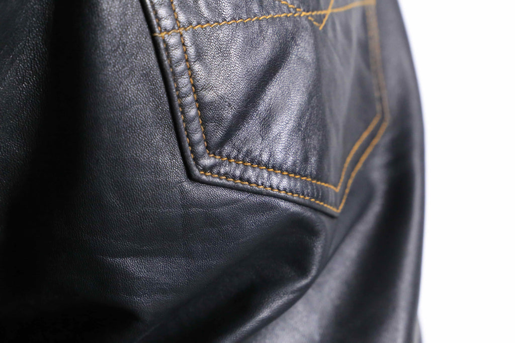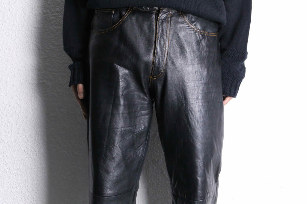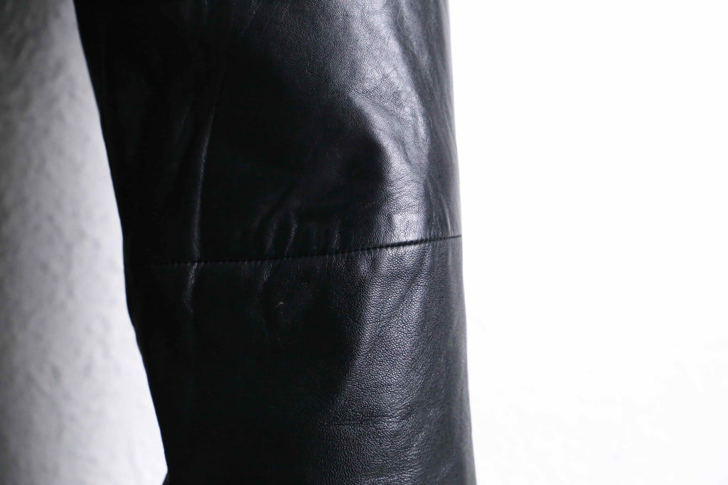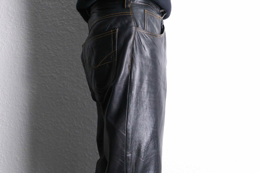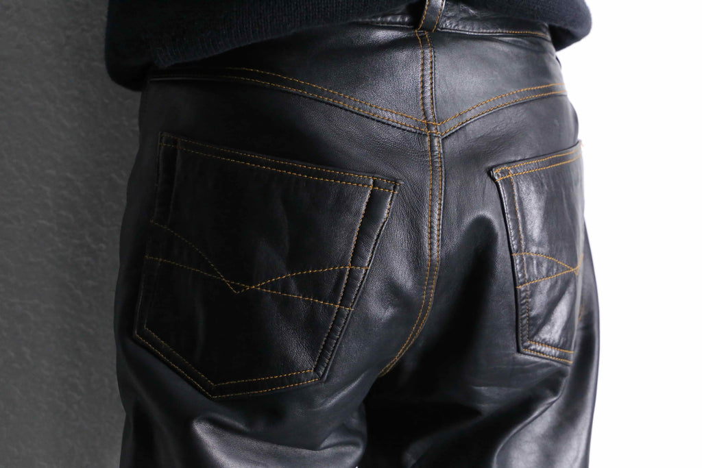キメが少しばかりか荒く、そして薄く、柔らかい事により推定シープスキンによるレザーパンツが入荷です。