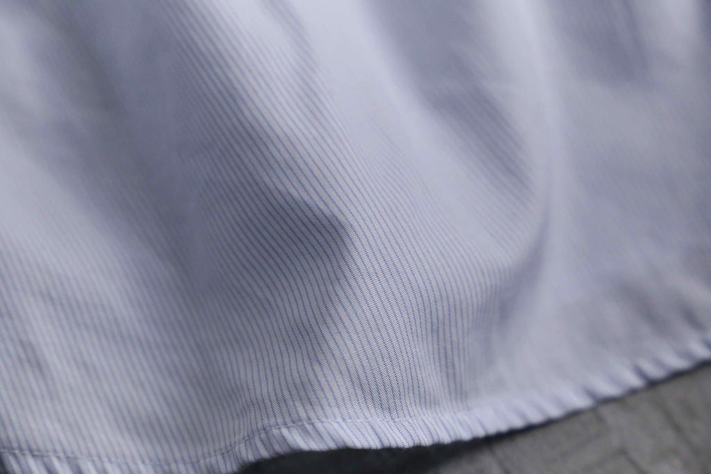 コットン100%のハリがある平織りに加えピッチの細いストライプと所謂高品質な1着。普段着としての役回りとしてはもちろんこれから増えるであろう、成人式などの晴れ舞台のインナーとしてもおすすめです。ぜひ。