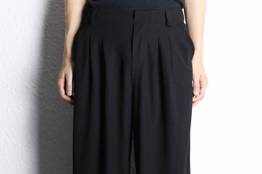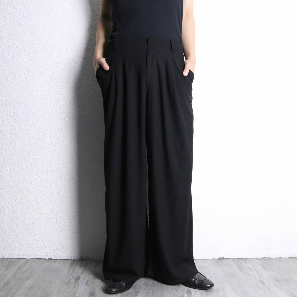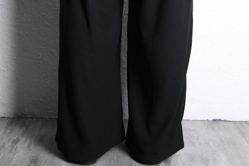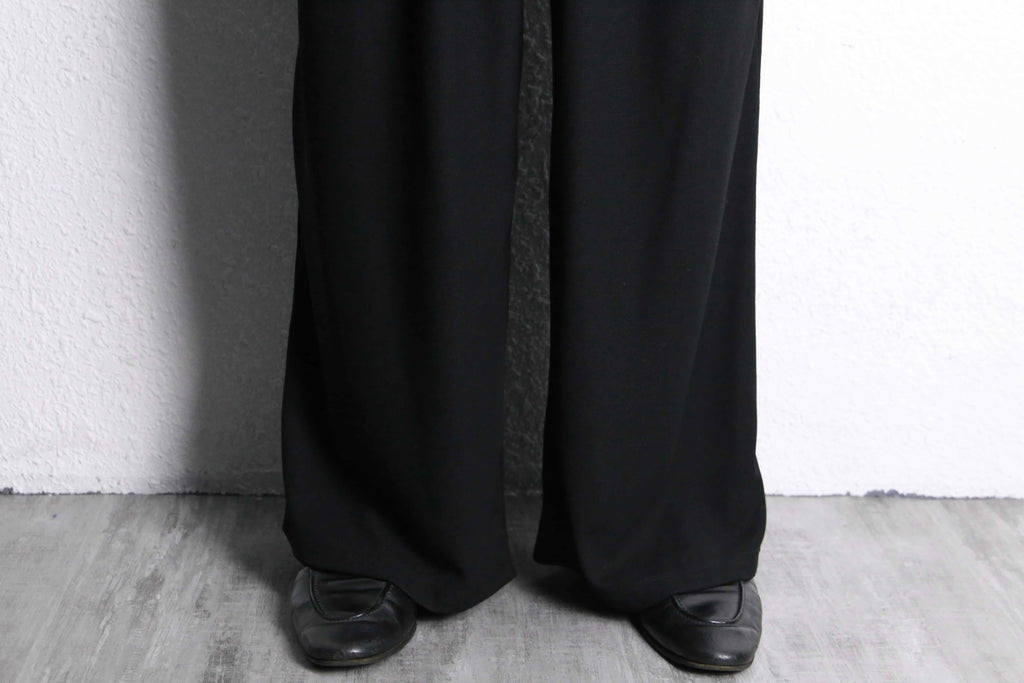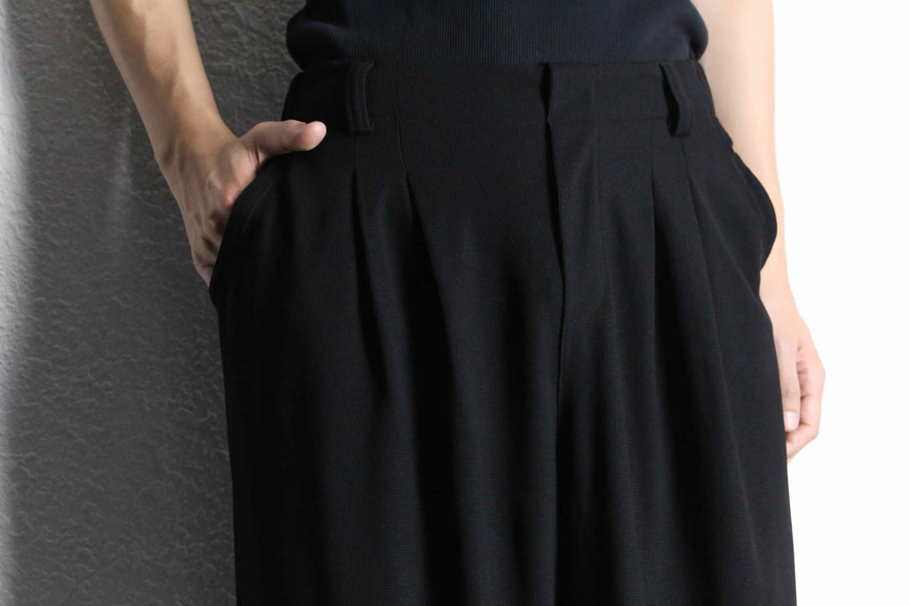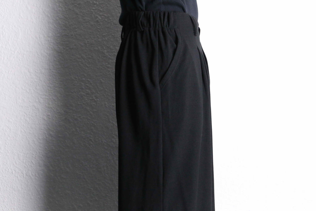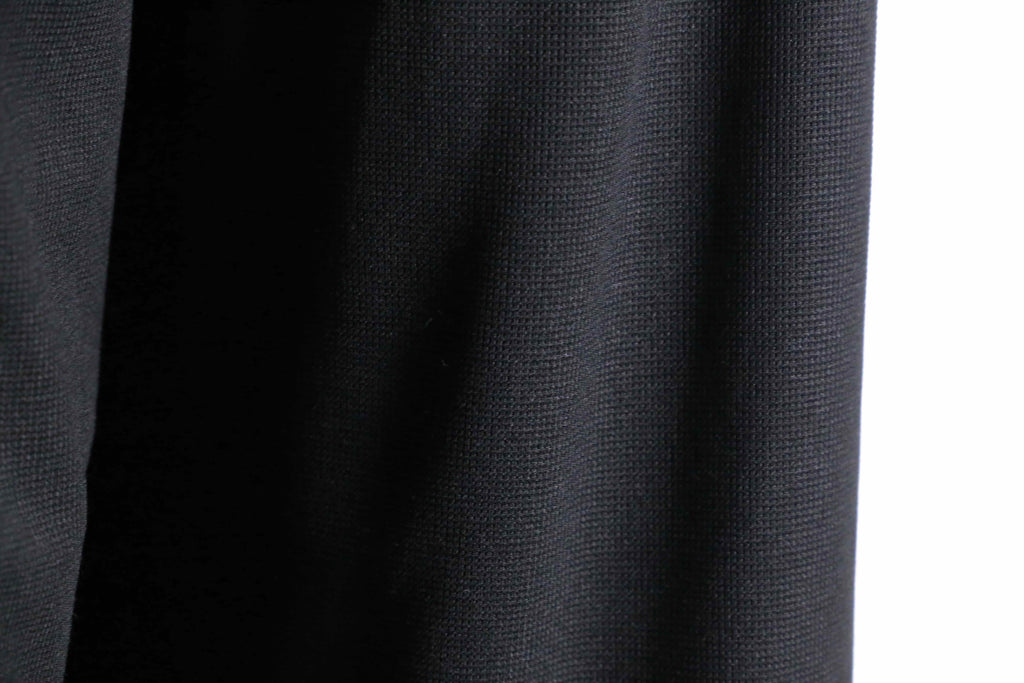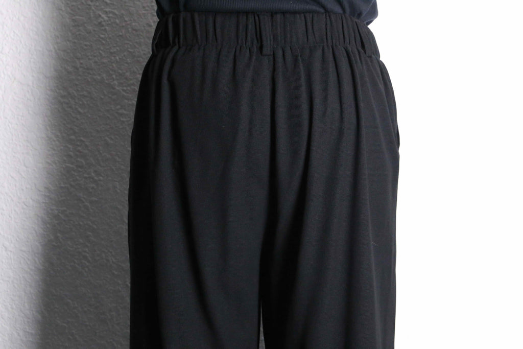 総丈100cm以上とかなり長めのレングスに、テロンと落ち感がありながらもワッフル生地により微量ながらも重厚感がありパンツとしてはかなり秀逸な1着。イージータイプなので着脱がしやすく、ストレートのストンと落ちるシルエットはかなり良いものかと。ポリエステルを多く含む素材ならではの肌触りと見た目の良さがドレープ感を演出する魅力的なアイテム。この機会に是非、お試しください。