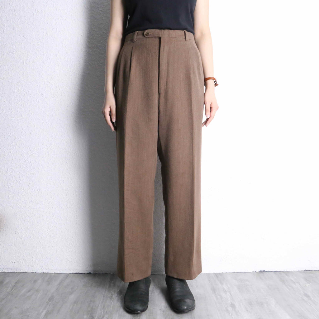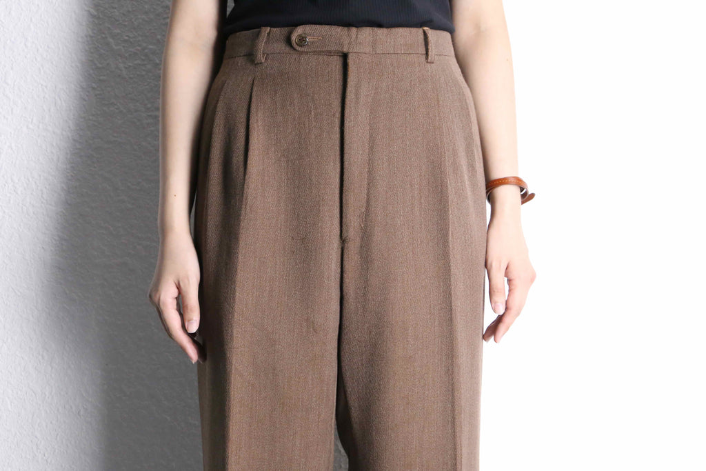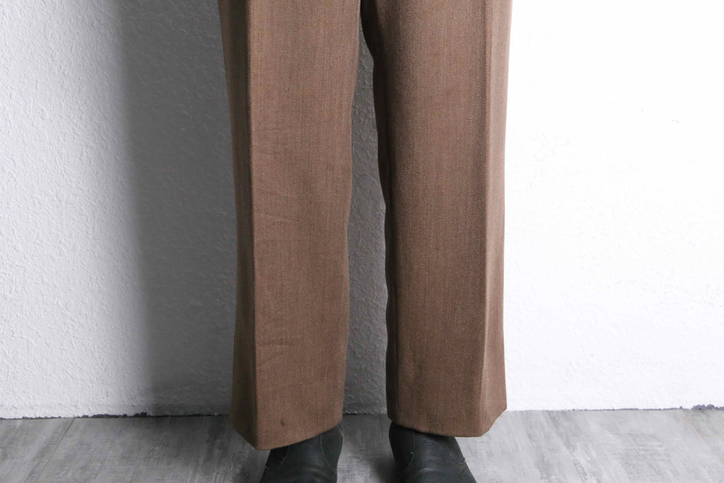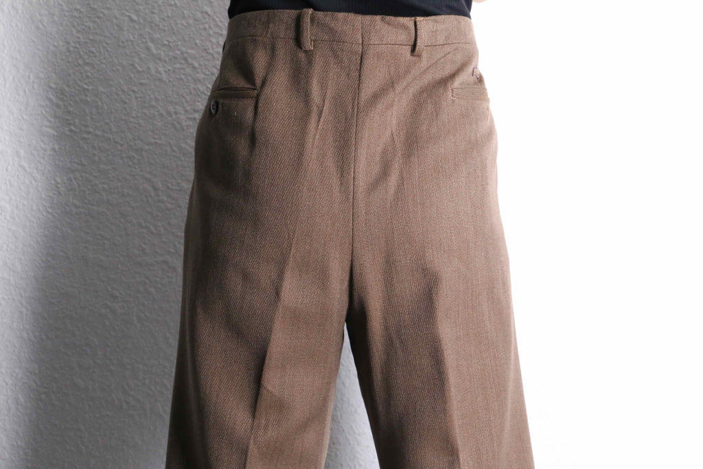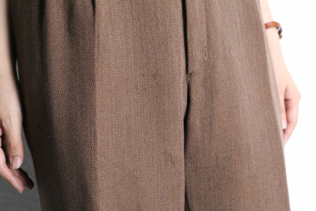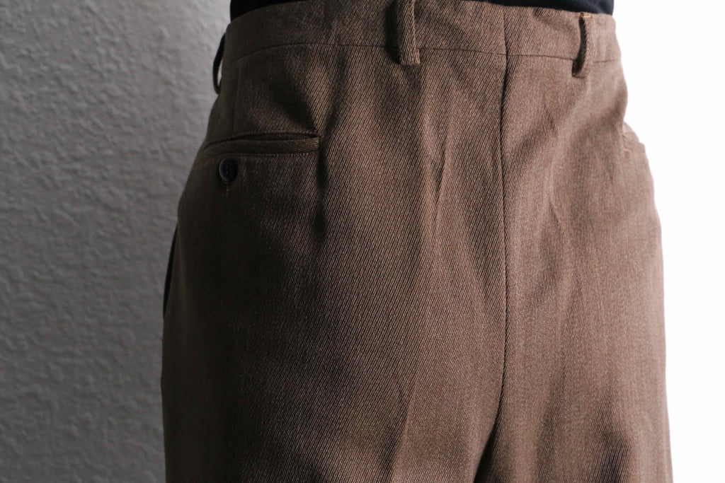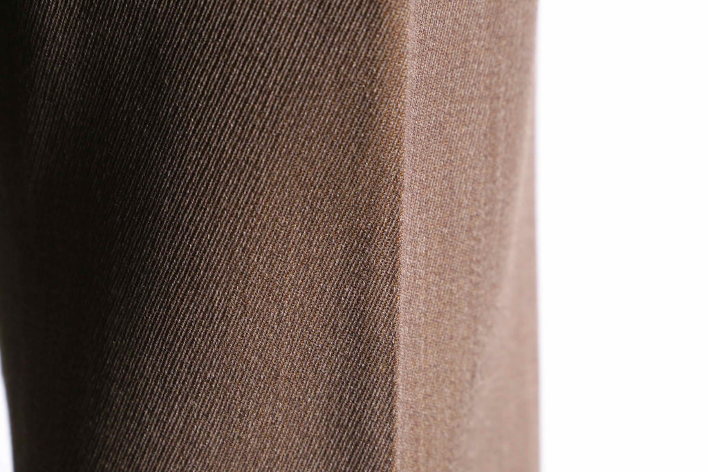 全体的に茶色気がかった色合いながらも、綾織に色糸が混ざり、奥行きのある杢色に。綾織らしい鈍い光沢がほんのり上品さを出しています。170cm付近であればちょうど良く履けそうです。ぜひ。